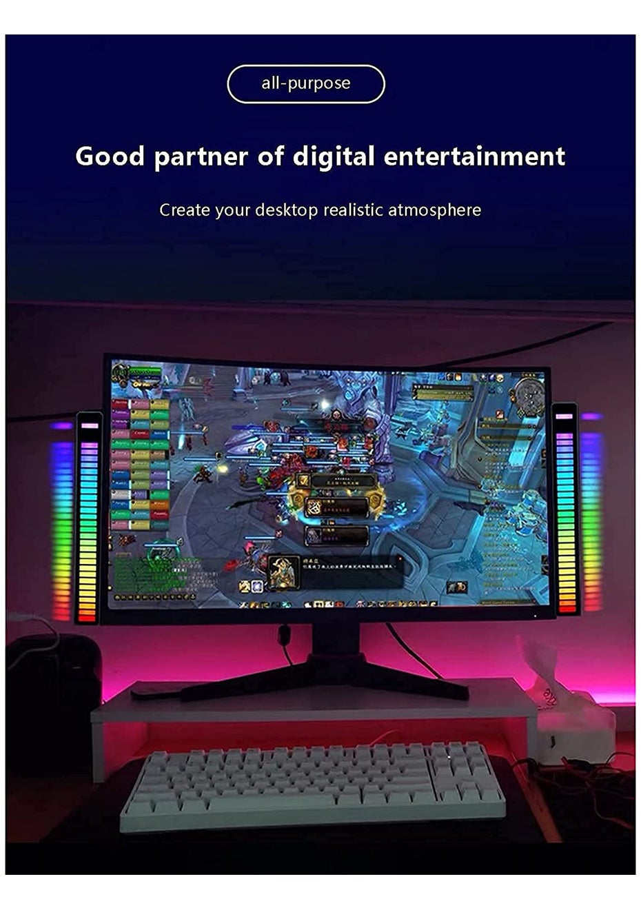 With 32 colorful LED lamp beads, highly sensitive microphone and noise cancellation function, atmosphere light can realize dynamic expression of music and human voice.