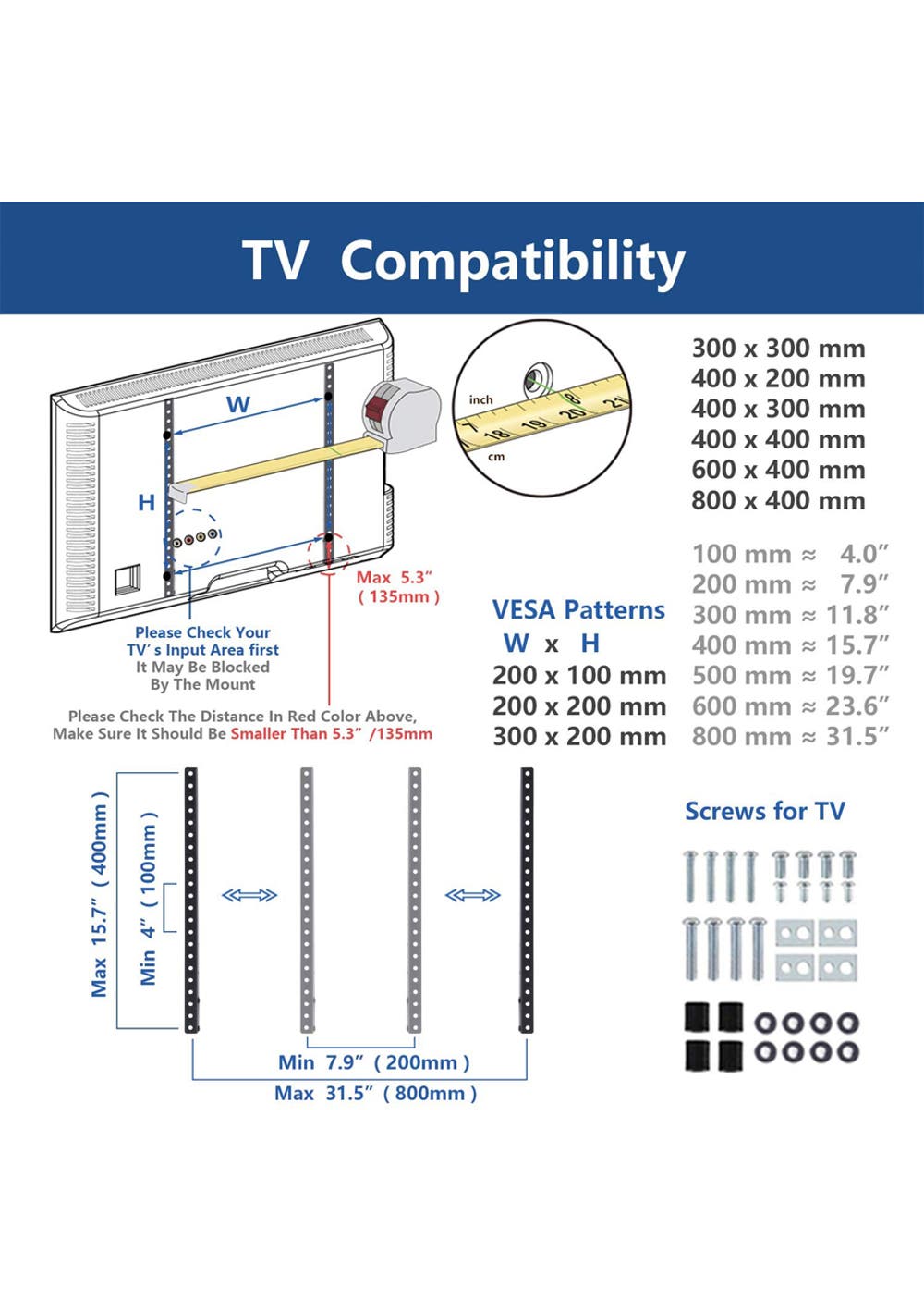 With VESA mounting hole patterns up between 200x100mm and 800mm x 400mm. Please check hole pitches at back of your display before purchasing.