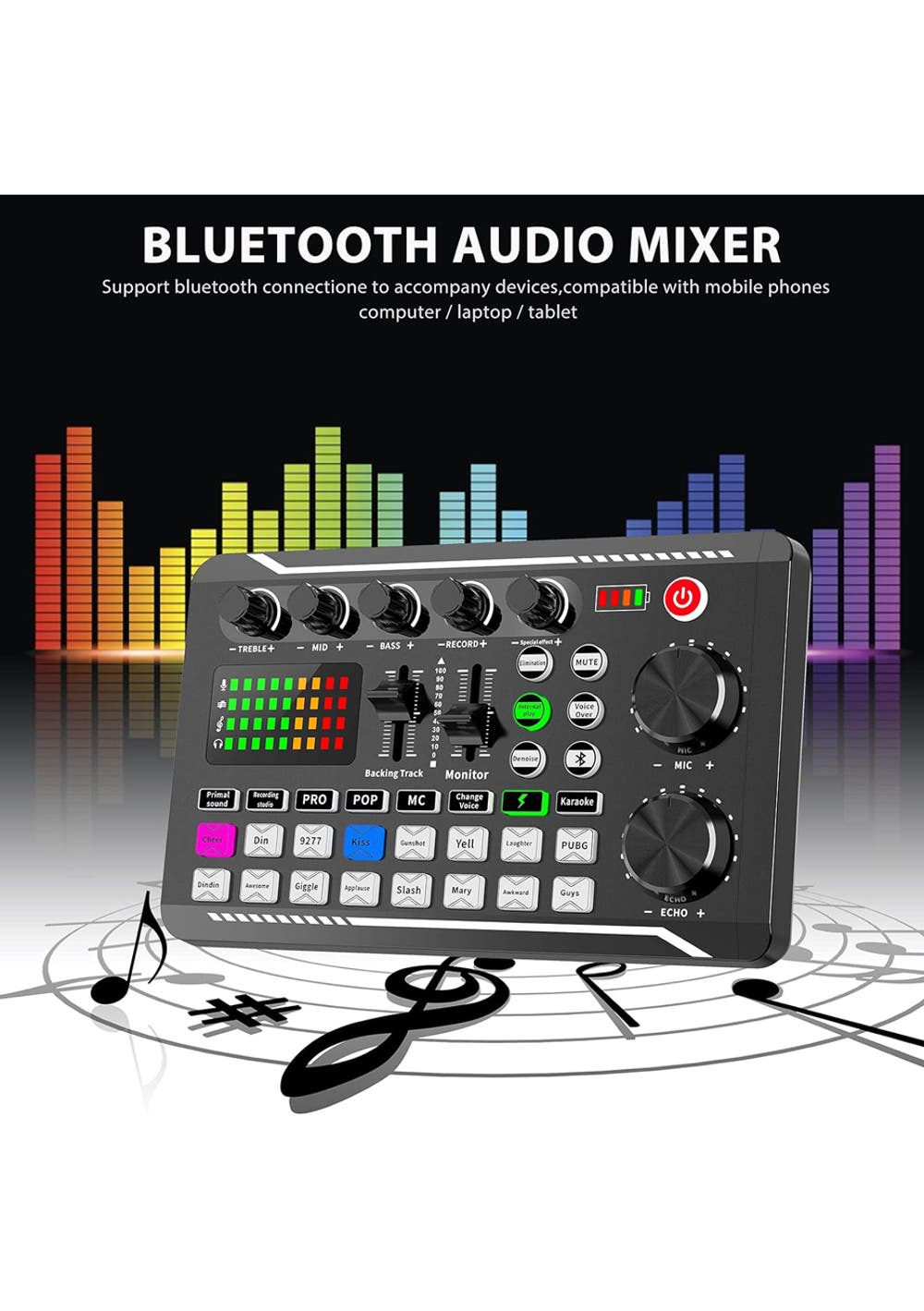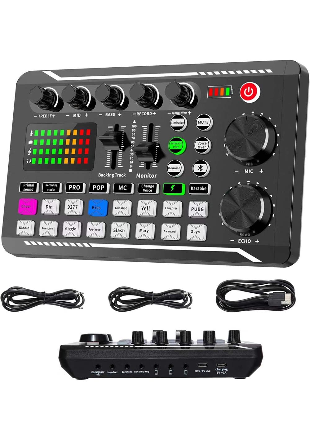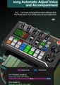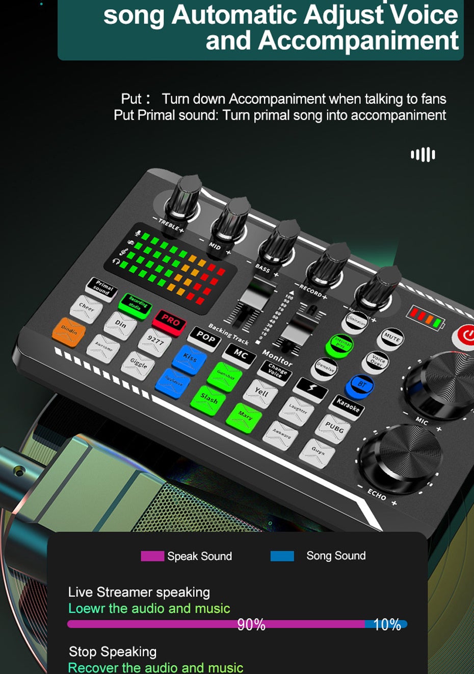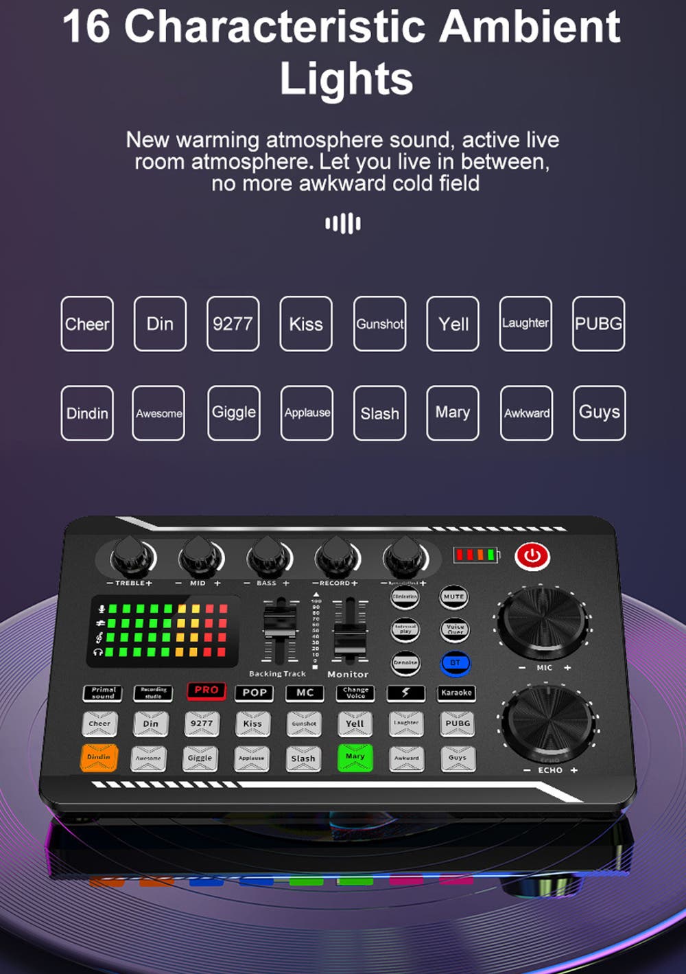Professional F988 Sound Card: The newest F988 Live Sound Card features imported DSP dual chip technology, Bluetooth wireless accompaniment, double thruster precise adjustment, and advanced intelligent light control. The console lights beat according to the music, enhancing your concert's excitement.