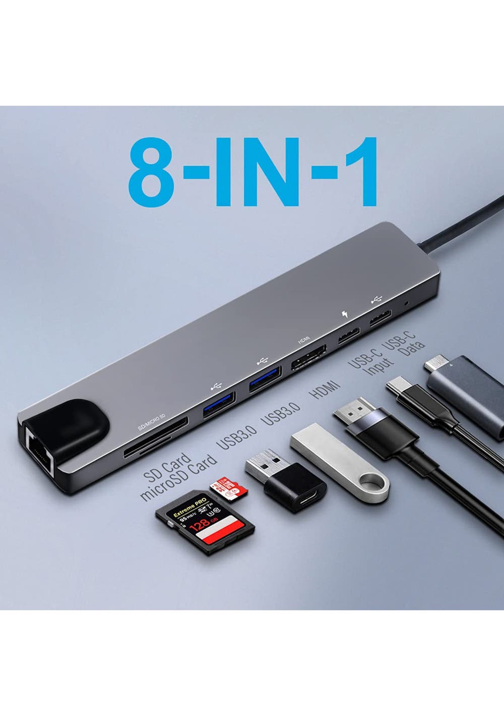 Upgraded 8 Ports USB C Hub Multiport Adapter with USB Type-C To USB3.0HUB + USB-C PD charging + HDMI 4K(30Hz)+SD/TF Card Reader, data transmission and computer and mobile phone device charging,