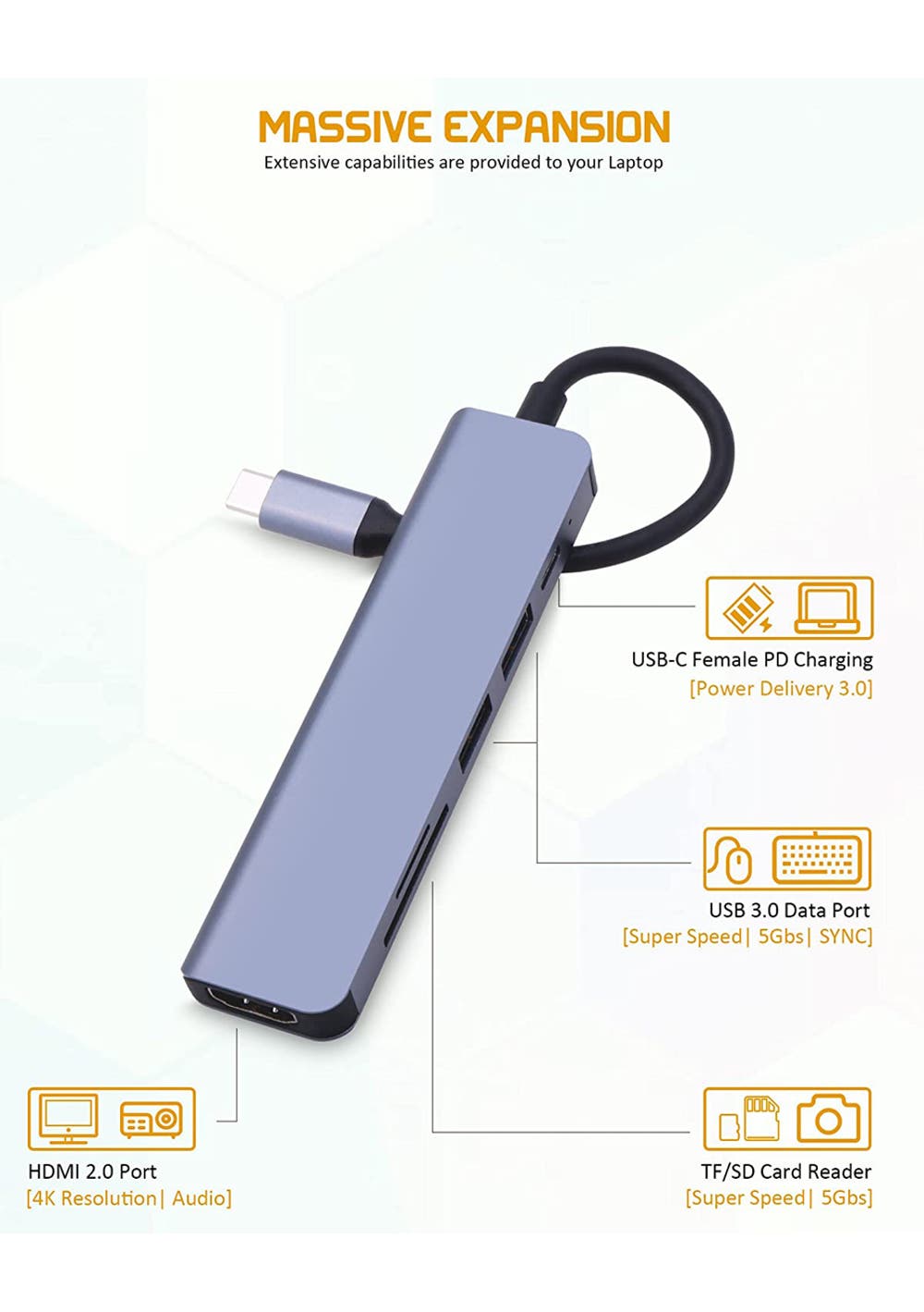 Multiport USB Hub – GREEN ROBO BROS 6 Port USB Extension Hub includes 1 USB Type-C Female PD Charging port, 1 HDMI 4K(30Hz) output port, 1 TF SD card slot, 1 SD card slot, 2 USB 3. 0 Type A ports