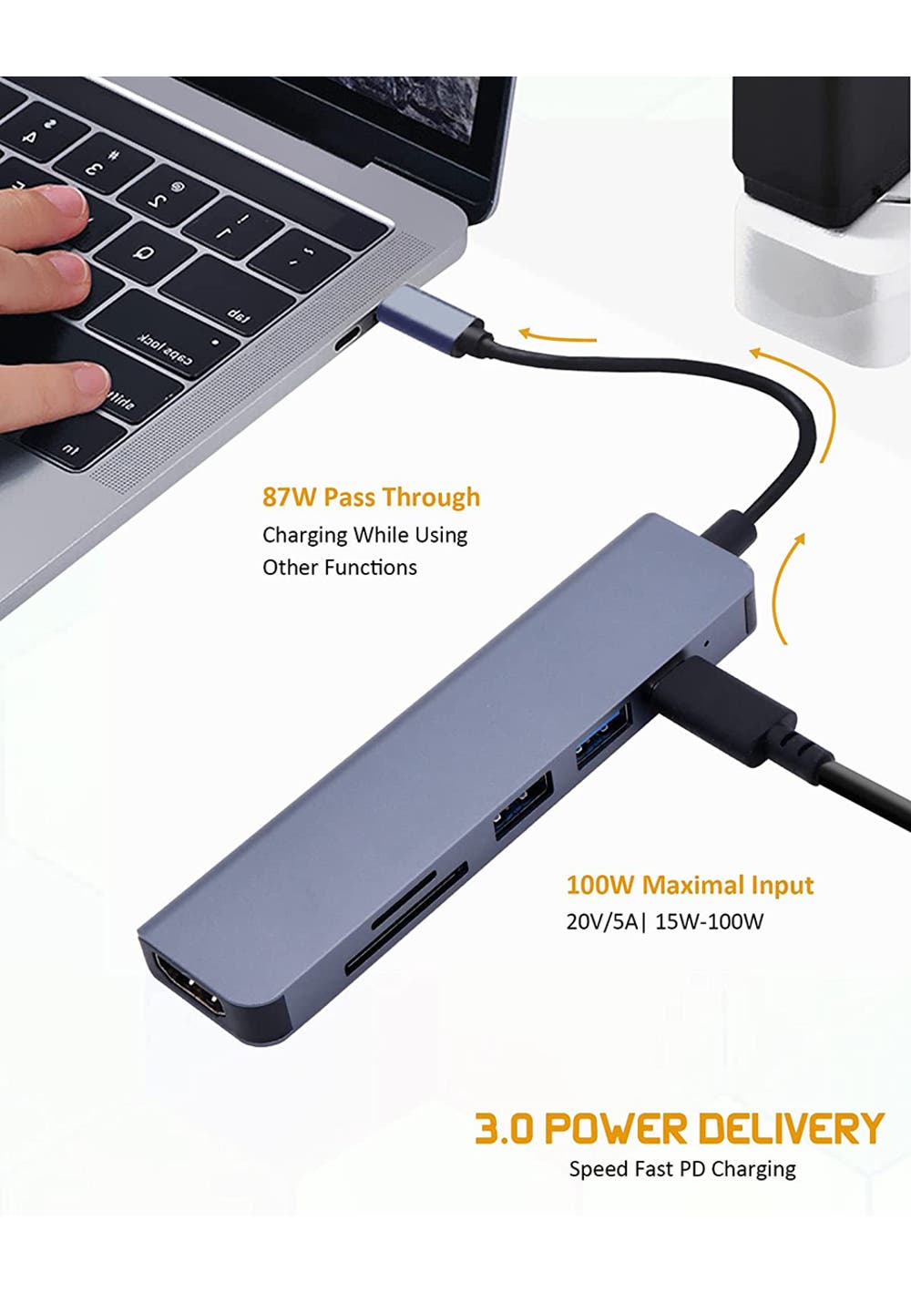100W Input Fast PD Charging & Max 87W Output allows to charging your device while transferring & expander function, providing a USB-C pass through Female port by which you could securely charge connected MacBook