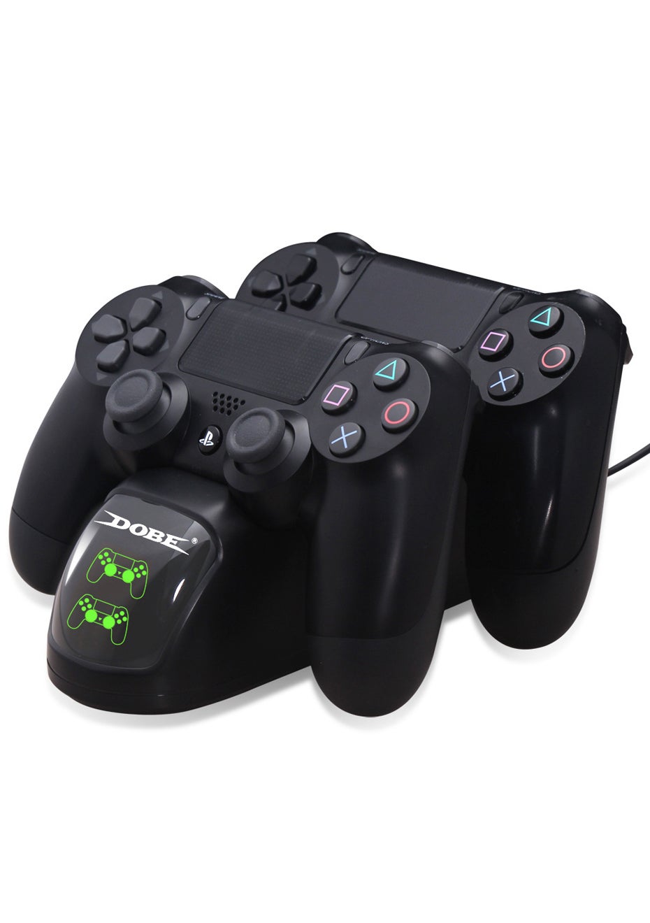 Features  Fast PS4 charger double Dual shock 4 PS4/ PS4 Slim/ PS4 Pro controllers simultaneously. Save your time and get more fun  LED lights clearly indicate in front of screen when charging is complete; green light States The PS4 controller has been charged completed, Red light States The PS4 controller is charging  Power through the USB port from either the PS4/ PS4 Slim/ PS4 Pro console, PC or wall power source (wall adapter is not included)  This PS4 controller charger stand with built-in Micro USB adapter ports, allows you to securely store and charge up two PS4 controllers simultaneously without having to connect them to the PS4 system Package Includes  1 x USB PS4 Controller Charging Dock  1*USB Cable Material: ABS Product dimensions (LWH): 170×55×55mm Weight: 210g