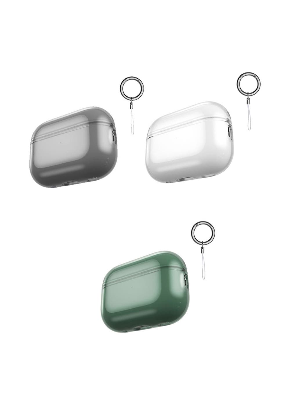 3Pcs Clear AirPods Pro compatible Case Cover with Lanyard with Green<br>Material: TPU, Metal<br>Product dimensions (LWH): each case 6x5x2.5cm <br>Package dimensions (LWH): 15x10x3 cm<br>Colour Clear Grey Green<br>Weight: 65g<br>Feature<br>【Clear Case for AirPods Pro 2】The clear case cover is perfectly designed for Apple AirPods Pro 2nd Generation Charging Case 2022 Release. Two pieces separated design makes it pretty easy to install and remove the air pods pro 2 protective cover.<br>【Upgraded TPU Material】This clear AirPods pro 2 case covers are made of high quality premium TPU material, which protect your AirPods pro 2nd gen case from most of the daily drops,scratches and bumps without adding any bulk.<br>【Front LED Visible】Precise cutout offers a free access to the charging port to charge your AirPods Pro 2 case without removing the protective case cover. The front LED indicator is visible while charging.<br>【Portable Lanyard Added】Crystal clear appearance keeps the original beauty of Apple AirPods Pro 2 Charging case. Compact and lightweight design with lanyard makes it easy to carry your air pods pro 2 case anywhere.<br>Package Include<br>3 x Clear Case, <br>3 x keychain<br>