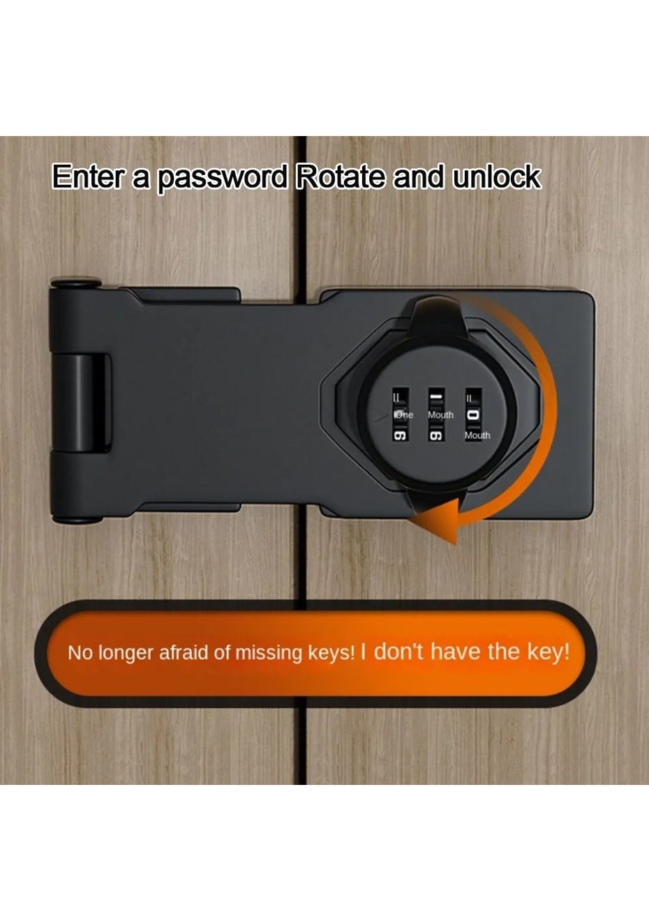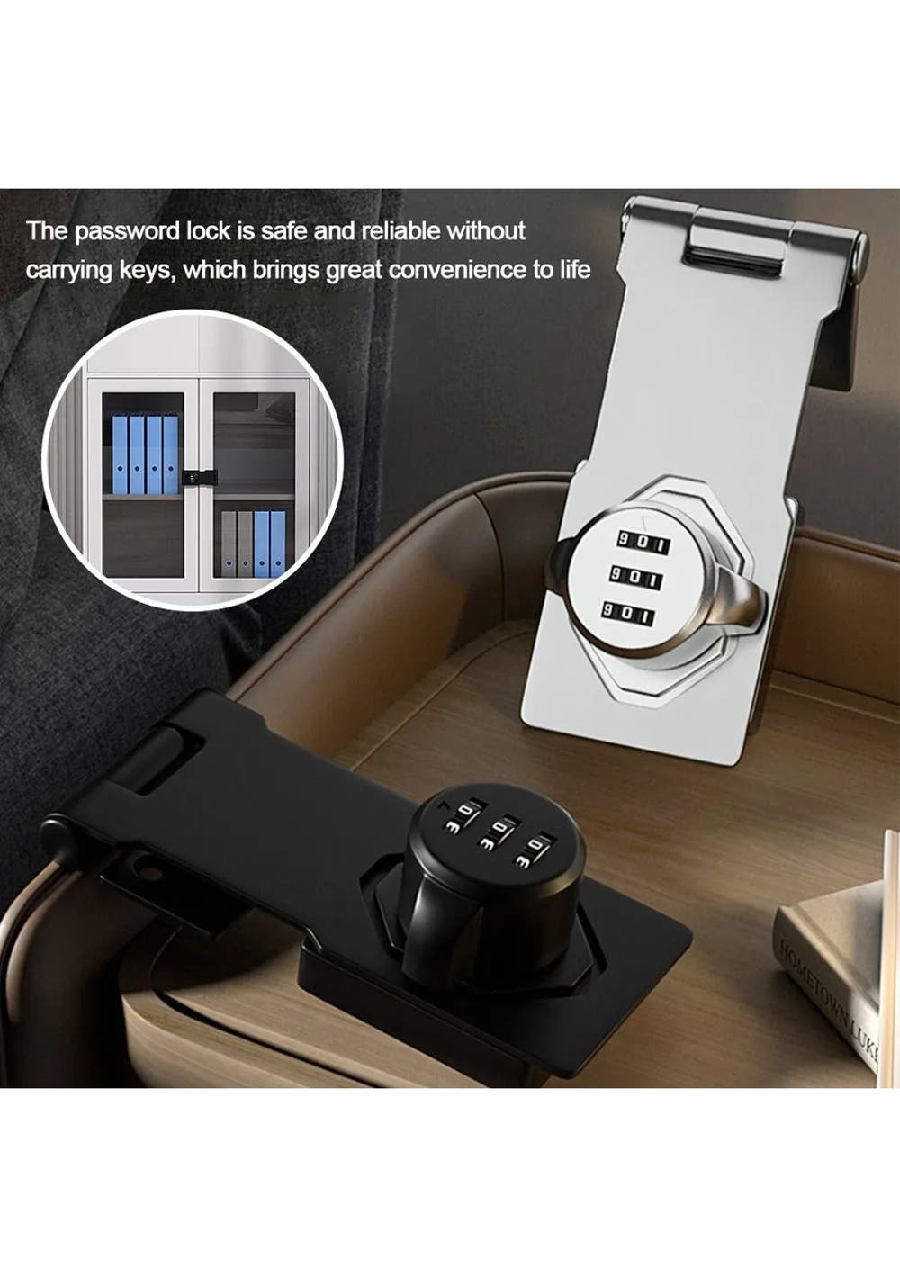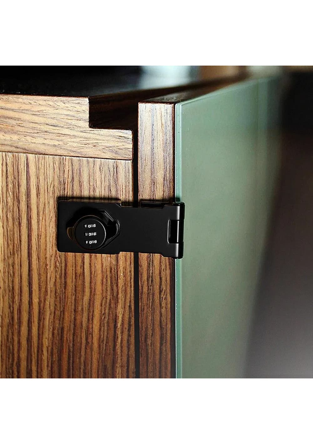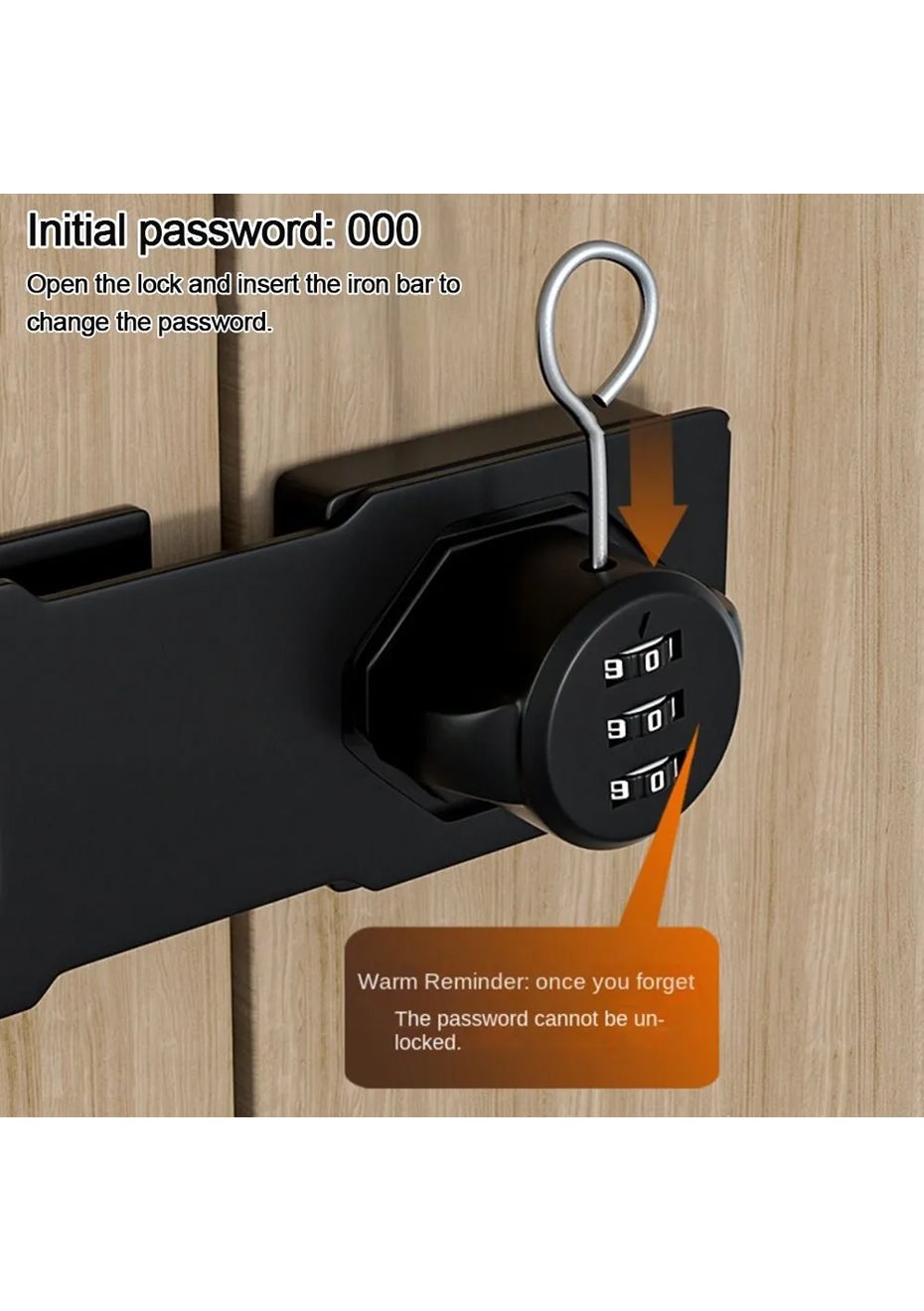 Keyless Anti-Theft Household Cabinet Password Hasp Lock<br>Product Description Revision:<br>Introducing our keyless anti-theft cabinet password hasp lock, providing a worry-free solution to your home's security. This lock is versatile and can be easily installed in various doors or cabinets around your house.<br>Key Features:<br>• Material: Steel<br>• Product Dimensions (LWH): 11×4.6×2.6cm<br>• Package Dimensions (LWH): 17x7.5x4cm<br>• Weight: 285g<br>• Keyless Security with Password Setting: Eliminate the worry of losing keys with our keyless security system. The initial password is set to '000' and can be easily changed or modified while the lock is in the unlocked state.<br>• Multi-Function: Ideal for various doors including wooden gates, shed doors, barn doors, garden gates, and cabinets. Also suitable for securing drawers, gun vaults, mailboxes, safe boxes, and office file cabinets.<br>• Durable and Rust-Resistant: The lock features 3 pick-proof chrome-plated dials and is constructed from sturdy zinc alloy to ensure it won't rust or wear over time.<br>• Easy to Install: The lock can be quickly and easily screwed to your cabinet with no complicated installation steps or settings. Suitable for both left or right installation and can be installed at 90° or 180° angles.<br><br>Package Includes:<br>• 1 * Cabinet Password Hasp Lock<br>• 1 * Screw Set<br>• 1 * Glue<br>