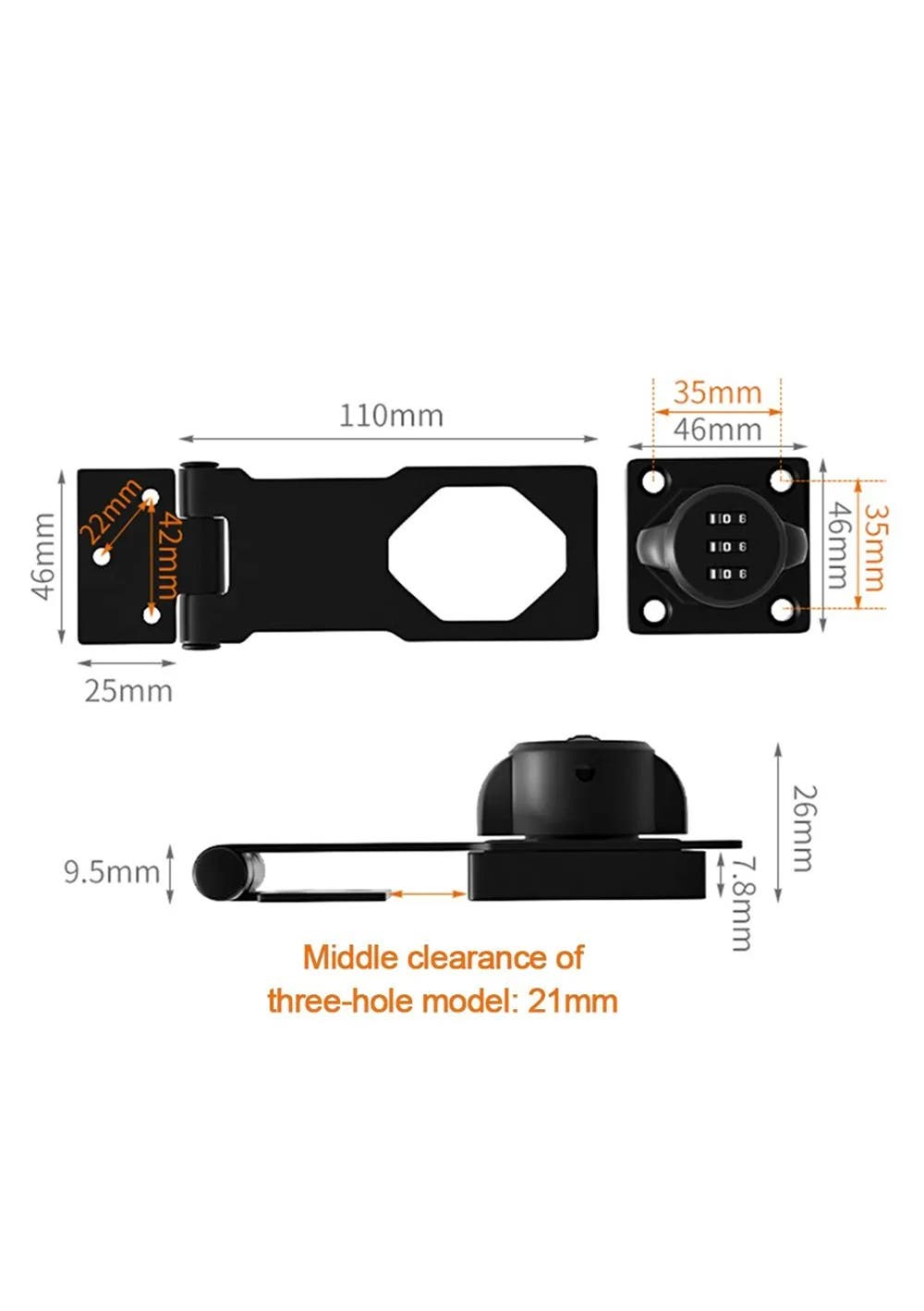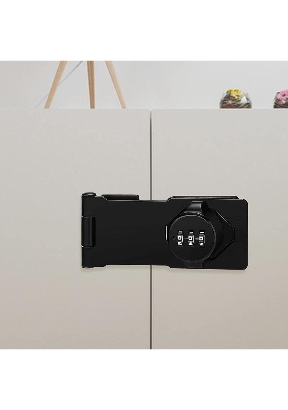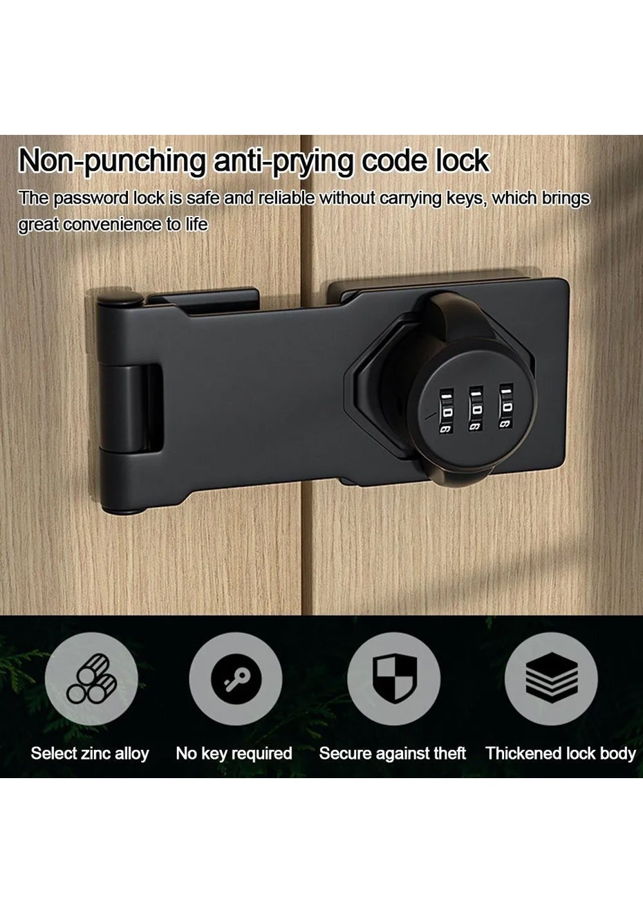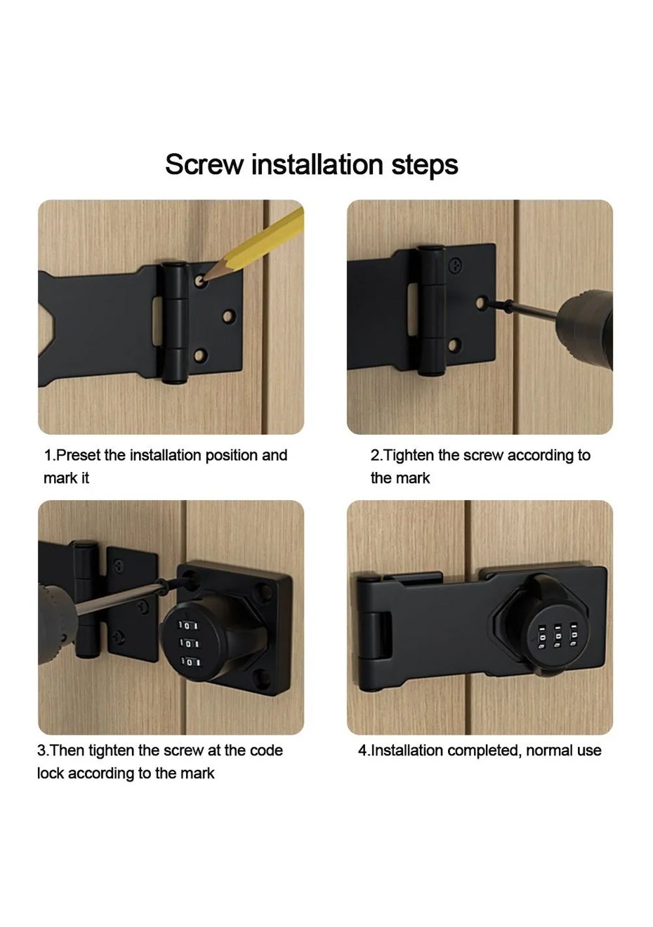 Keyless Anti-Theft Household Cabinet Password Hasp Lock<br>Product Description Revision:<br>Introducing our keyless anti-theft cabinet password hasp lock, providing a worry-free solution to your home's security. This lock is versatile and can be easily installed in various doors or cabinets around your house.<br>Key Features:<br>• Material: Steel<br>• Product Dimensions (LWH): 11×4.6×2.6cm<br>• Package Dimensions (LWH): 17x7.5x4cm<br>• Weight: 285g<br>• Keyless Security with Password Setting: Eliminate the worry of losing keys with our keyless security system. The initial password is set to '000' and can be easily changed or modified while the lock is in the unlocked state.<br>• Multi-Function: Ideal for various doors including wooden gates, shed doors, barn doors, garden gates, and cabinets. Also suitable for securing drawers, gun vaults, mailboxes, safe boxes, and office file cabinets.<br>• Durable and Rust-Resistant: The lock features 3 pick-proof chrome-plated dials and is constructed from sturdy zinc alloy to ensure it won't rust or wear over time.<br>• Easy to Install: The lock can be quickly and easily screwed to your cabinet with no complicated installation steps or settings. Suitable for both left or right installation and can be installed at 90° or 180° angles.<br><br>Package Includes:<br>• 1 * Cabinet Password Hasp Lock<br>• 1 * Screw Set<br>• 1 * Glue<br>