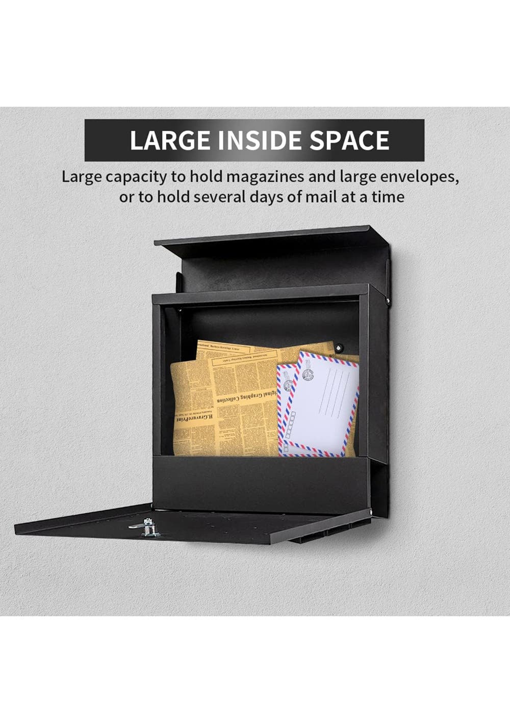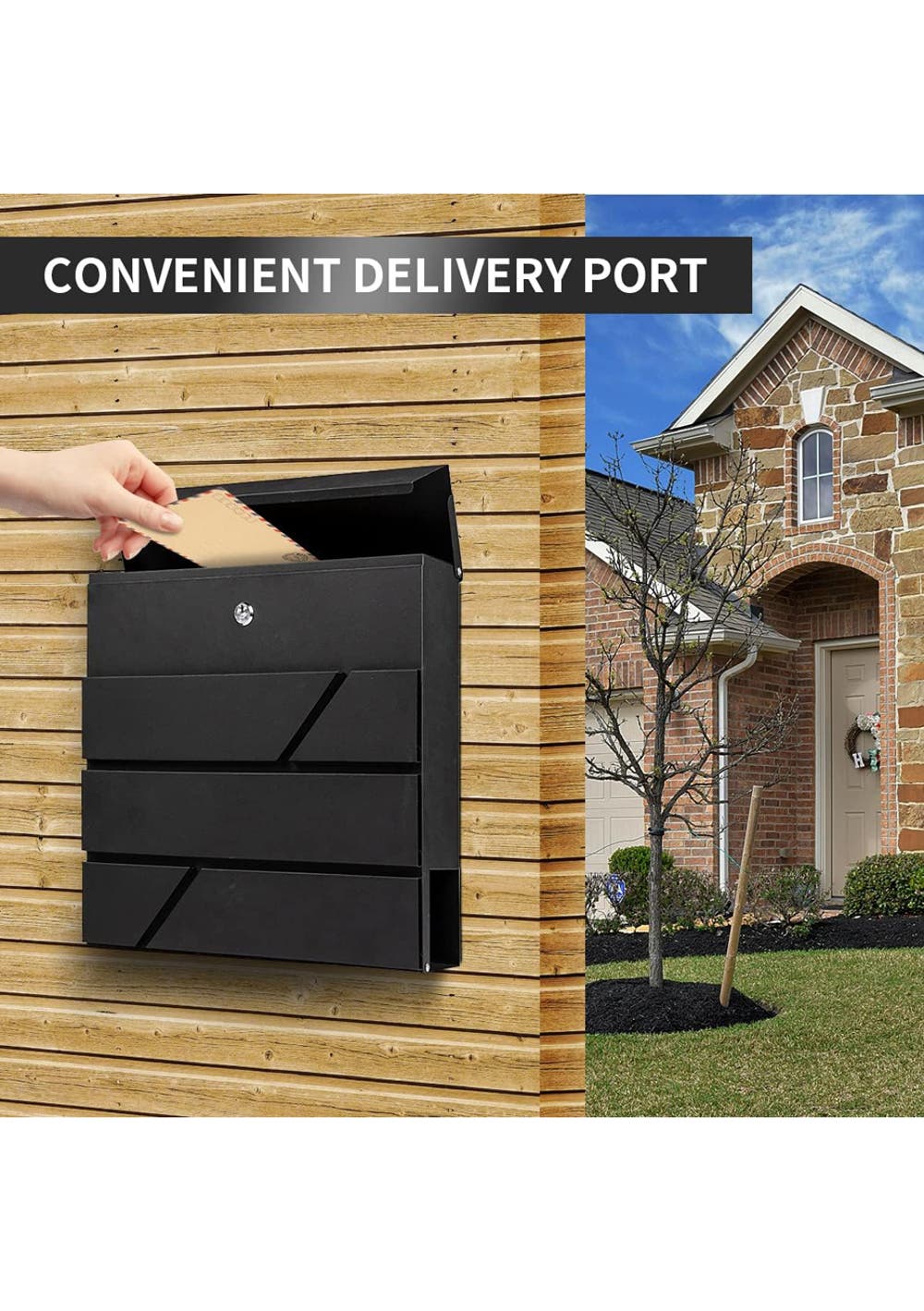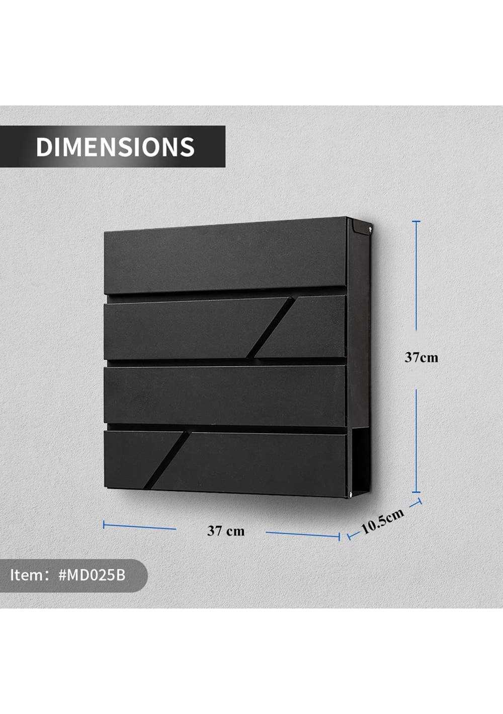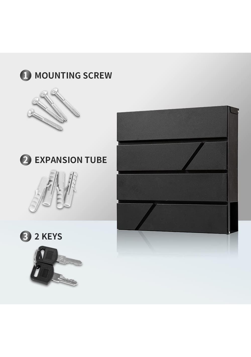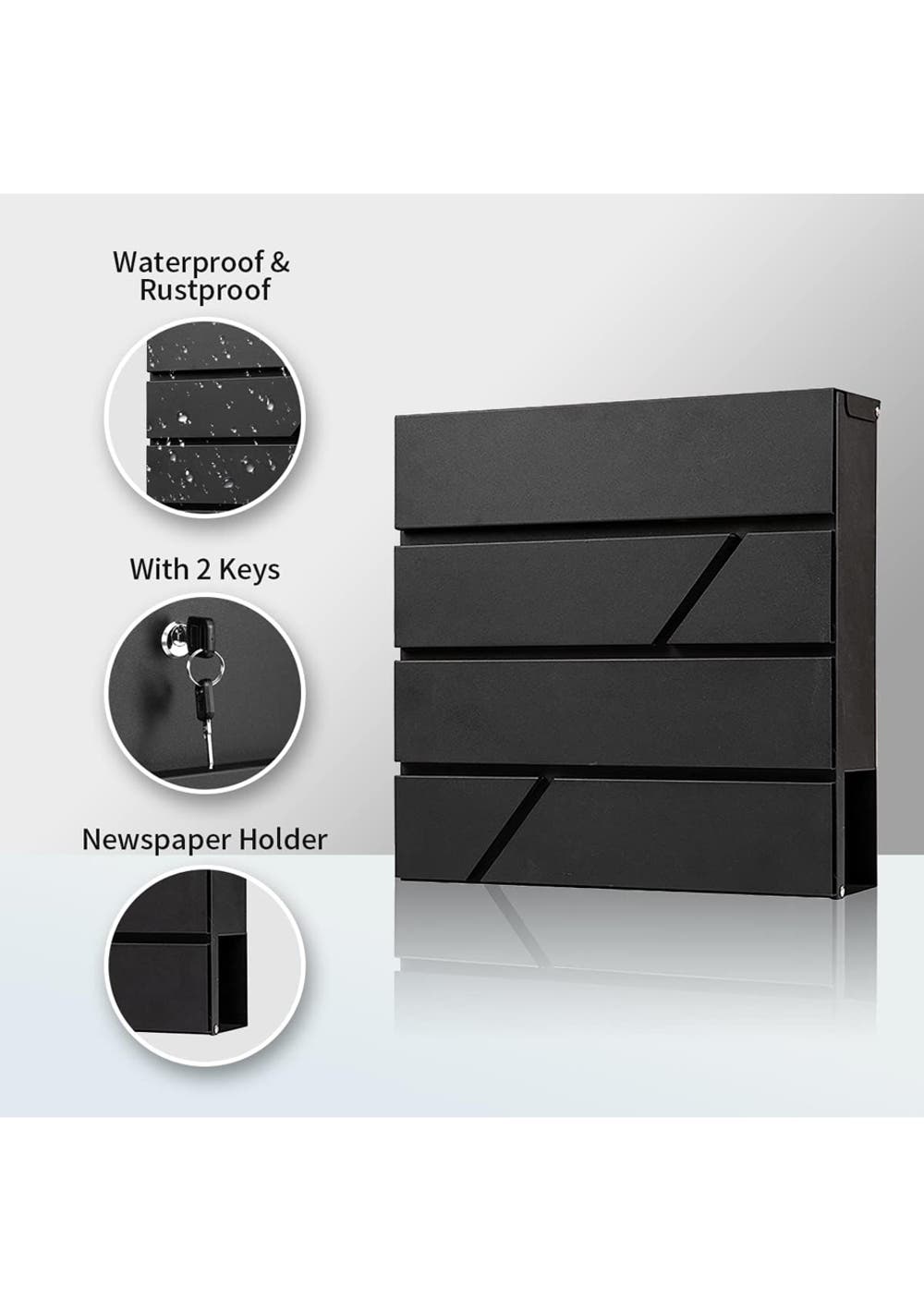 Large Capacity Locking Mailbox with Newspaper Holder<br>Material: Zinc-plated steel<br>Product dimensions (LWH): 37×37×10.5cm<br>Package dimensions (LWH): 46x41x16cm<br>Weight: 4000g<br>Features:<br>• High Quality: This mailbox is made of strong galvanized steel with a professional outdoor powder coating, ensuring durability and resistance to scratches, fading, and rust. It is designed to withstand the elements and provide long-lasting use.<br>• Large Capacity: With its spacious dimensions of 37×37×10.5cm, the mailbox can accommodate a significant amount of mail, including letters, magazines, and large envelopes. It offers ample storage space, allowing you to store several days' worth of mail conveniently.<br>• Newspaper Holder: The mailbox includes a convenient newspaper holder at the bottom, providing a designated space for your newspapers, keeping your mail organized and accessible.<br>• Safe Lock: For added security and peace of mind, the mailbox is equipped with a sturdy security key lock, ensuring the safety of your mail and preventing unauthorized access or mail theft.<br>• Modern Look: With an elegant and modern design, this mailbox adds a stylish touch to the exterior of your home, complementing any decor or architectural style.<br>• Easy Installation: The mailbox comes with pre-drilled holes and mounting screw sets, making installation simple and straightforward. The package also includes expansion bolts and spacers for secure mounting.<br><br><br>Package Include:<br>• 1 x Wall Mount Mailbox<br>• 4 x Screws<br>• 4 x Expansion Bolts<br>• 4 x Spacers<br>• 1 x Instruction Book<br>• 2 x Keys<br><br>