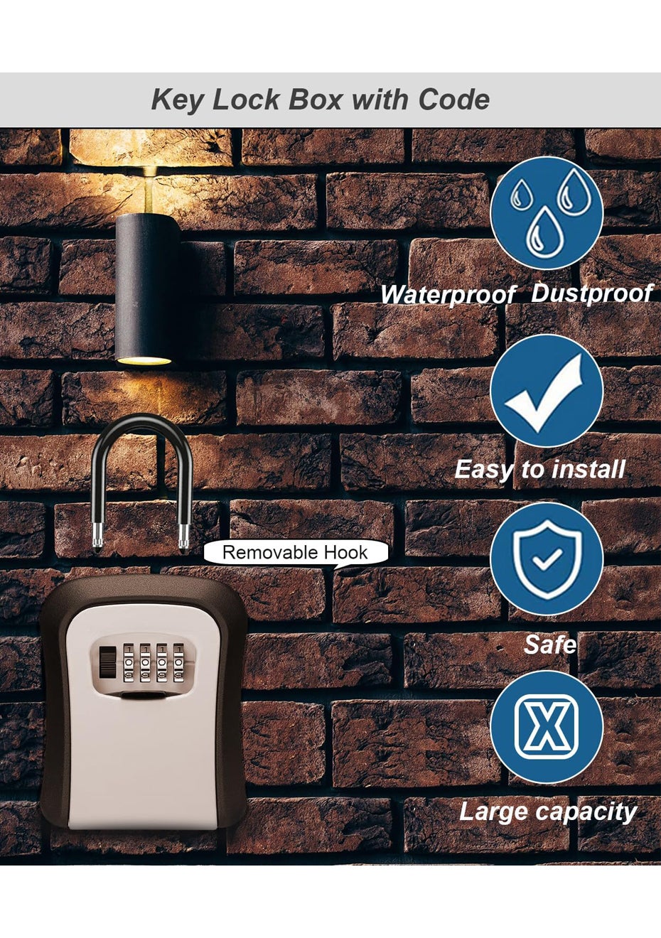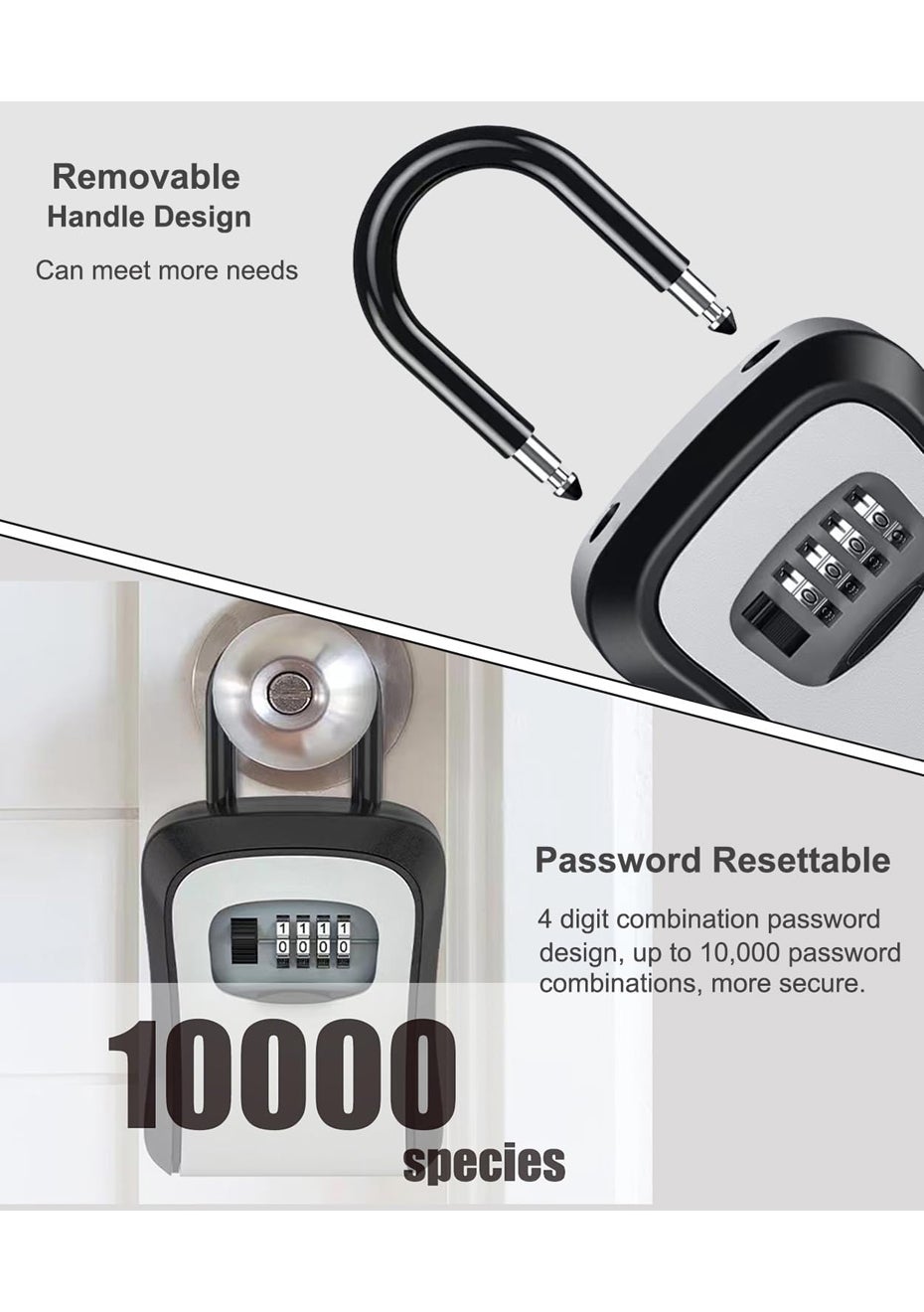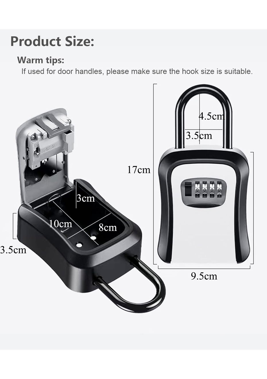 Wall Mounted and Portable Key Lock Box Material: Plastic, Zinc Package dimensions (LWH): 13×10×5cm Weight: 265G Key Features: Resettable Combination Lock: This key lock box features a customizable 4-digit combination lock, providing up to 10,000 unique password combinations. Easily set and reset the code in just four simple steps, ensuring that your keys are always secure and accessible only to you. Durable & Weatherproof Design: Constructed with a robust ABS plastic casing and a zinc alloy lock body, this lock box is built to withstand outdoor conditions. The hidden password cover adds an extra layer of protection, making it waterproof and dustproof. Ideal for safely storing your keys without worrying about exposure to the elements. Spacious Interior: Despite its compact size, the lock box offers a large storage capacity of 8.5×6.2×3cm, accommodating multiple keys, access cards, or small valuables. Perfect for ensuring your essentials are securely stored and easily accessible. Versatile Use: This key lock box is perfect for a wide range of applications, including home, office, garage, rental properties, and more. It’s an excellent solution for property management, allowing easy access for decorators, cleaners, babysitters, and real estate agents while ensuring your property remains secure. Flexible Installation Options: The lock box offers two installation methods for maximum flexibility. Use the detachable handle to hang it on a door handle, or securely mount it to a wall using the provided screws and expansion plugs. Easy to set up and relocate as needed. Package Includes: 1x Key Lock Box 1x Detachable Handle 4x Screws 4x screw anchors