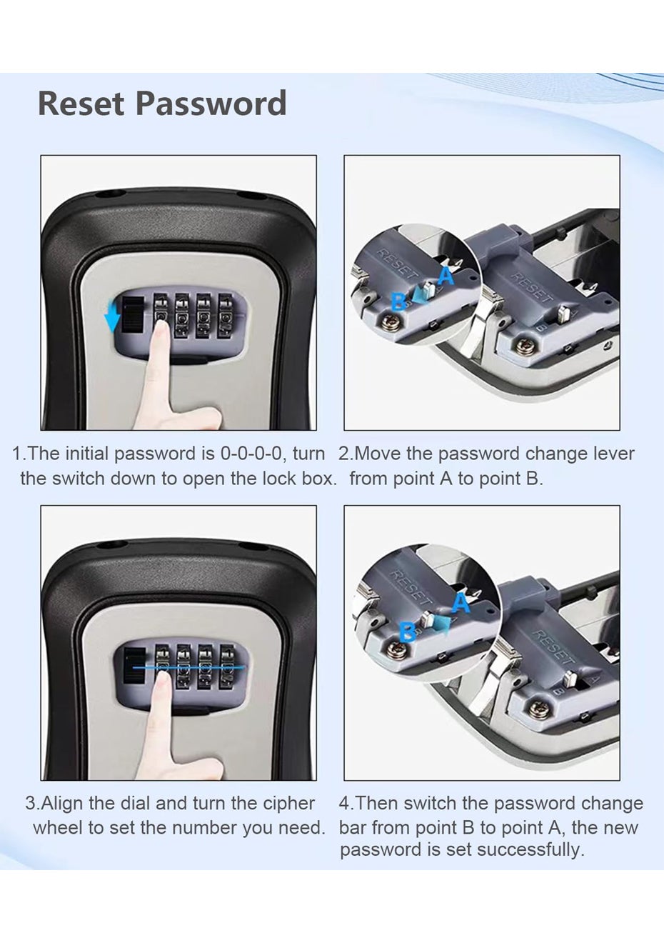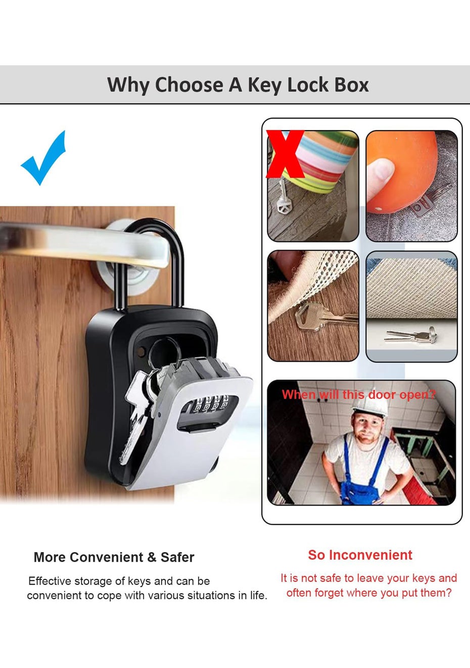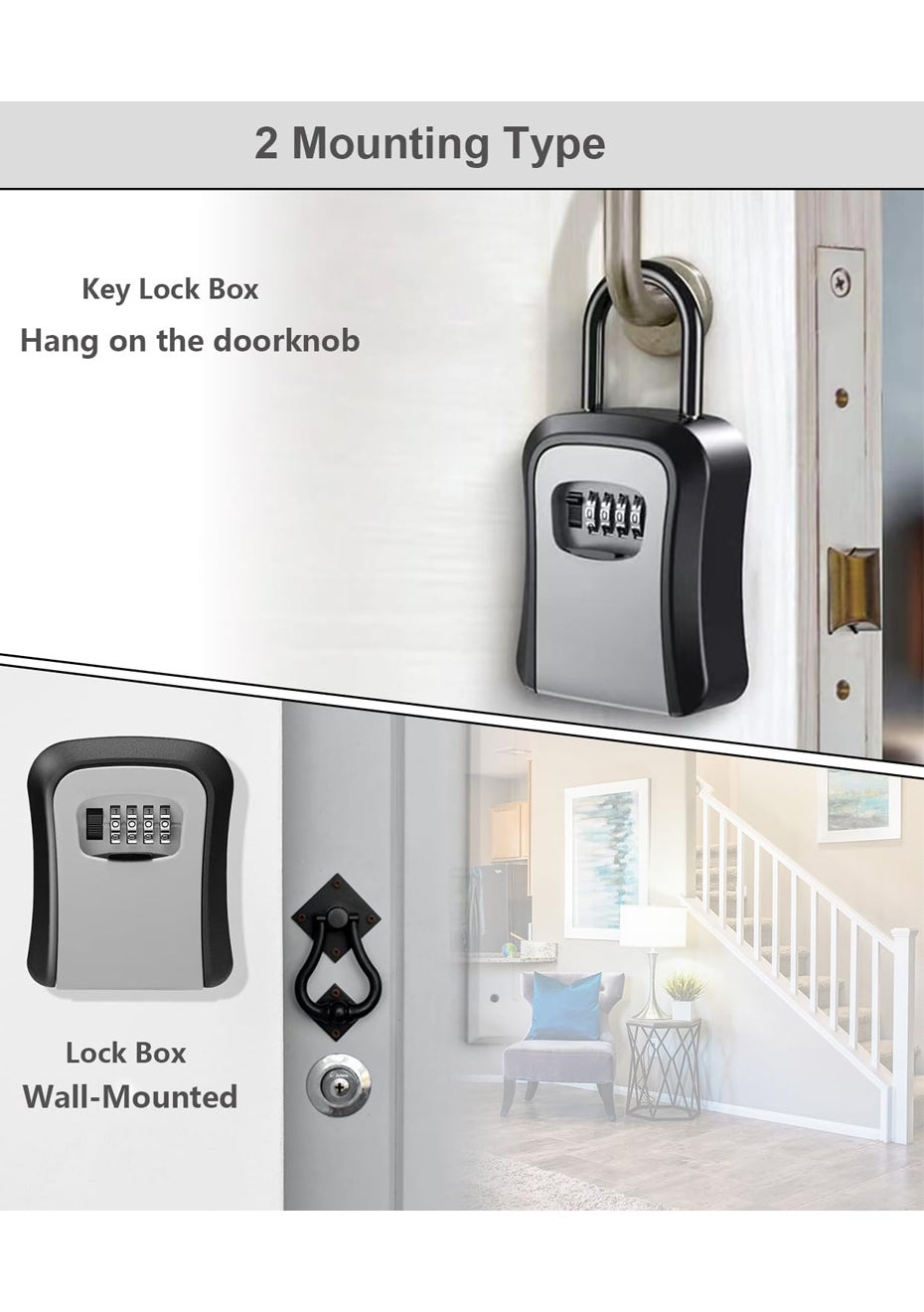 Wall Mounted and Portable Key Lock Box Material: Plastic, Zinc Package dimensions (LWH): 13×10×5cm Weight: 265G Key Features: Resettable Combination Lock: This key lock box features a customizable 4-digit combination lock, providing up to 10,000 unique password combinations. Easily set and reset the code in just four simple steps, ensuring that your keys are always secure and accessible only to you. Durable & Weatherproof Design: Constructed with a robust ABS plastic casing and a zinc alloy lock body, this lock box is built to withstand outdoor conditions. The hidden password cover adds an extra layer of protection, making it waterproof and dustproof. Ideal for safely storing your keys without worrying about exposure to the elements. Spacious Interior: Despite its compact size, the lock box offers a large storage capacity of 8.5×6.2×3cm, accommodating multiple keys, access cards, or small valuables. Perfect for ensuring your essentials are securely stored and easily accessible. Versatile Use: This key lock box is perfect for a wide range of applications, including home, office, garage, rental properties, and more. It’s an excellent solution for property management, allowing easy access for decorators, cleaners, babysitters, and real estate agents while ensuring your property remains secure. Flexible Installation Options: The lock box offers two installation methods for maximum flexibility. Use the detachable handle to hang it on a door handle, or securely mount it to a wall using the provided screws and expansion plugs. Easy to set up and relocate as needed. Package Includes: 1x Key Lock Box 1x Detachable Handle 4x Screws 4x screw anchors