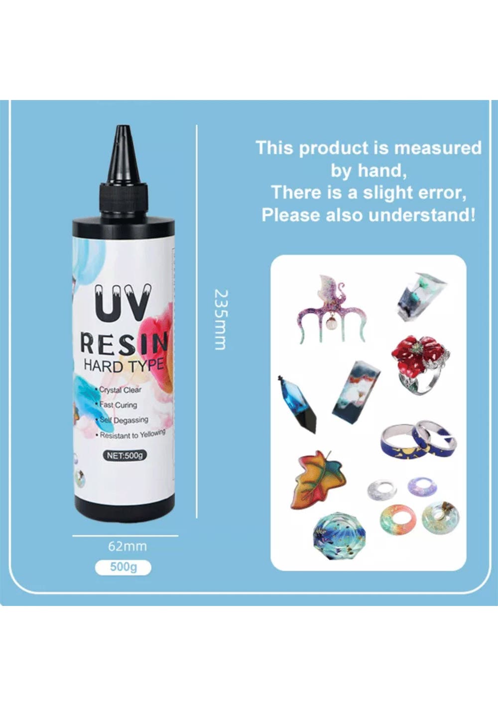 Waterproof & High Hardness, You will get the uv epoxy resin with the following characteristics: crystal clear, super hard, fast curing, low odor, less bubble and no mixing.