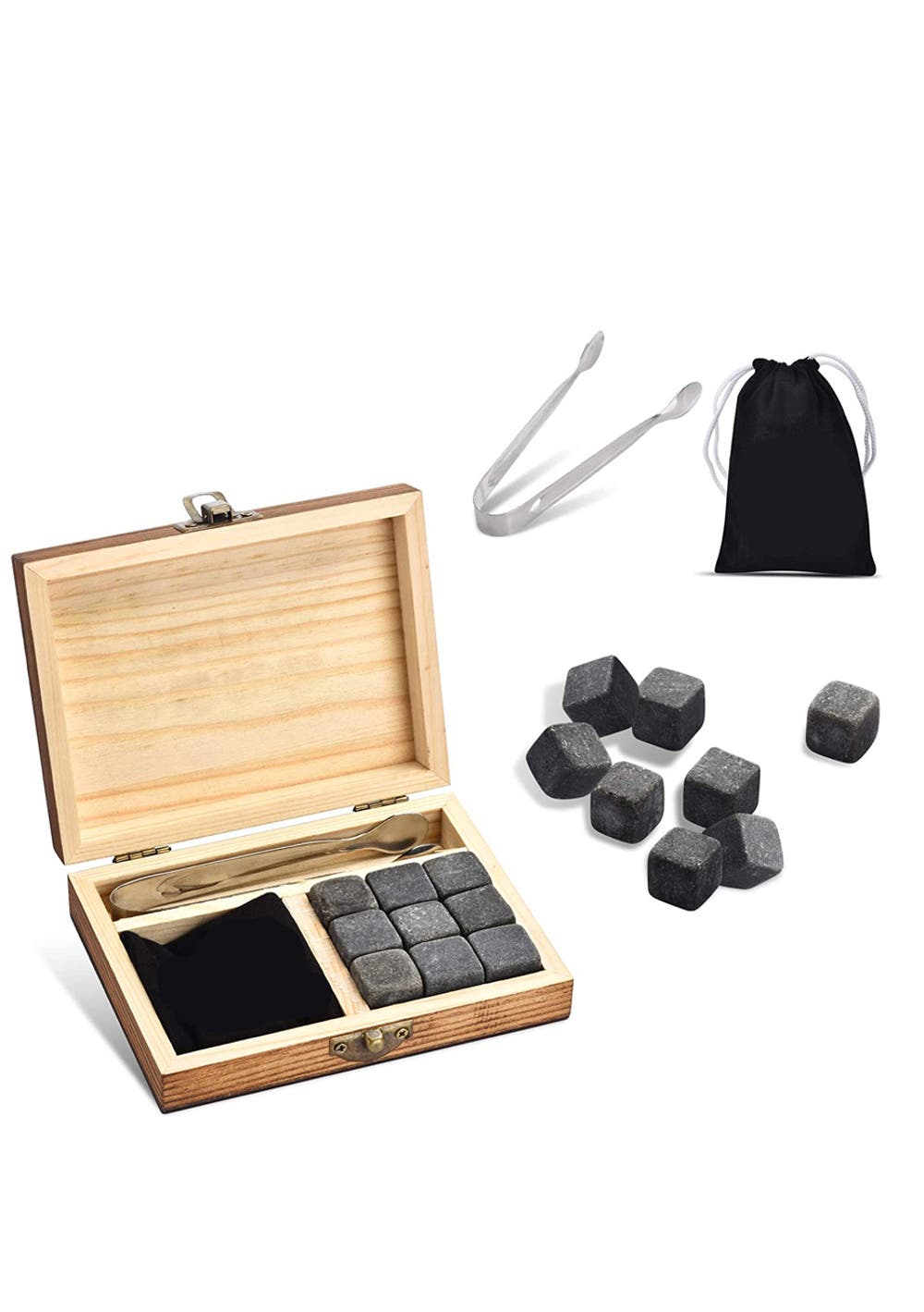 The whiskey stones gift sets include 9 whiskey cooling stones, a handmade wooden box, a black velvet pouch to carry whiskey rocks, a small tweezers convenient for taking a stone