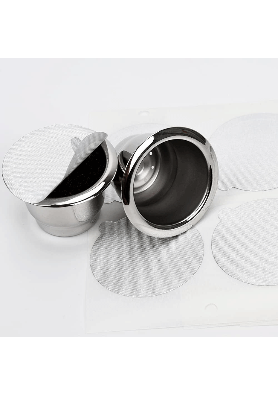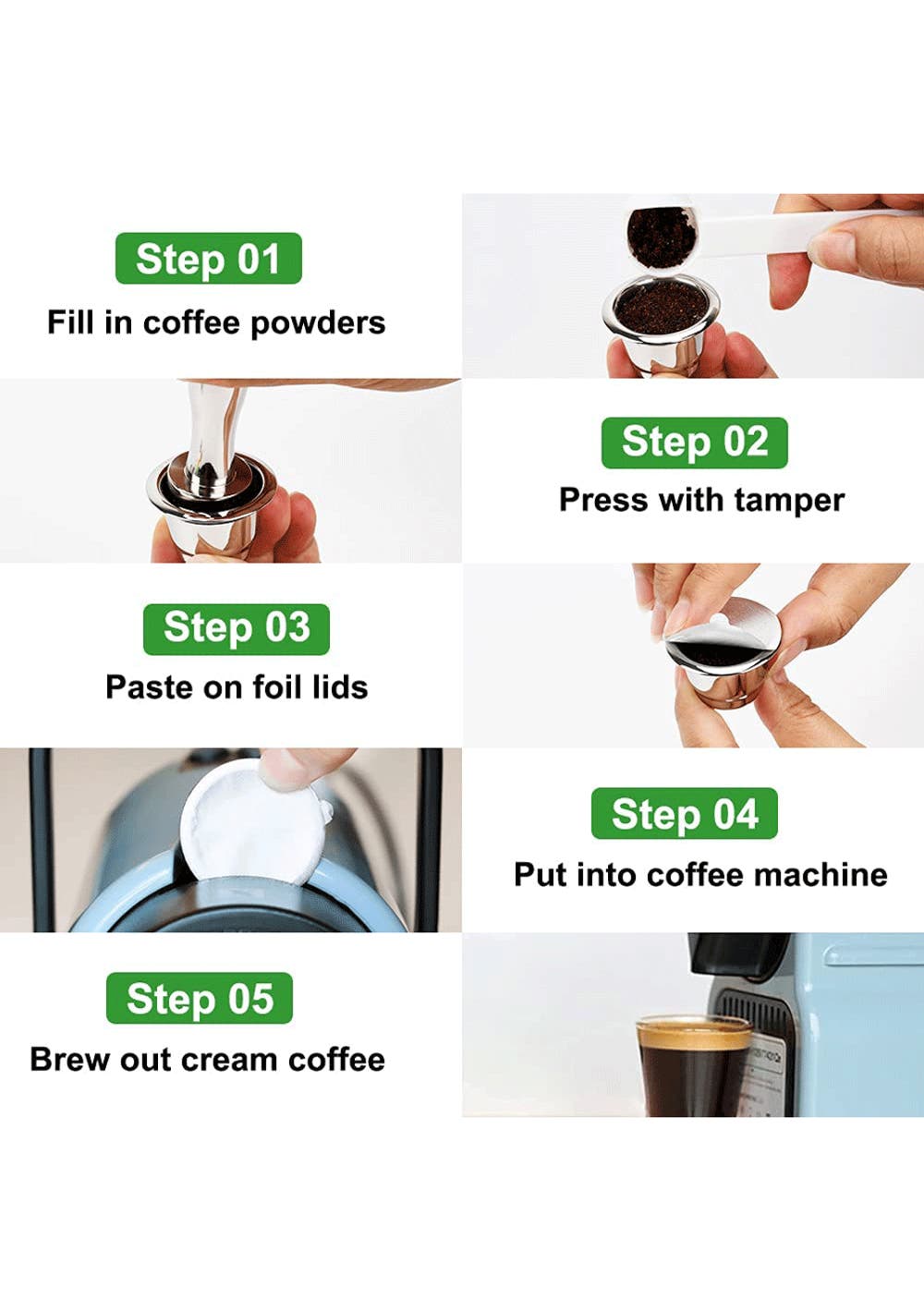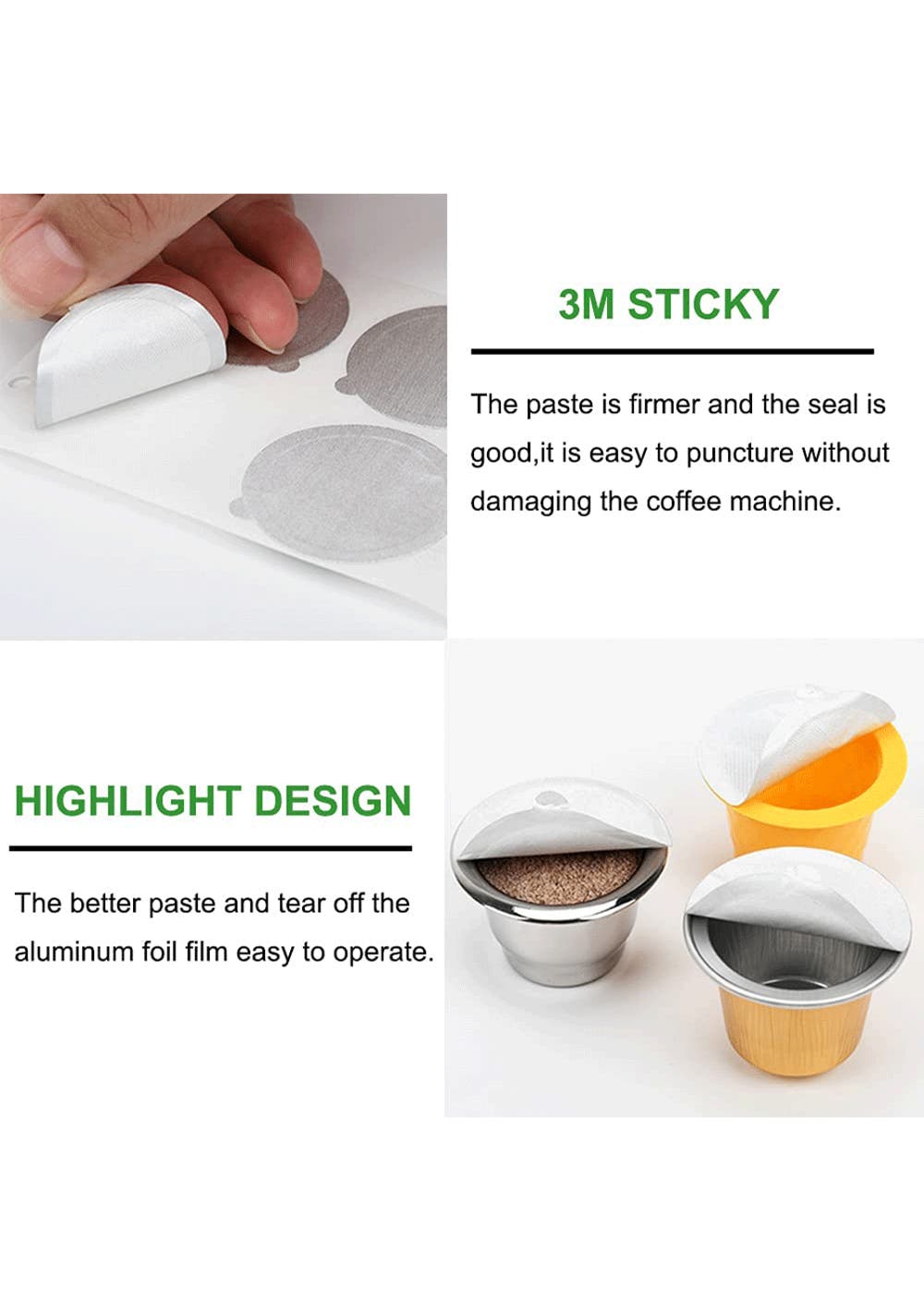 Application, The self-adhesive aluminum foil lids seals for reusable nespresso pods are suitable for coffee, just pour some coffee grinds into a used capsule case and add aluminum foil lid to refillable coffee capsules cup.