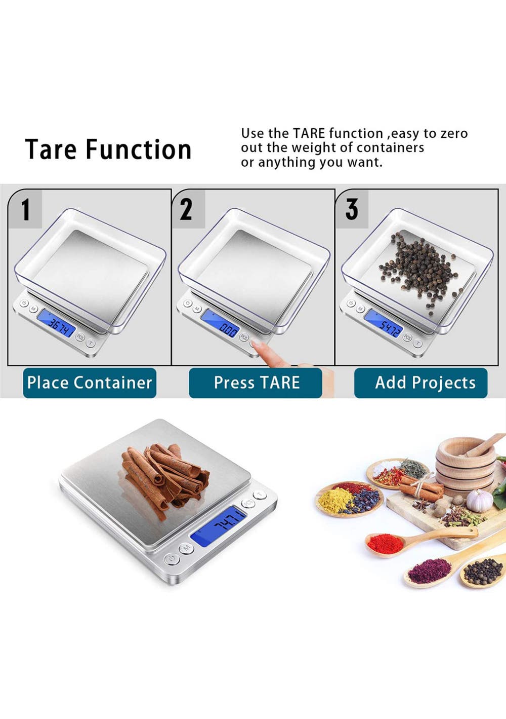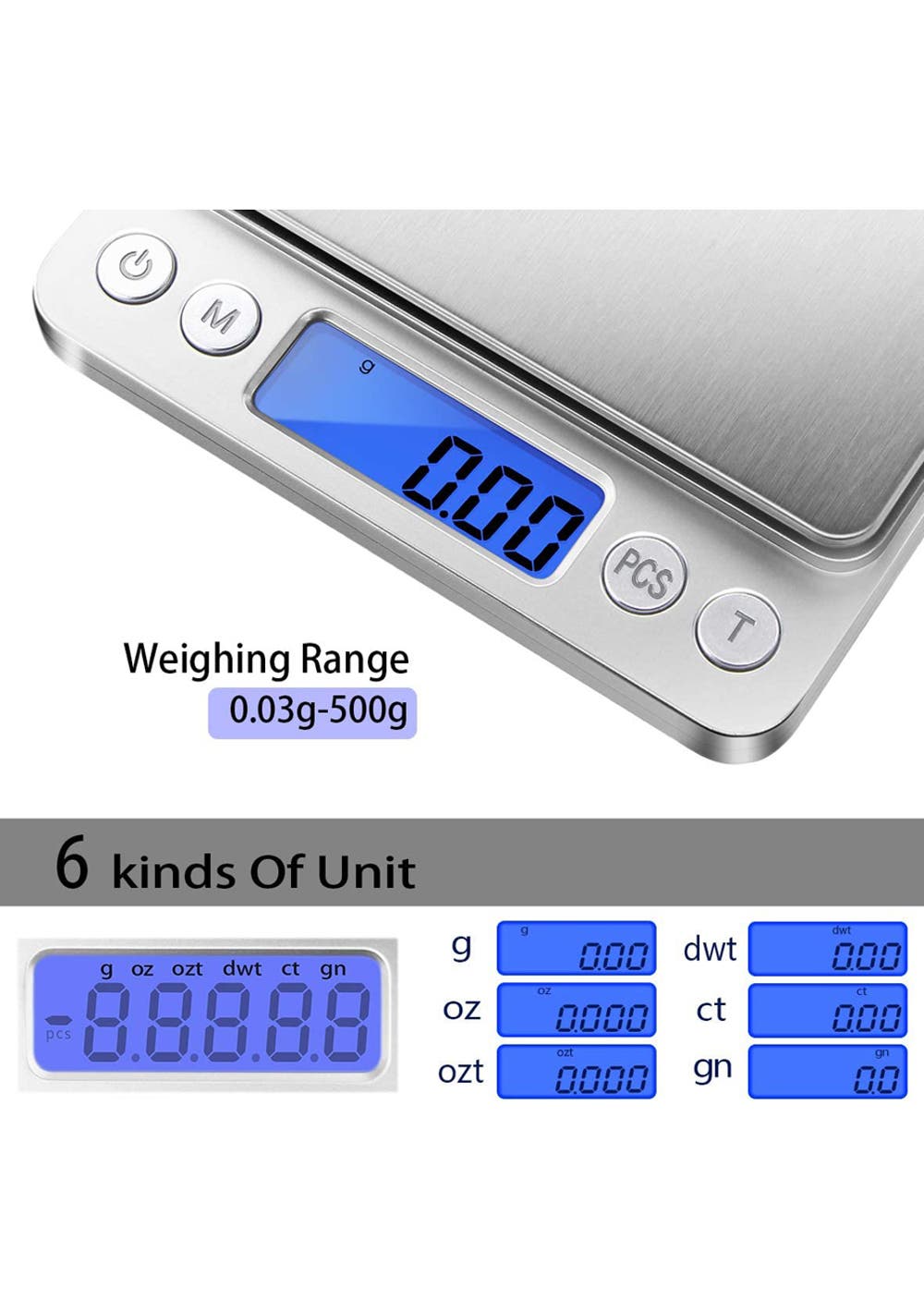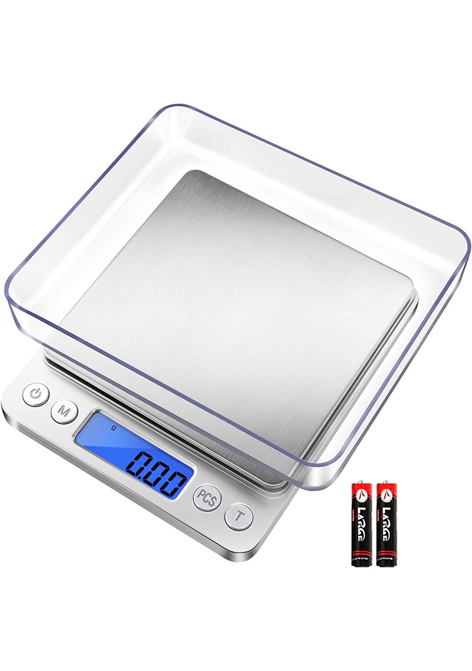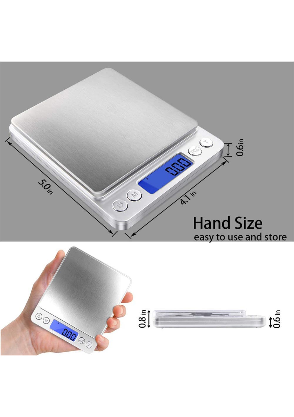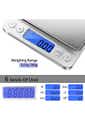 Digital Kitchen Scale for Jewelry, Nutritional Intake<br>Material: Stainless Steel, Plastic, Acrylonitrile Butadiene Styrene<br>Product dimensions (LWH): 11x13x2cm<br>Package dimensions (LWH): 15x12.5x2.5cm<br>Weight: 270g <br><br>Feature<br>• The product is a digital scale designed for accurate and precise weighing of various items.<br>• The scale has a weight capacity of 500g and an accuracy of 0.01g, ensuring accurate and reliable measurements.<br>• The scale features a LCD screen that displays weight measurements in various units such as grams, ounces, carats, and grains.<br>• The scale has a tare function, which allows for the weight of containers to be subtracted from the total weight.<br>• The scale is compact and portable, making it easy to store and transport.<br>• The scale is powered by two AAA batteries (included).<br>• The product includes a user manual and a calibration weight for accuracy.<br>• The digital scale is a great tool for cooking, baking, and other applications that require accurate measurements.<br>Package Include<br> 1x Digital Scale<br> 2 x trays