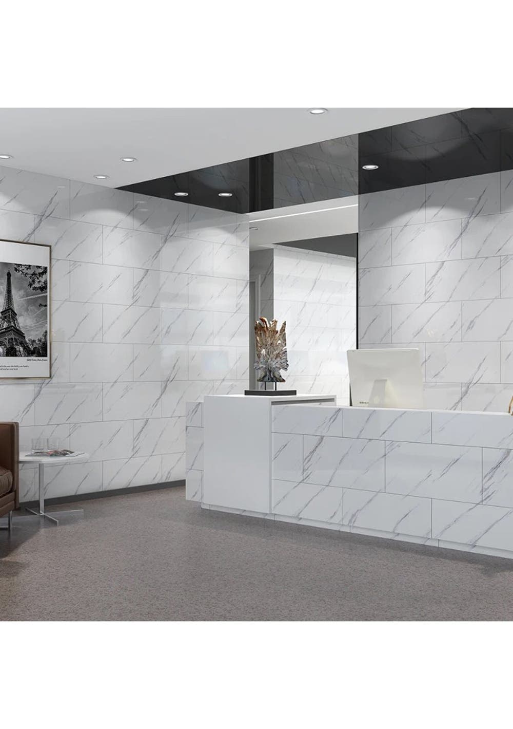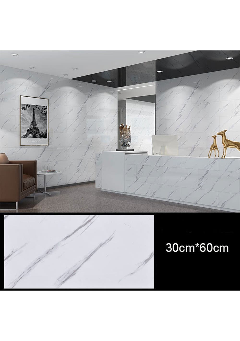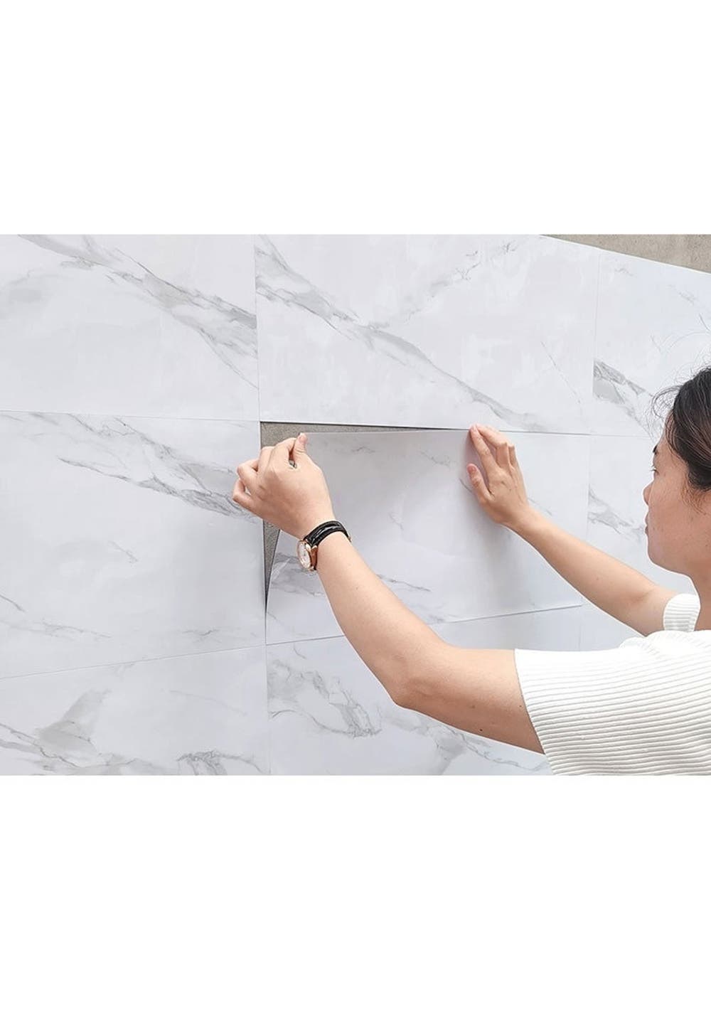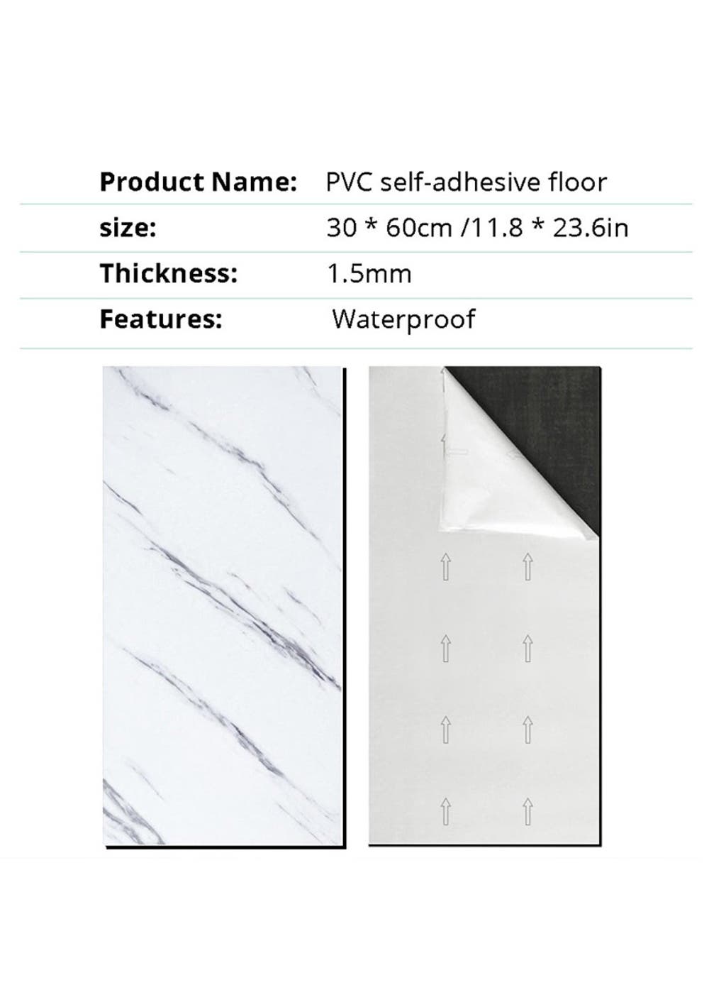 Peel and Stick Wall Tile: The white marble peel and stick tile is made of high quality vinyl, durable and sturdy for heavy traffic area, waterproof, oil-proof, scratches-resistant. Size is 30x60cm