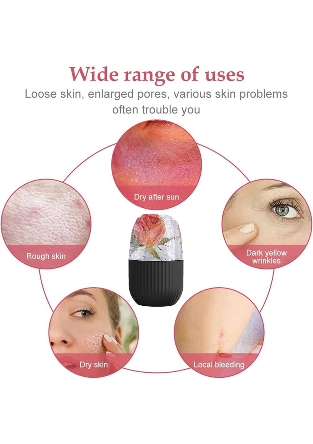 Ice Roller for Face and Eyes<br>Top-Grade Material for Lasting Use<br>• Crafted from Silicone: Durable and safe for repeated use.<br>• Product Dimensions: 11.5×6.2×4.2cm.<br>• -Packaging Dimensions: 11.5 x 6.5 x 4cm.<br>• Light as a Feather: Weighs in at only 75g for easy handling.<br>Multifunctional Facial Solution<br>• Versatile Facial Care: Ideal for all skin types to address a variety of concerns including acne, puffiness, and fine lines.<br>• Holistic Benefits: Enhances blood circulation, skin tone, elasticity, and lymphatic drainage, while also reducing wrinkles and dark circles.<br>Effortless Beauty Routine<br>• Simple to Use: Just fill the mold with water or your choice of skin-loving ingredients, freeze, and apply in a circular motion.<br>• Daily Skin Ritual: For optimal results, integrate into your daily skincare routine.<br>Superior Quality<br>• Premium Silicone: High-quality material that's food-grade, BPA-free, and built for longevity. Enjoy professional beauty care at home.<br>The Perfect Gift<br>• Cherished Present: An excellent gift choice for the skincare aficionado in your life, ideal for special occasions or just because.<br><br>Package Contents:<br>• 1x Ice Roller