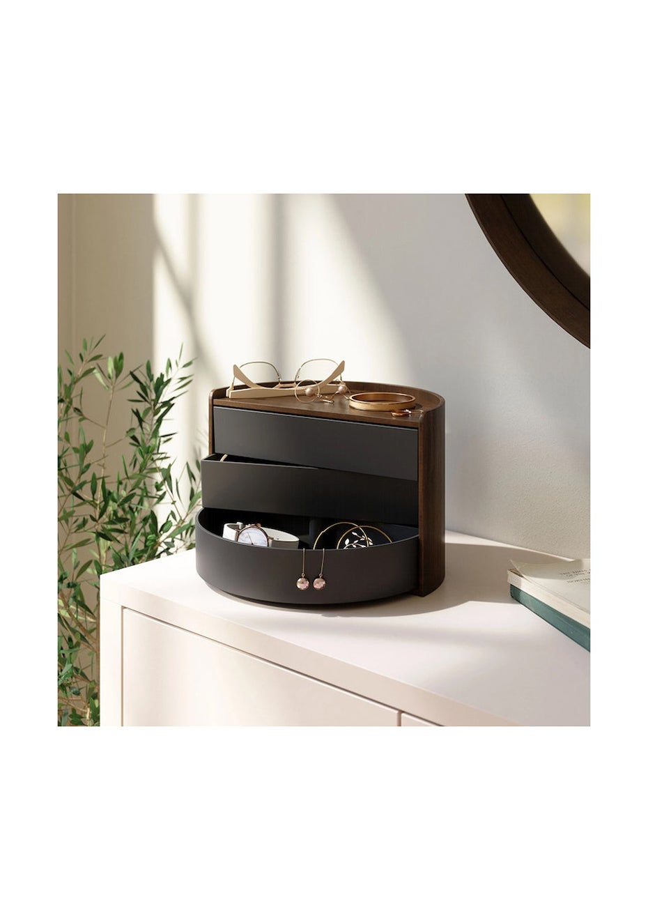 Moona features round, circular shapes for a one-of-a-kind jewelry organizer. Both decorative and functional, Moona has a large display top that doubles as a tray for smaller accessories, perfume, small plants or other items. Its three rotating drawers can provide hidden storage or be pushed out for easy access. With its unique semi-circle shape and beautiful wood accents, Moona can be displayed on your vanity, counter, dresser, desk and more. EU Design 008186027-0001 ROTATING DRAWERS: This modern jewelry box features three large drawers that rotate 360 degrees for easy access LARGE DISPLAY TOP: Moona's top surface doubles as an accessory tray for your most frequently used accessories or can be used for other products or small decor HIDDEN STORAGE: Moona features a covered design with hidden storage compartments that allows your jewelry to be kept private and out of sight ORIGINAL & MODERN DESIGN: With an outer wooden finish and rounded curves, Moona features a modern and unique design that looks great on any vanity, countertop, dresser and more