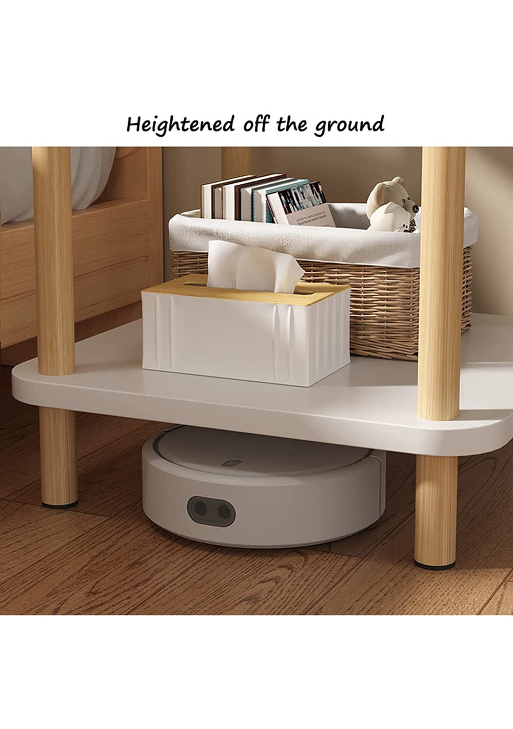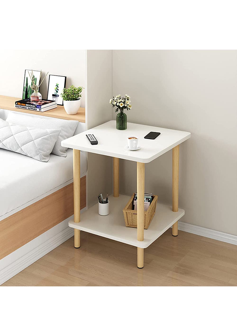 2-Tier Tall Square Wooden Side Table Bedside Table White Material: MDF, Pine Wood Product dimensions (LWH): 40 x 40 x 52 cm Package dimensions (LWH): 45 x 45 x 8 cm Weight:4 kg KEY FEATURES:  This bedside table is reasonable in size and fulls in function makes it very suitable for narrow space.  It can not only be used as a desk beside the sofa or a storage cabinet beside the bed but also be placed in the office, corridor, and other places.  This bedside table has enough volume to give you enough space to organize your stuff. And you can put some photos or decorations on the top of your cabinet, for normal use, please do not place overweight items  A simple exterior matches the decor of any room or office in your home, and a modern nightstand will add some glamour to your home or office  Package Include  1 x 2-Tier Tall Wooden Side Table  1 x Manual