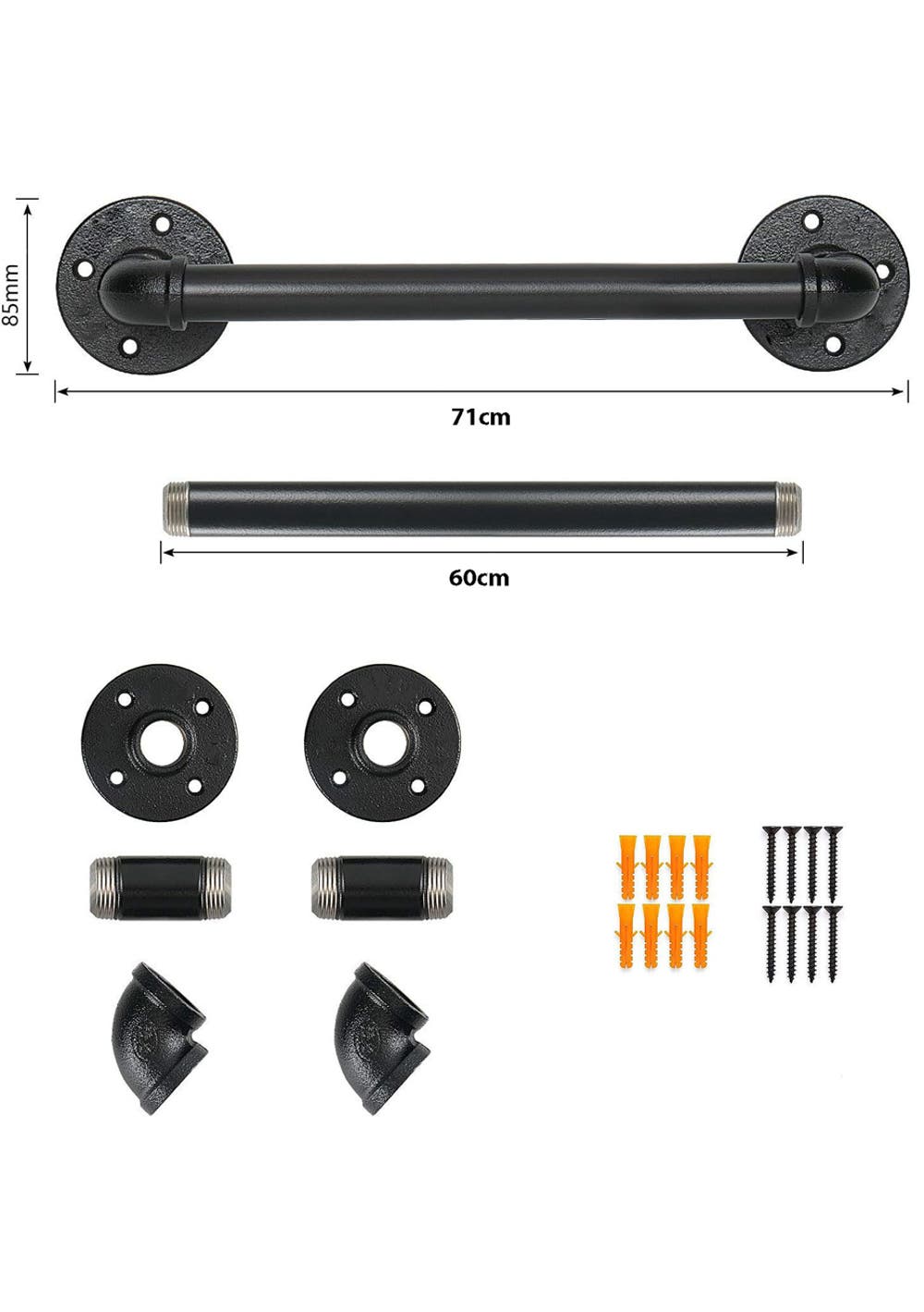 Industrial Pipe Towel Rack Towel Bar - 60CM<br>Material: Iron<br>Product dimensions (LWH): 71 x 10 cm<br>Package dimensions (LWH): 65 x 17 x 4 cm<br>Weight: 850g<br>Features<br>【Product Size】: This Industrial Pipe Towel Bar is spliced using a 3/4" thread. The support plate measures an 8.5cm flange diameter. The towel rod length is 60cm. Overall measures: 71cm L x 10cm H.<br>【Black Matte Surface】: The product features a black matte surface finish, lending an elegant touch to its robust industrial design.<br>【Contemporary Design】: Inspired by sturdy and solid steel pipes with rustic influences, this decor presents an elegant look designed to highlight your taste in home decoration.<br>【Easy to Install】: This item is DIY-friendly without the typical DIY difficulty. All the products come with mounting screws & drywall anchors. Simply screw these together, and they will hold firmly for years to come. No need for glue, cement, or welding.<br>【No Oil and Rust】: Industrial Pipe Iron Hooks feature an electroplated black finish, made of high-quality iron and powder-coated pipe to protect against rust and corrosion.<br>【Multiple Functions】: This versatile hanging bar is designed to create storage uniquely suited to your space. It's ideal for your bathroom, kitchen, bedroom, garage, foyer, closet, hallway, and entrance or front door.<br><br>Package Includes<br>1 x Pipe Towel Rack (Black Matte Surface) Hooks is not incl<br><br>2 x Screws Set