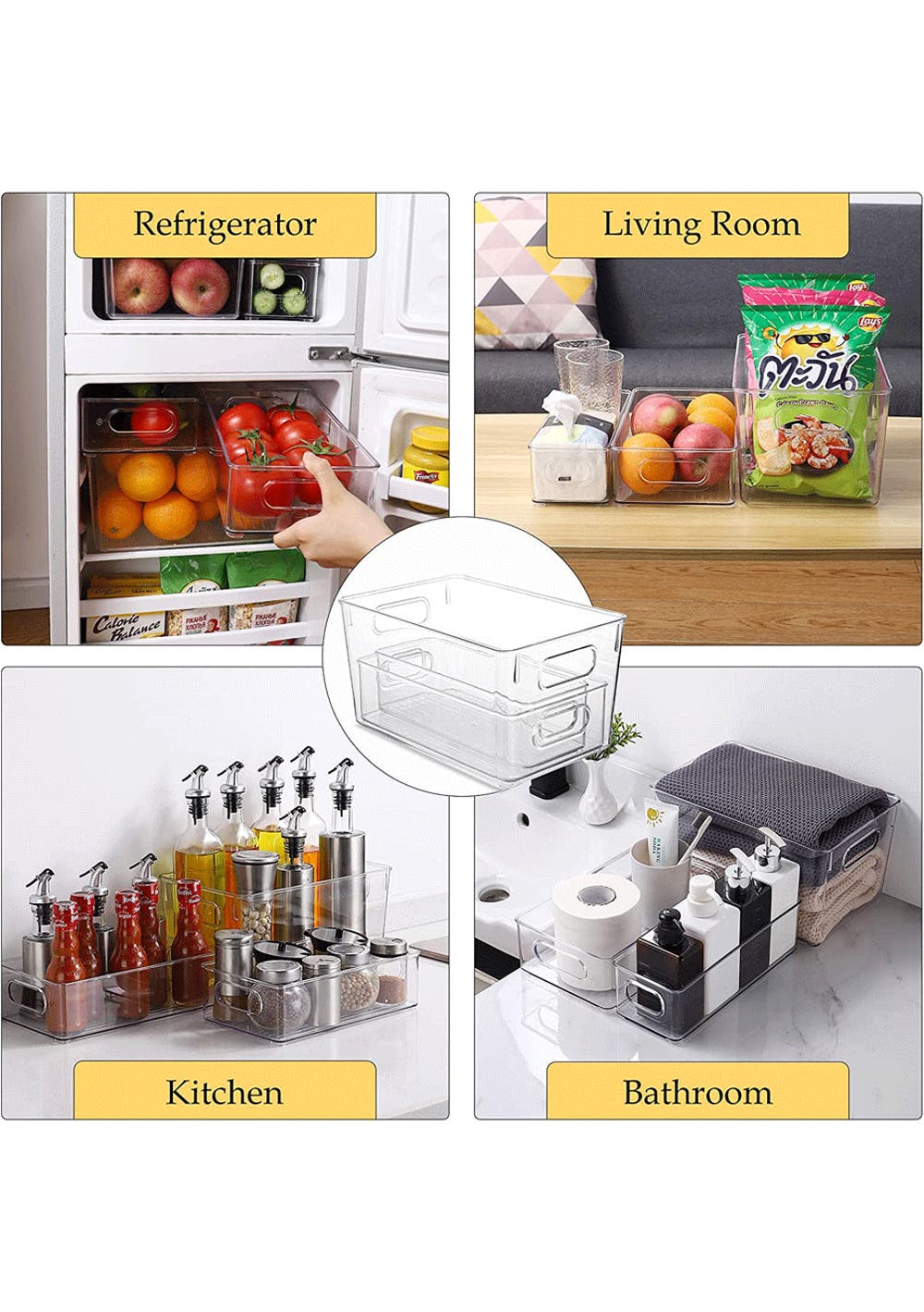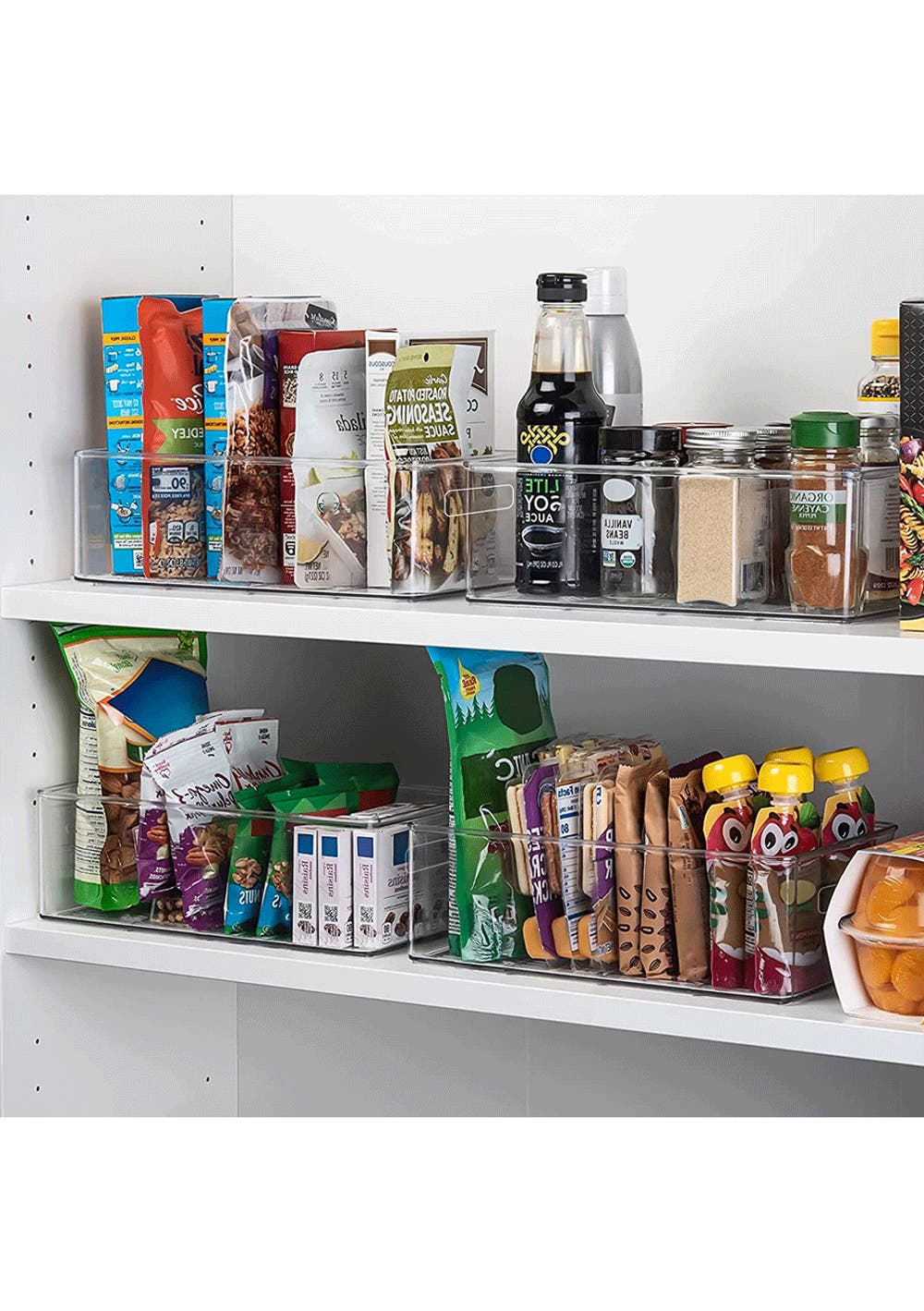 IDEAL SIZED - storage bins fit pouches, food packets, juice boxes, jars, baby food, bottles, canned goods, fruits, yogurts, cheese, and more. Also good for storing dry goods in the pantry. Ideal for kitchens, countertops, pantry shelves, refrigerators, freezers, cabinets, or as drawer organizers.