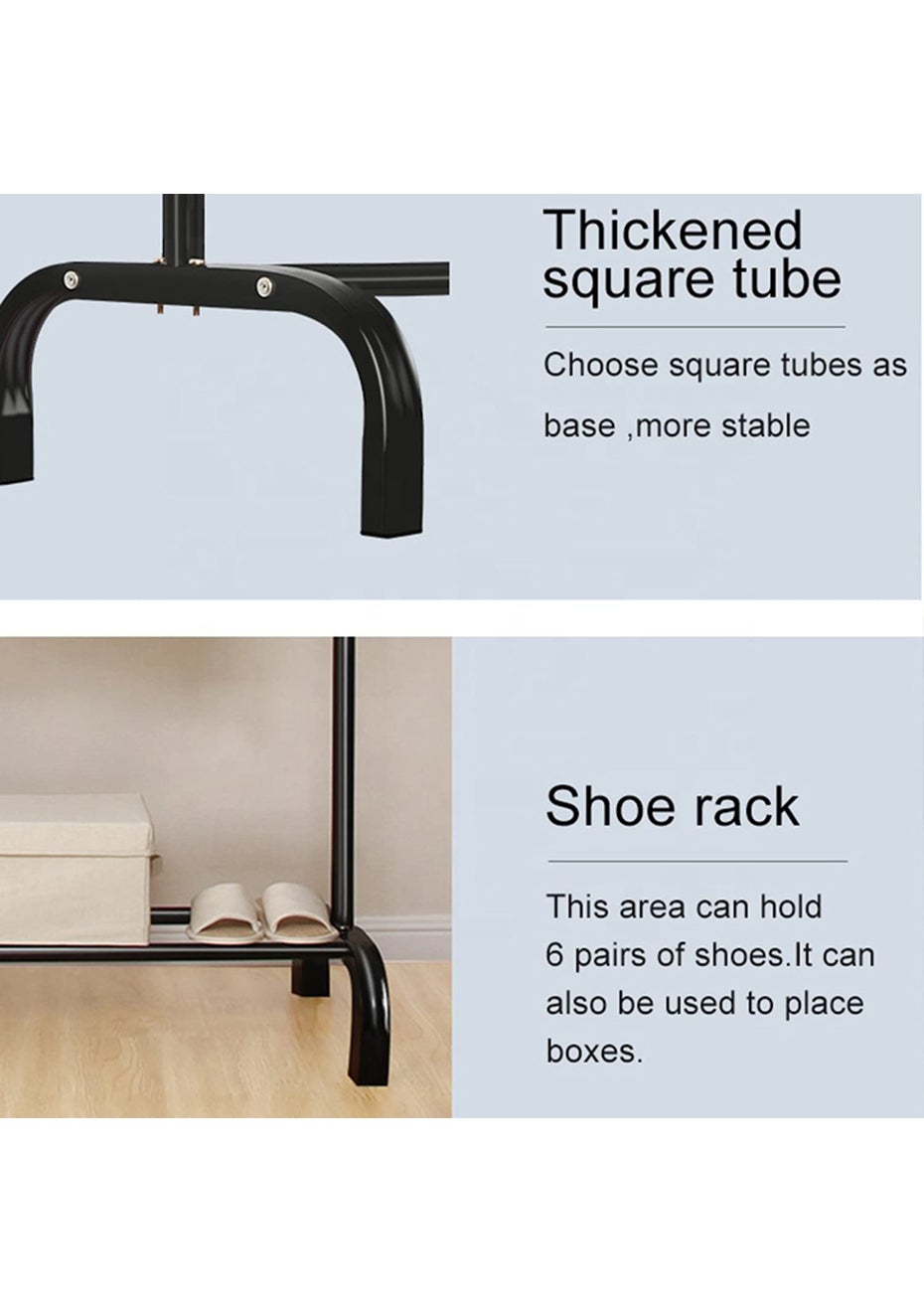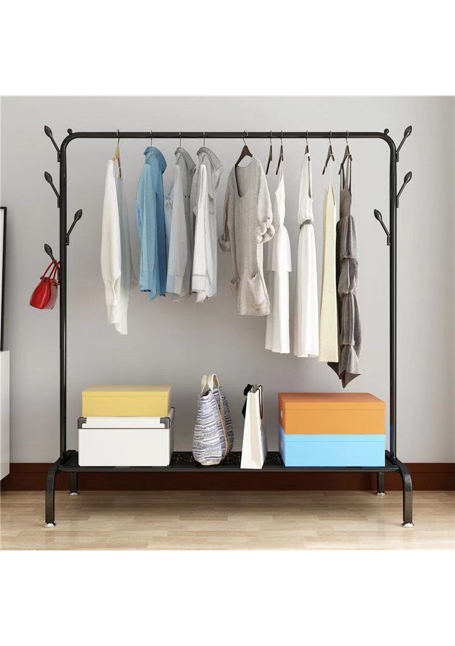 Clothes rack with one smooth rod and 7 side round-headed hooks for hanging clothes, jacket, umbrellas, hats, scarves, and handbags, 1 bottom shelf for storage your shoes or boxes.