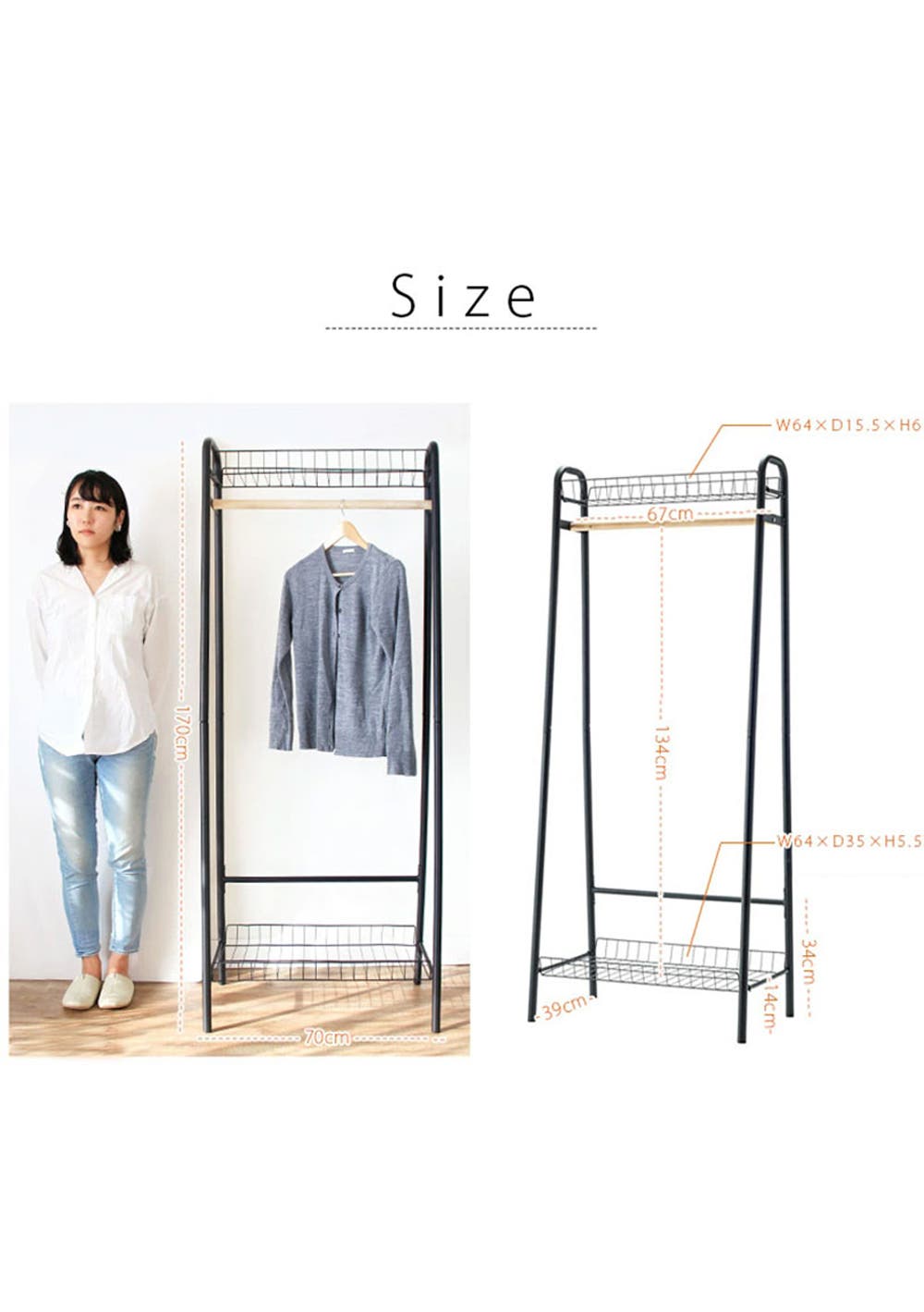 Steel basket on top and bottom of the metal and wood clothes rack for storing shoes, accessories, and more