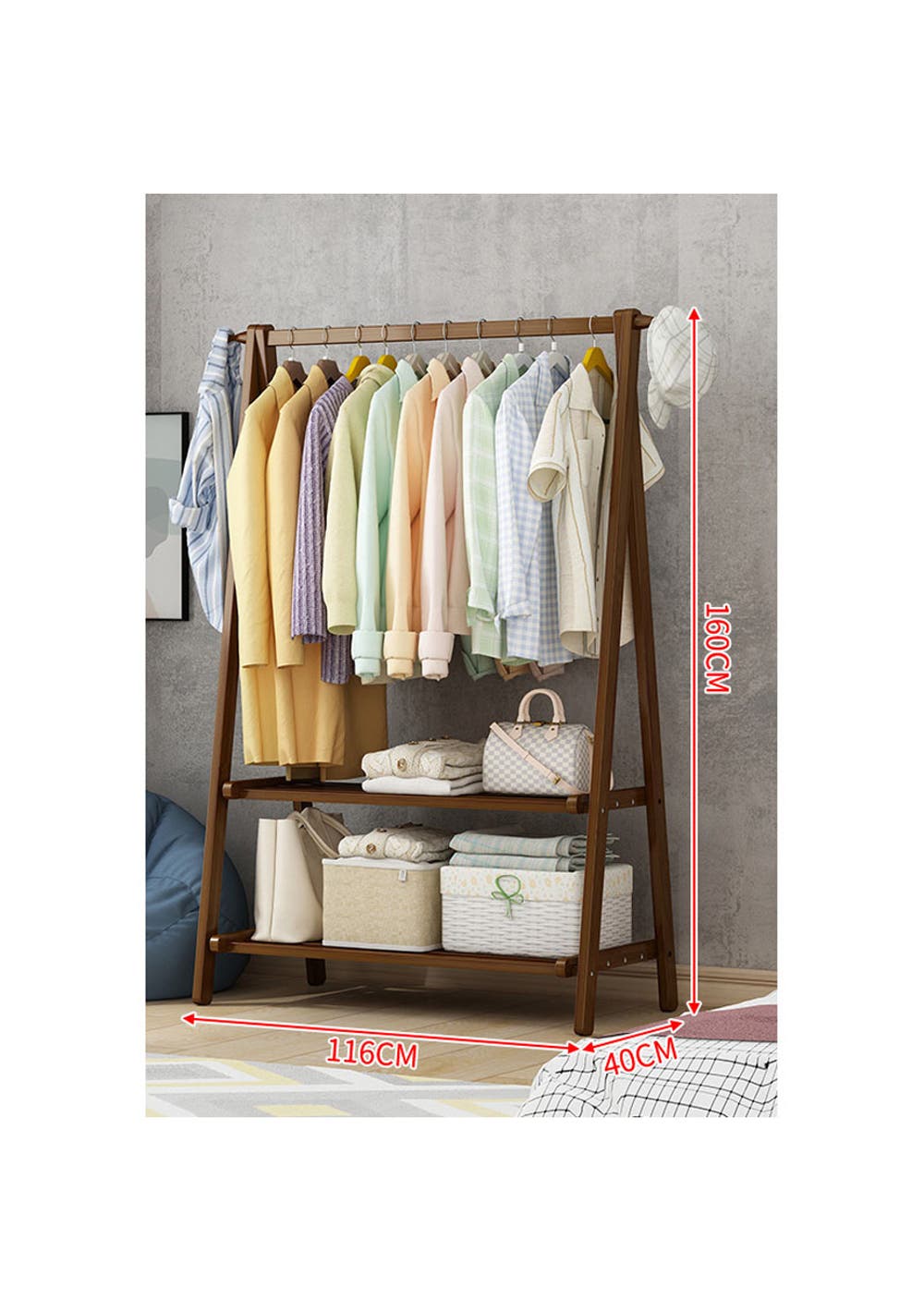Bamboo Foldable Clothes Hanging Rack Garment Rack-116CM<br>Material: Bamboo<br>Product dimensions (LWH): 116x40x160cm<br>Package dimensions (LWH): 163x14x4cm<br>Weight: 4.18Kg<br>• COMFORTABLE HOUSEHOLD DRESS: This modern and multifunctional clothes rack is designed to provide convenience and reduce fatigue in your daily routine. It can be placed in various areas of your home, such as the porch, foyer, hallway, living room, balcony, bathroom, and kitchen, allowing you to easily hang bags, coats, shoes, and casual clothes.<br>• HIGH-QUALITY MATERIALS: Made from natural bamboo, this clothes rack offers an eco-friendly and visually appealing solution. The use of environmentally friendly coatings ensures the health and well-being of you and your family.<br>• EASY TO ASSEMBLE: The rack is easy to assemble and features a sturdy trapezoidal structure that provides excellent stability. With a load capacity of approximately 40kg, it can securely hold your clothes and hats.<br>• SMOOTH SURFACE: The bamboo clothes rack is finely polished and coated with a clear lacquer, making it safe to touch and assemble. The smooth surface and fine bamboo structure add an elegant touch to your interior and exterior decor, complementing the natural colors of nature.<br>Package Includes:<br>• 1 x Bamboo Foldable Clothes Hanging Rack Garment Rack<br>• 1 x Set of Screws<br>