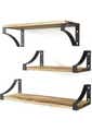 Rustic Wood Floating Shelves Wall Mounted Set of 3-Natural Product dimensions (LWH): Large: 40x15x1.5cm Medium: 35x15x1.5cm Small: 30x15x1.5cm Package dimensions (LWH):18x10x44cm Weight:1.3 Kg Feature • Magically Attractive Storage Shelves: Reorganize your home and free your countertops from clutter with these cute floating shelves. Composed of Paulownia wood boards and matte metal brackets, our functional wall shelves add a decorative touch to your walls while also creating versatile storage space to store and reorganize small items. Perfect for bathroom, bedroom, living room, kitchen, and more. • Suitable for any Contemporary House: Designed with torched finish wood and industrial trapezoid metal brackets, the floating shelves not only enhance the aesthetic flare of any contemporary household, but also serve as a delightful decoration that fits any design style of a room. Buy one or two sets together to fill an empty wall space and display items as you like. • Sturdy and Easy to Assemble: Max Weight Capacity Each: 15kg. These floating shelves are wider and sturdier than others to safely hold collectibles, photos, books, toys, artwork, trophies, small plants and more. Easy to install with all necessary hardware included; you just need to follow the simple instructions and you can assemble in minutes. • Two Decorative Display Modes: Due to the brackets' unique trapezoid design, they have two display styles. Install these shelves with the board on top of the brackets or below, whichever suits your taste. Arrange and use according to how you live to choose your decor accent. Both styles add an air of rustic flair and improve your mood no matter which way you choose. These shelves are a wonderful decoration and great addition to any wall space. Package including: 6 brakets 3 wooden shelves 1bag of screws set