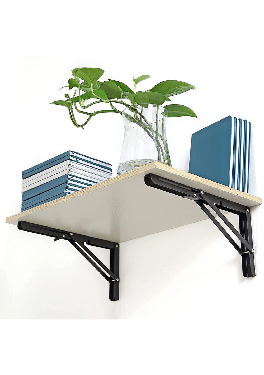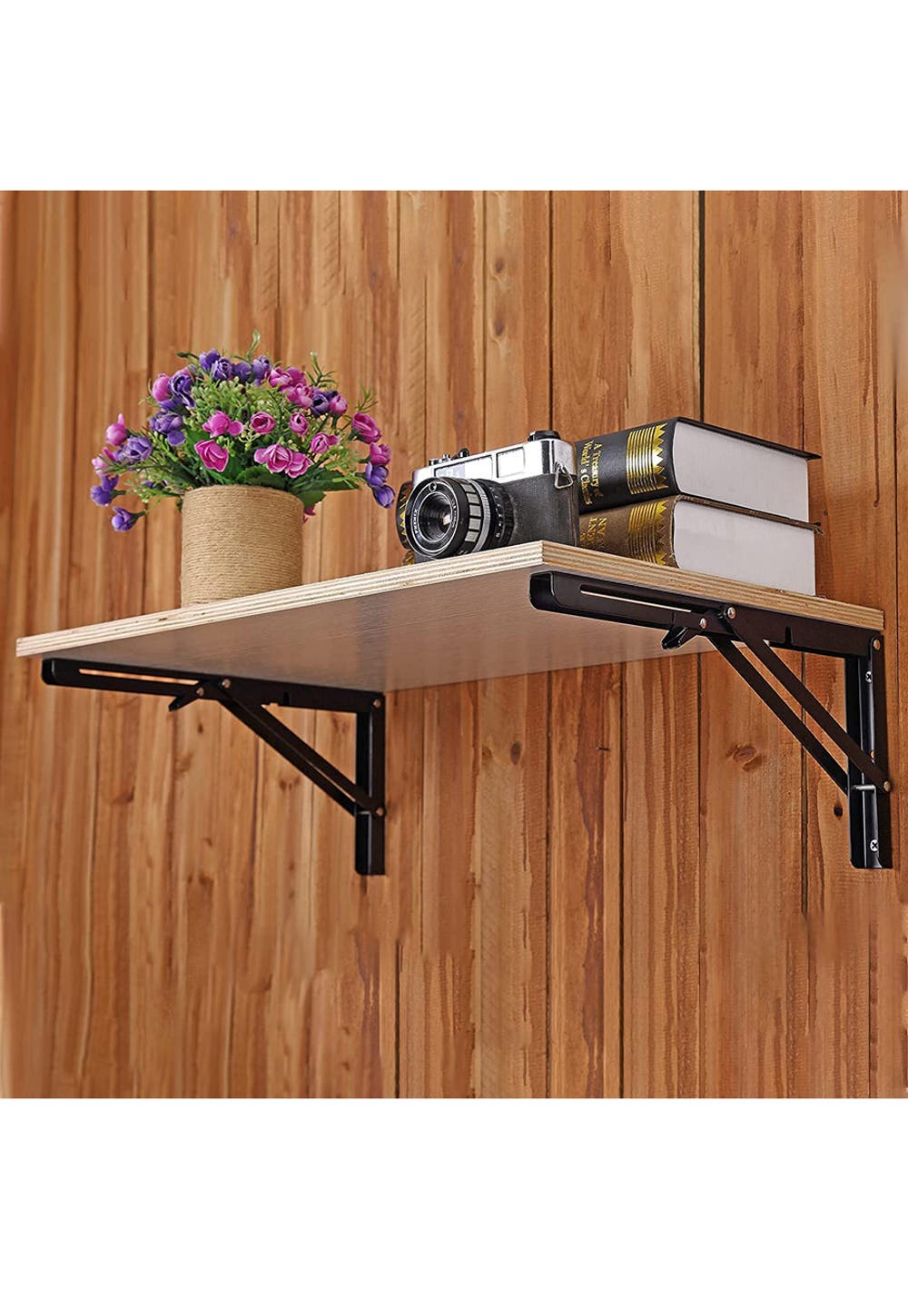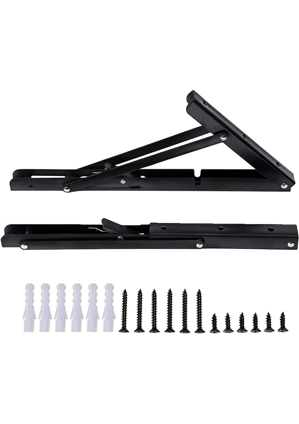 Features  Folding shelf brackets use heavy duty cold rolled steel plate + black paint manufacture, which can effectively isolate the oxygen in the air and ensure that it does not rust for a long time.  The heavy-duty wall shelf is durable and easy to fold. You can use it to compose beautiful fold down table and folding wall table. Supports Max. Load 75 KG  Folding shelf helps you build a beautiful folding wall desk. Suitable for kitchen, laundry room, bathroom, balcony, restaurant, garage and reception desk, recreational vehicle, barbecue, shop.  Package Include  2 x Folding Shelf Bracket  1 x Screws Set  Material: Cold rolled stee Product dimensions (L): 35x17cm Package dimensions (LWH): 36 x 6 x 4 cm Weight: 1.8 kg