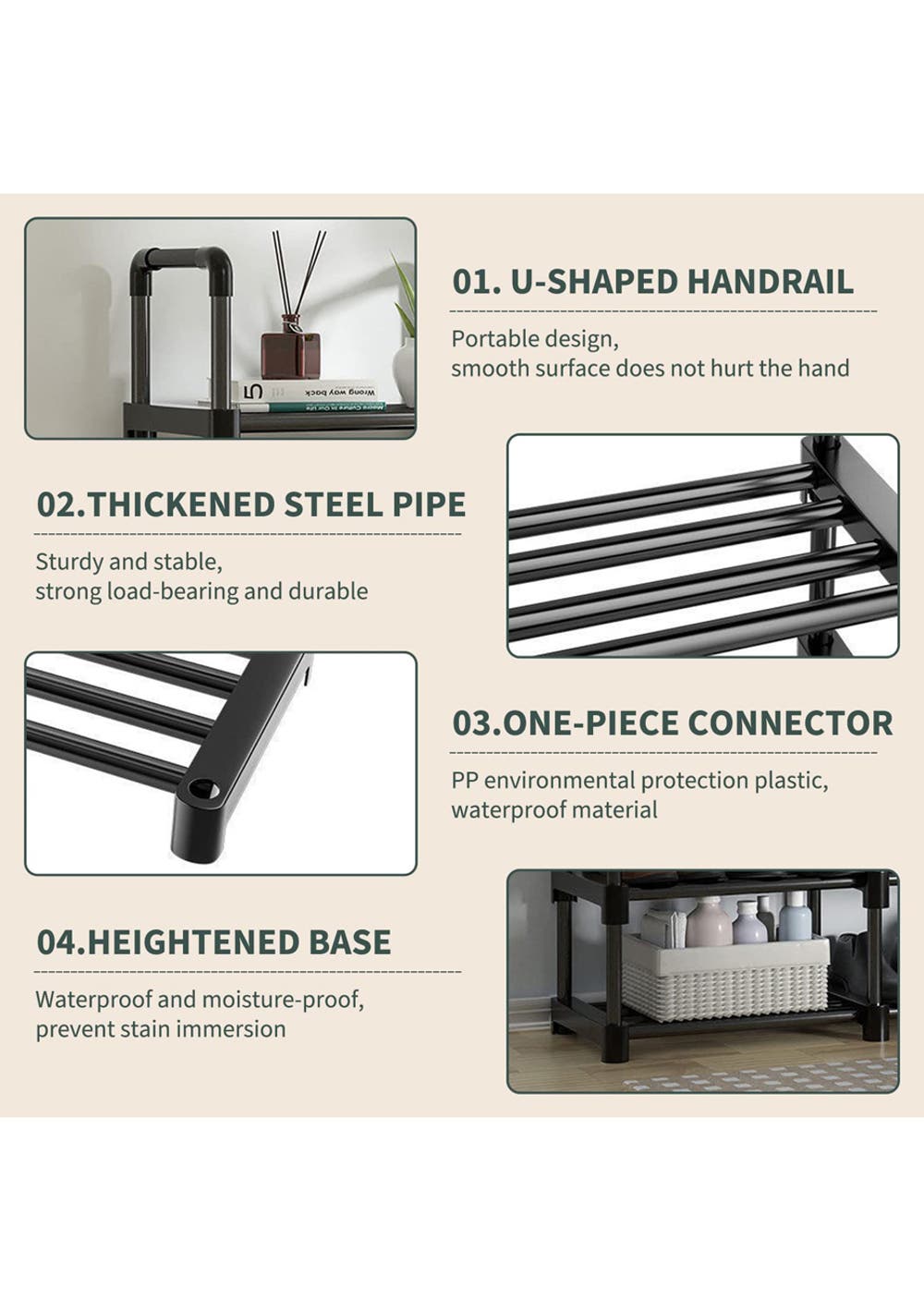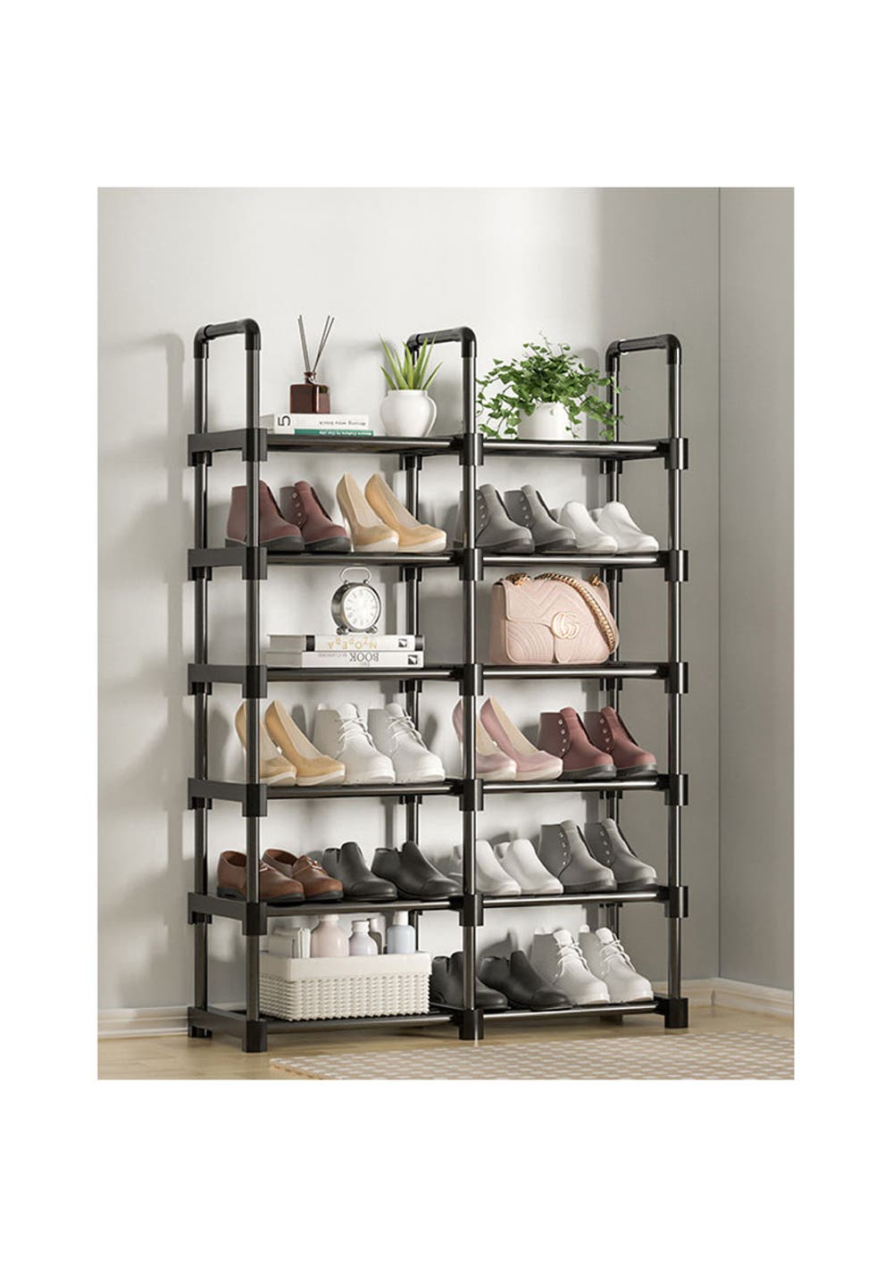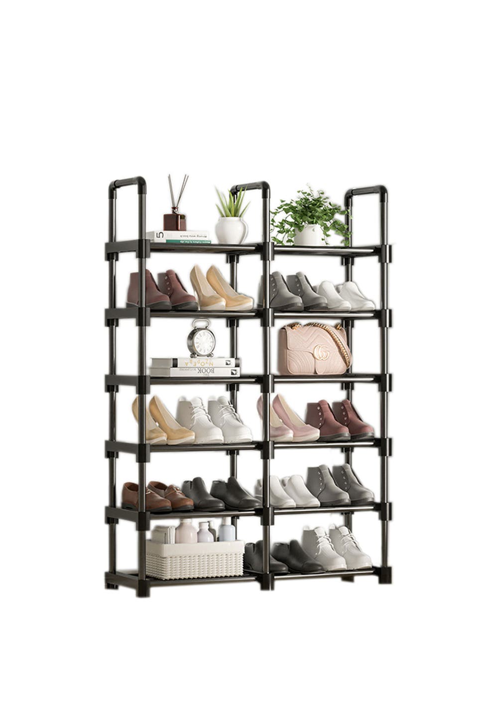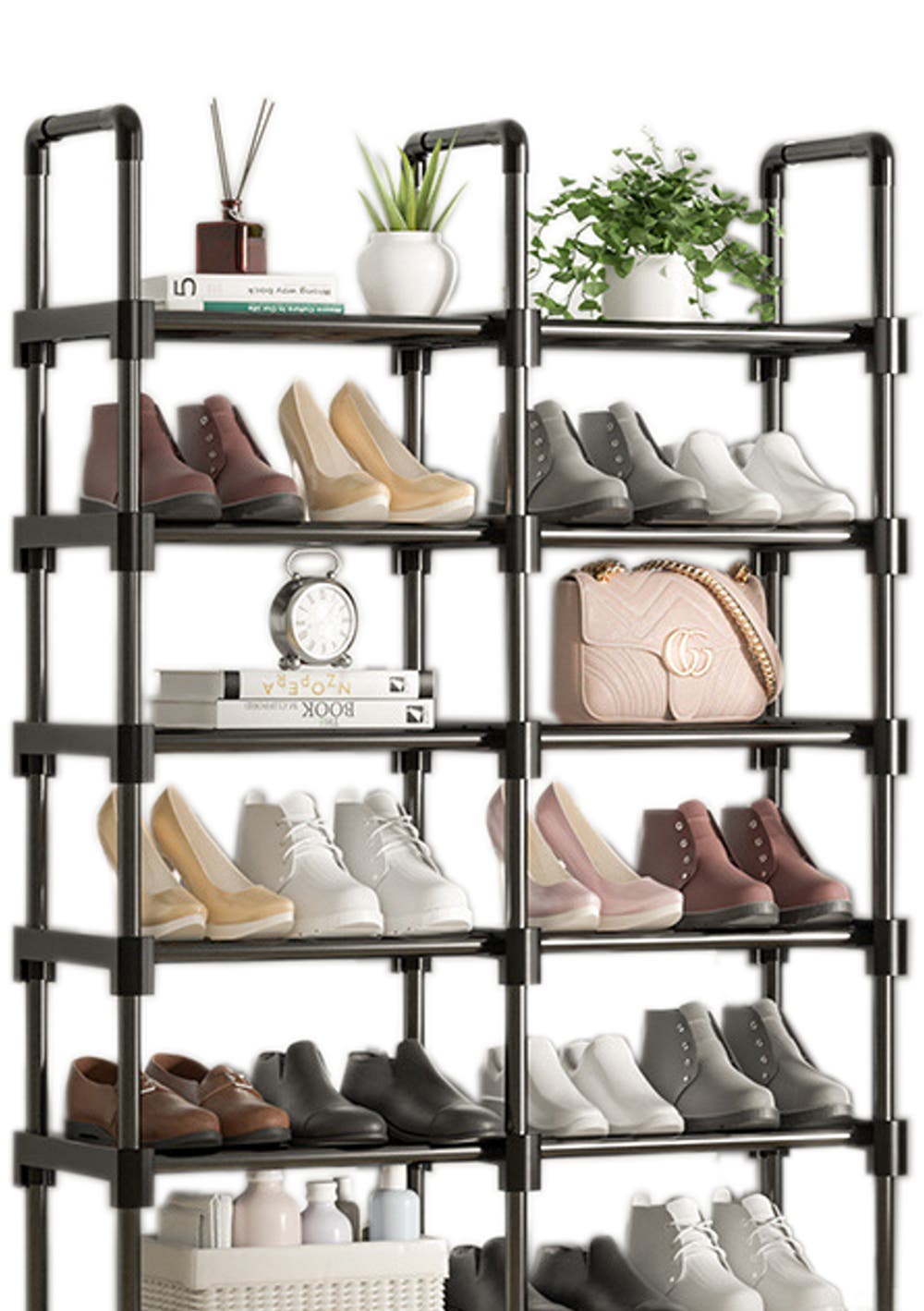 6+6 Tiers Tall Shoe Rack Storage Shelf<br>Material: Metal, PP<br>Product dimensions (LWH): 85×31×106cm<br>Package dimensions (LWH): 43x21x11.5cm<br>Weight: 2.38Kg<br>Features:<br>• Space-Saving Design: With 6+6 tiers, this shoe rack measures 85(L)x 31(W)x 106CM(H), each layer being 16CM high. It stores up to 24 pairs of adult shoes. Layers can be removed to accommodate boots and high heels, without affecting the rack's sturdiness.<br>• Durable and Sturdy: Our shoe organizer is made of powder-coated metal pipes and high-quality plastic parts. The metal pipe makes the shelf capable of bearing heavier loads. The powder-coated finish ensures the pipes will not rust or corrode with normal use.<br>• Multi-Purpose Organizer: This shoe organizer is not just for shoes, but also for bags, toys, towels, sundries, books, plants, and small accessories. It is perfect for your closet, entryway, dormitory, apartment, or garage.<br>• Hassle-Free Installation: Our shoe rack is easy to install without the need for screws or tools.<br>Package Includes:<br>• 1 x Shoe Rack<br>