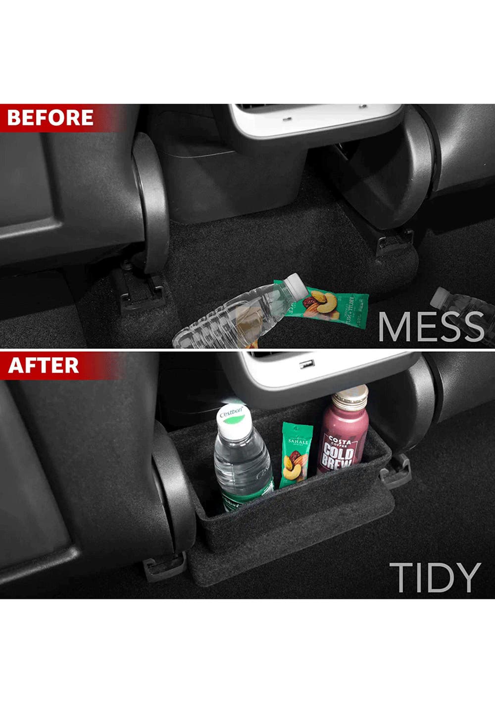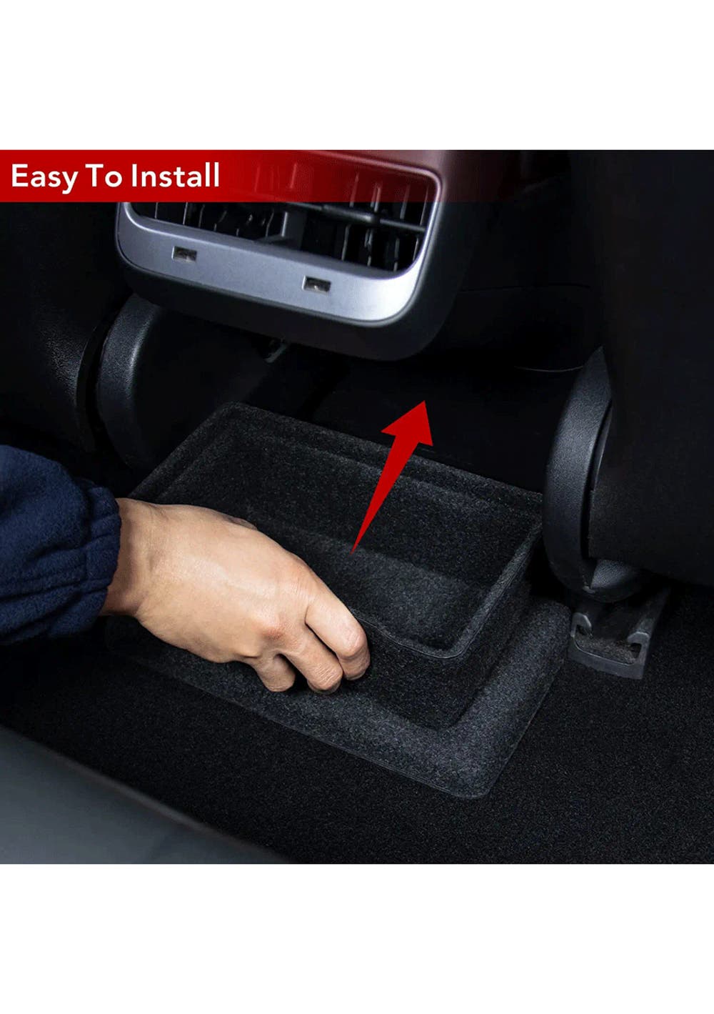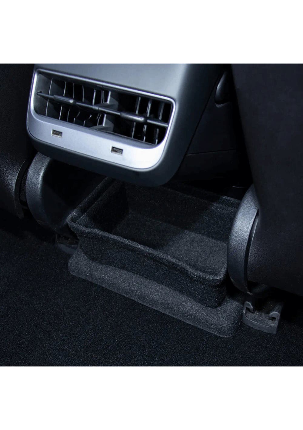 Perfect Match: Rear Seat Storage Cubby and Cup Holder fits perfectly under the rear exhaust port of Model 3, with no gaps and does not affect the footpad.