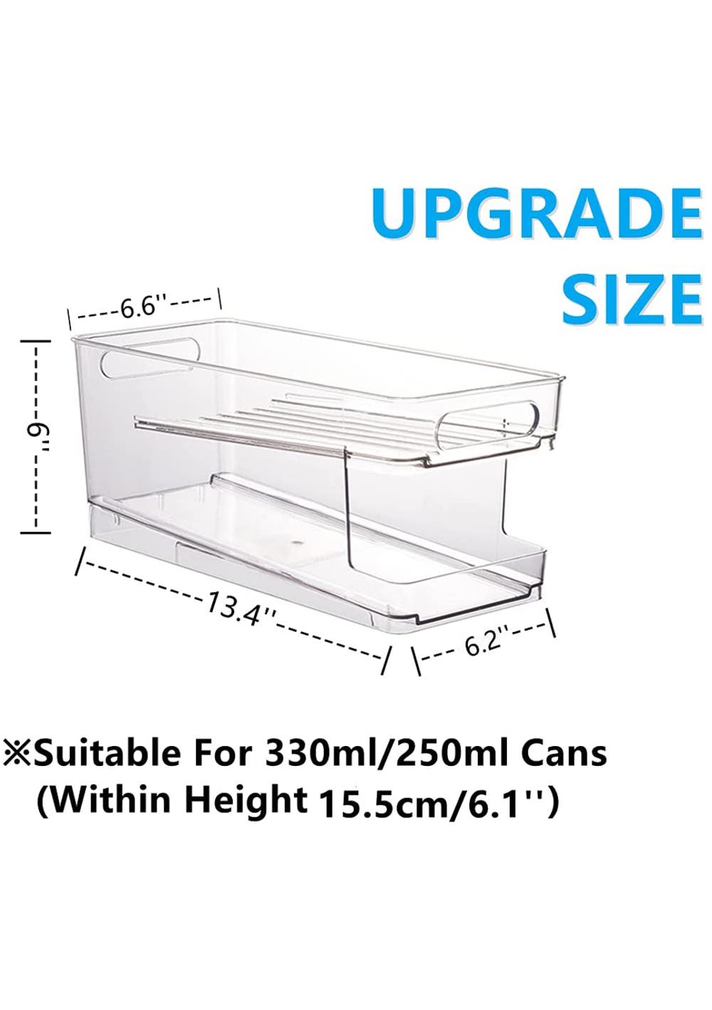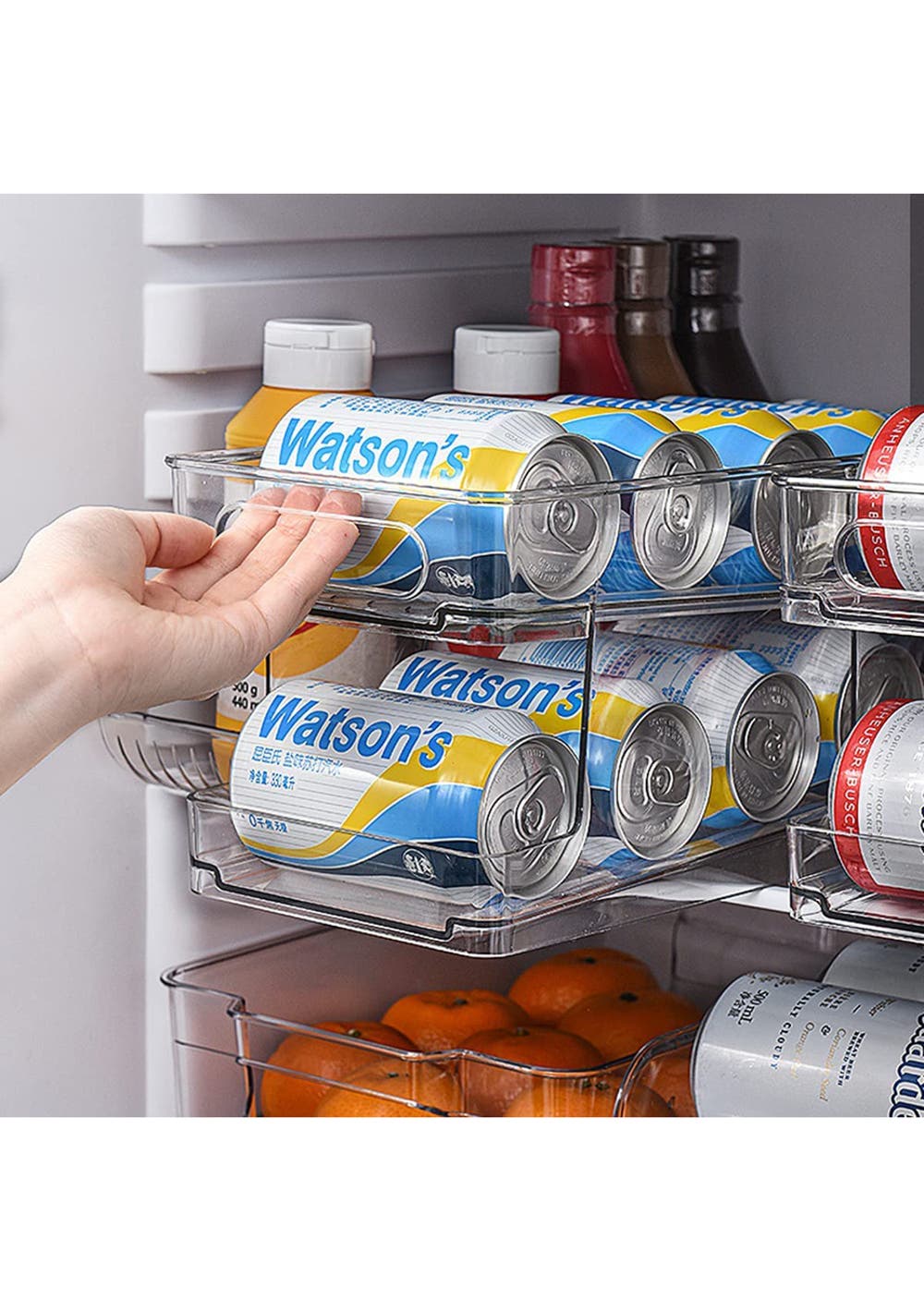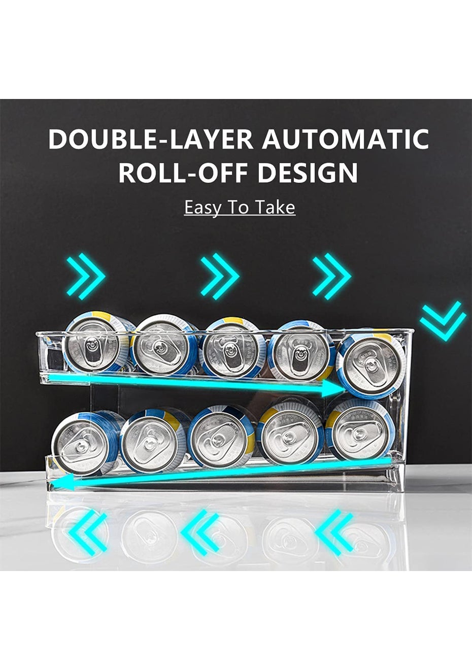 Double-Layer Automatic Rolling Beverage Soda Can Storage Organizer Material: PET Product dimensions (LWH): 34×15.7×15.3cm Package dimensions (LWH): 17 x 18 x 38 cm Weight:700 g KEY FEATURES: SIZE: 34×15.7×15.3cm, the width is increased, suitable for more specifications of beverages and cans on the market. Perfectly for 330ml/12oz cans. For 250ml/12oz cans, there will be 1 INCH gap on both sides. Double-layer can holders for fridge, up to 12 cans can be stored for 330ml/12oz cans.10 cans can be stored for 250ml/12oz cans. Automatic roll-down design--When you take out the cans from the lower layer, the upper cans will automatically roll off to replenish, which is very convenient and interesting. large arc-shaped groove buckle, more convenient to take. This beverage can holder for refrigerators is made of high-quality food-grade PET material, BPA-free and fluorine-free, allowing you to use it more safely and securely Package Include: 1 x Double-Layer Automatic Rolling Beverage Soda Can Storage Organizer