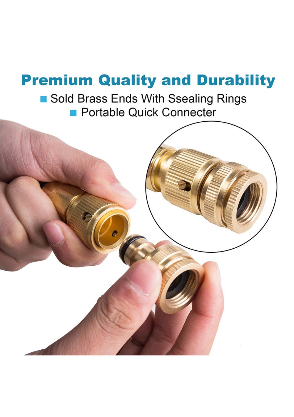  This expanding hose is made from a durable latex core and a high strength polyester outer layer for excellent durability.  The solid brass connector will not break.  The hose is 5 m long and expands up to 15 m with water pressure.  ***The length of hose varies with water pressure, expanding up to 15 m  Working Temperature: 5° C-45° C  Water Pressure: up to 140 psi Package Includes:  1 x Water Hose  1 x Spray  1 x 2 in 1 adapter