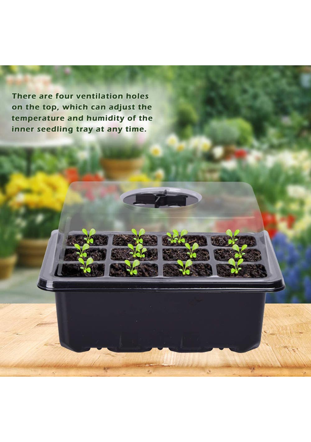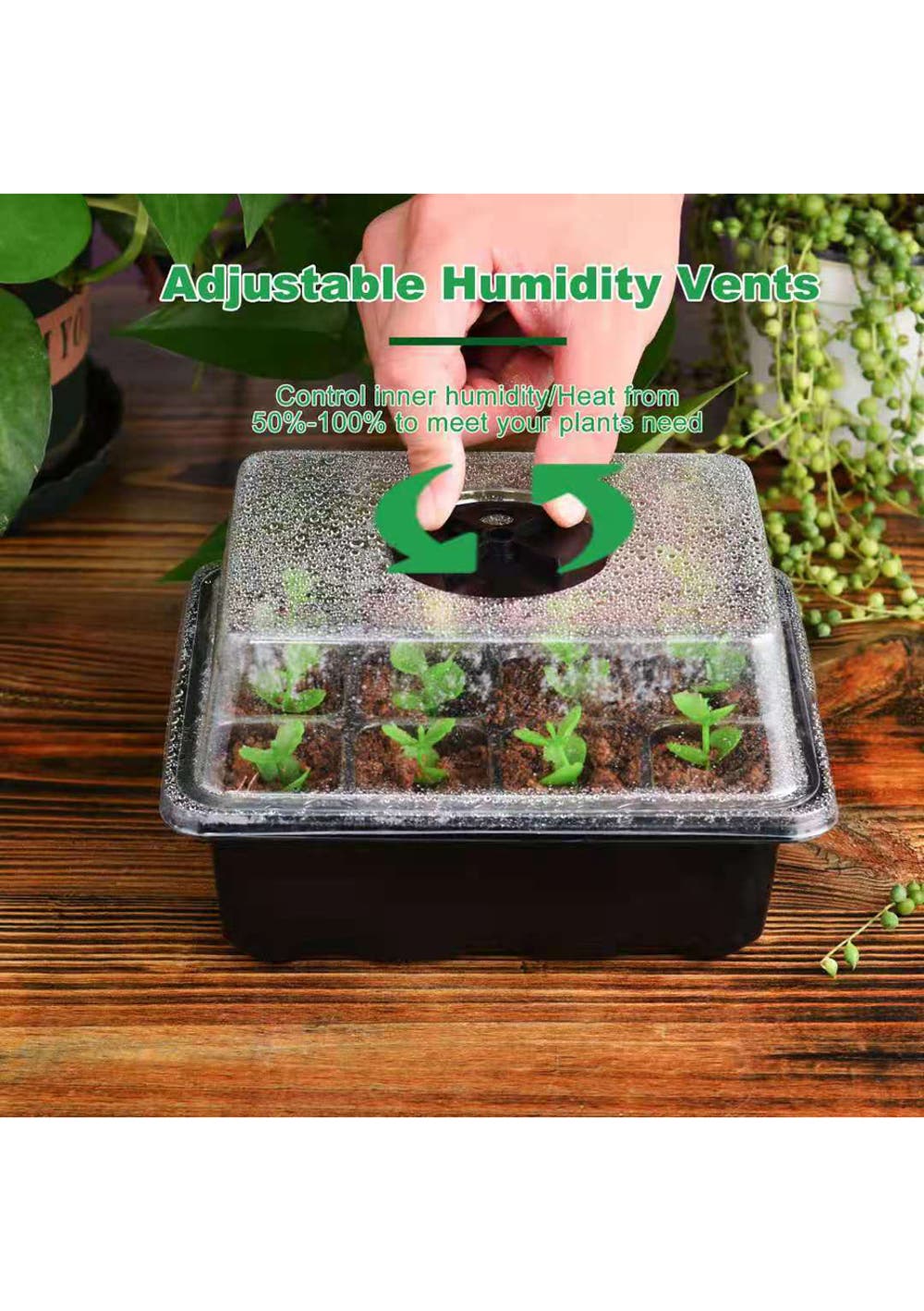 10 Packs 12 Cells Seed Starter Tray Seed Starter Kit <br>Material: PET PS<br>Product dimensions (LWH): 19×15×11.5cm<br>Package dimensions (LWH): 20x16x20cm<br>Weight: 80g each kit <br>Features<br> Ventilation Holes: Our seed starter pots are equipped with humidity-adjustable ventilation domes, which can easily adjust the indoor temperature and humidity which improves the germination rate of seeds along with the survival rate of seedlings.<br> High Quality: Our seed starter tray with domes made of durable, anti-corrosive environmentally friendly plastic. The transparent top allows you to observe the germination and growth of seeds at any time.<br> Drainage Holes + Trays: Drainage holes designed at the bottom of the nursery cell can drain excess water. The trays collect excess water and soil to keeping all clean and tidy.<br> The integrated design of generously sized 12-seedling cells make it convenient to manage the growth of seedlings and convenient for transportation<br> Package Include<br> 10 x 12 Cells Seed Starter Tray Kit with Humidity Adjustable Dom