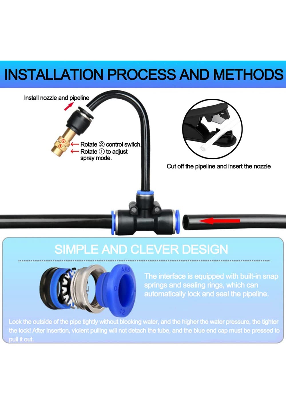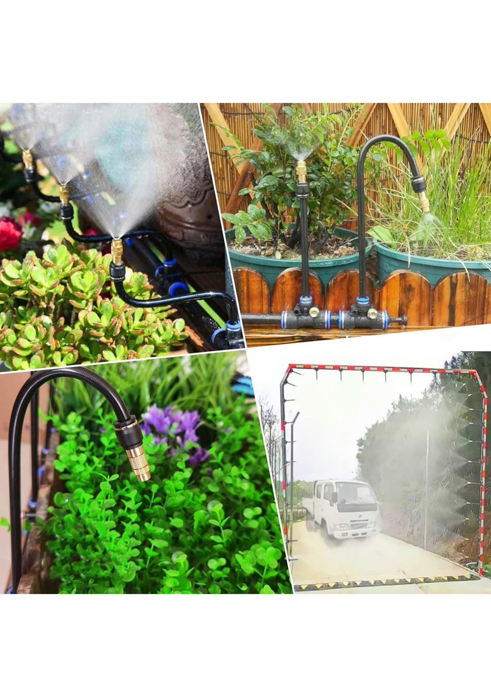 Flexible and Versatile Use: Updated nozzles and support rods can rotate 360 degrees, providing a larger spray radius. The system's versatility allows for ground placement, fence fastening, or aerial installation in various settings like lawns, gardens, and greenhouses.