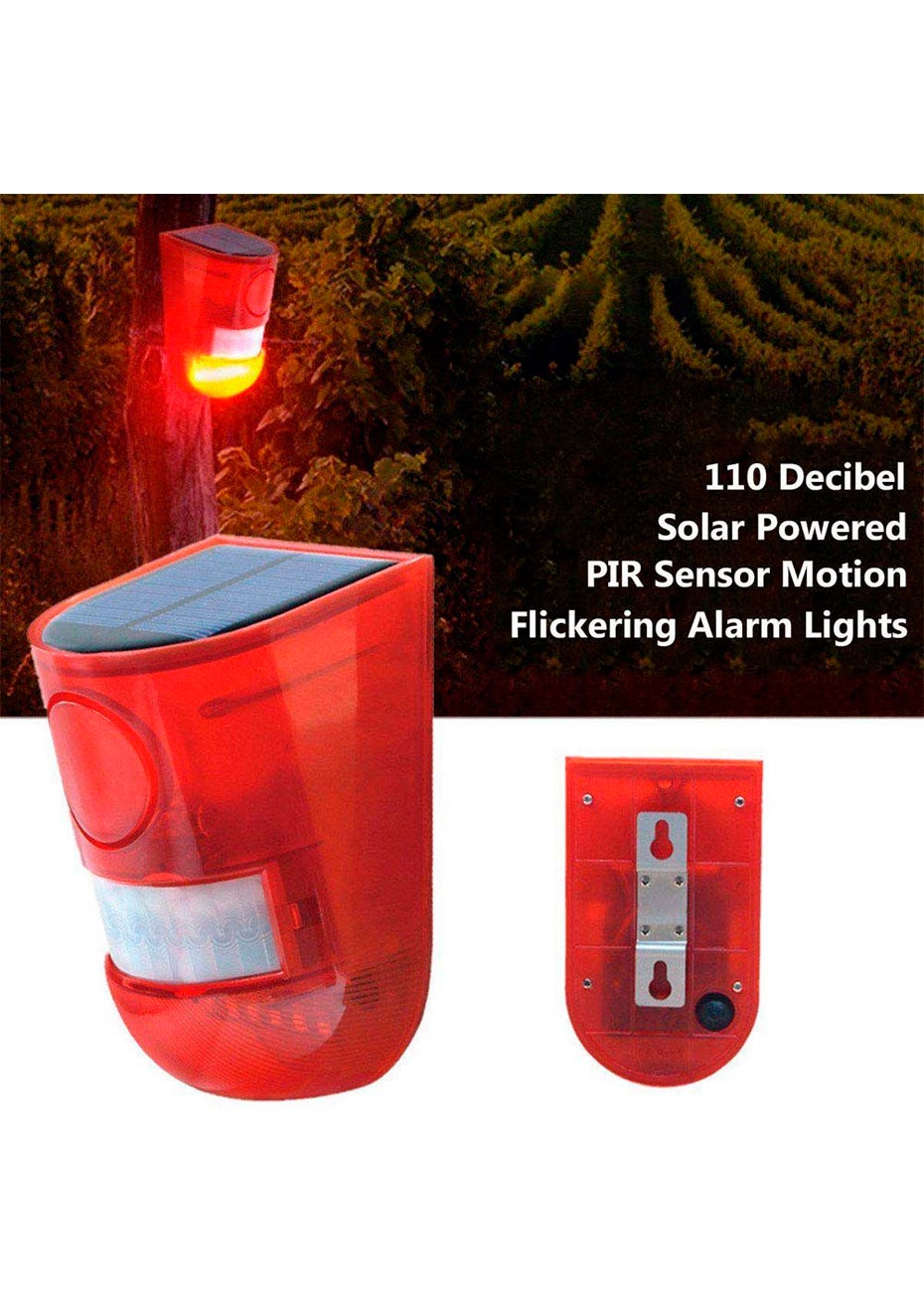  Sensitive motion sensor will detect any movement within 5-8 meter and activate the sound light alarm, sound arise and strobe light on.  Built-in lithium battery, can be rechargeable by solar energy to ensure it can be recycled for a long time.  Daytime mode (24-hour inductive acousto-optic alarm); night mode (no induction during the day, audible and visual alarm at night).  Charging time: 6-8 hours.5-8 meters sensing distance ,sensing angle 125°, 110dB alarm and 1000m visible flash light.  The Solar Alarm Light Applicable for home, farm, orchard construction sites where requiring security alarm. Whats in the box  1 x 110dB Loud Outdoor Solar Alarm Flashing Light  1 x Screw set  1 x Manual