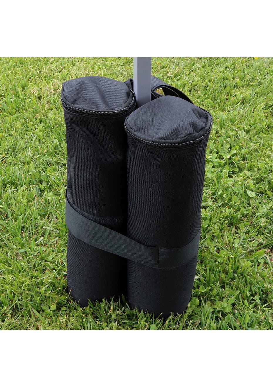  Must have accessories for securing your canopies in windy weather  Each bag holds up to 15kg of sand, rocks, pea gravel or other easily accessible materials. Never worry about tents go sailing.  The bag is sealed with zipper. No like other use Velcro to close will leak out from the top. Conveniently zip right over the sand and don't snag on anything.  The weight bags are made of durable 600D oxford fabric with PVC coating and built to last.  When you're done, dump the sand and you've got flat bags again so they take up no room in your car.  There is a hook and loop strap attached to each weight bag adding extra security in all types of weather and the Velcro strap wrap around and fastening the legs Package Includes  1 x Canopy Sand Bags (Does Not included sand)