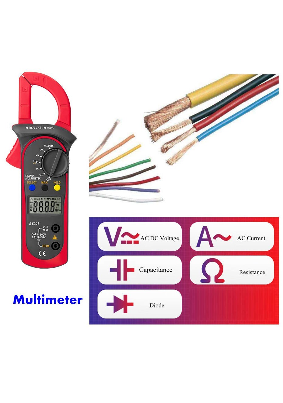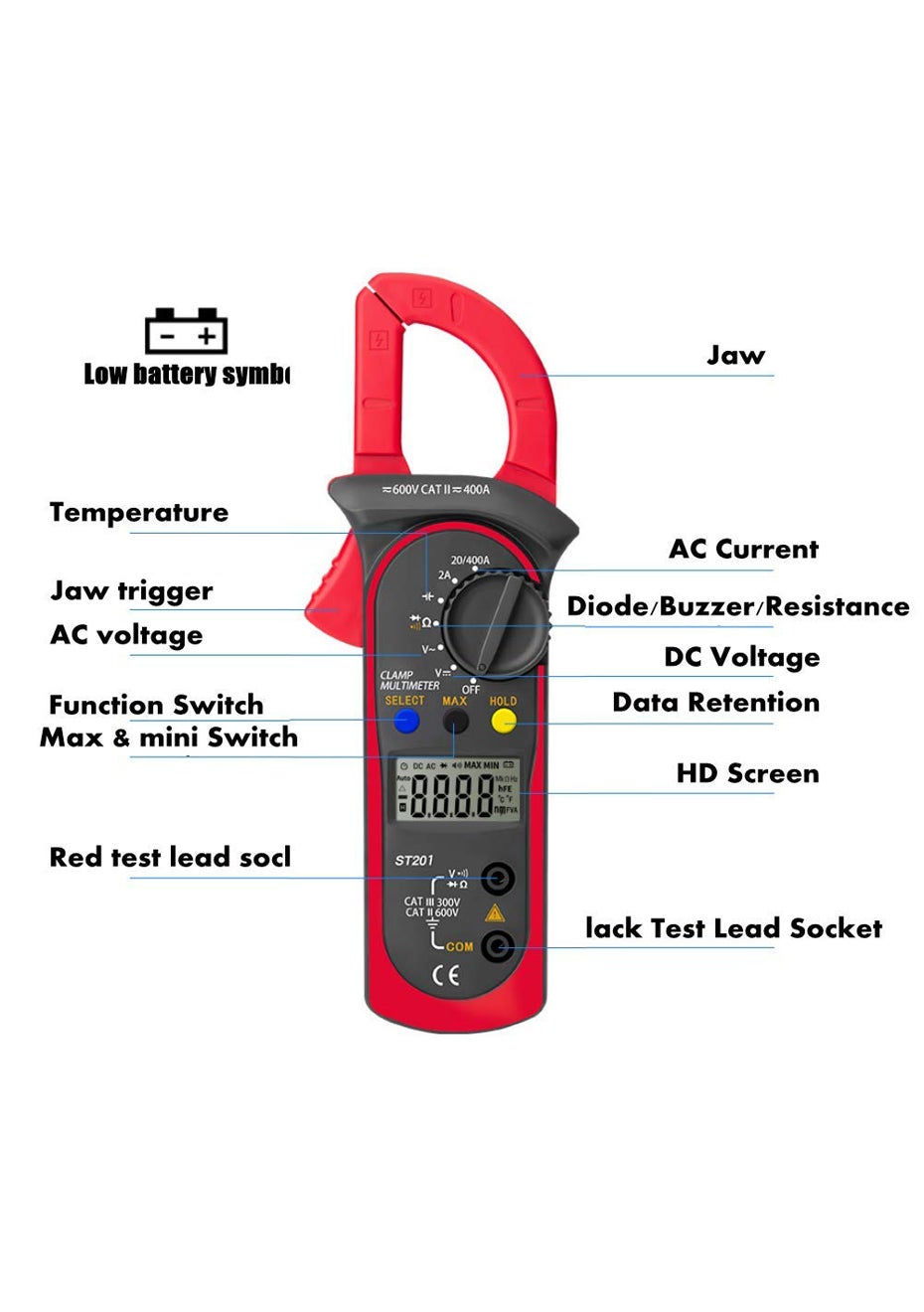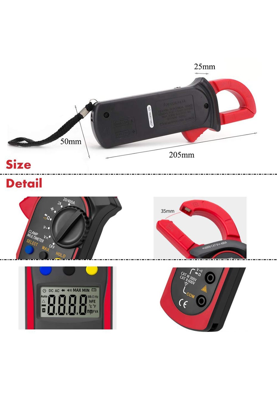 Digital Clamp Meter Multimeter Material: ABS Package dimensions (LWH): 25X12X5cm Weight: 370G Key Features: High Precision Measurement: This digital clamp meter offers 3 3/4-digit automatic readings, delivering stable performance and precise measurements. With its high reliability and overload protection, it's an essential tool for both professionals and DIY enthusiasts. Clear LCD Display: The multimeter features an easy-to-read LCD display, powered by AAA batteries with a boost power supply. The display ensures clear visibility of readings, even in low-light conditions. Comprehensive Testing Range: This versatile clamp meter can measure DC voltage, AC voltage, AC current up to 600A, resistance, capacitance, diode functionality, and continuity. It’s perfect for a wide range of electrical and electronic applications. Advanced Measuring Capabilities: The meter provides detailed measurement ranges: DC Voltage: 200mV, 2V, 20V, 200V, 600V AC Voltage: 200mV, 2V, 20V, 200V, 600V AC Current: 2A, 20A, 400A Capacitance: 40nF, 400nF, 4uF, 40uF, 400uF Resistance: 200Ω, 2KΩ, 20KΩ, 200KΩ, 2MΩ, 20MΩ Durable and Portable Design: Made from robust ABS material, the multimeter is built to last. Its compact size and included storage bag make it easy to carry and store, ensuring it's always ready for use. Package Includes: 1x Clamp Ammeter 2 X Batteries(AAA) 2x Test Leads 1x Storage Bag 1x Instruction Manual