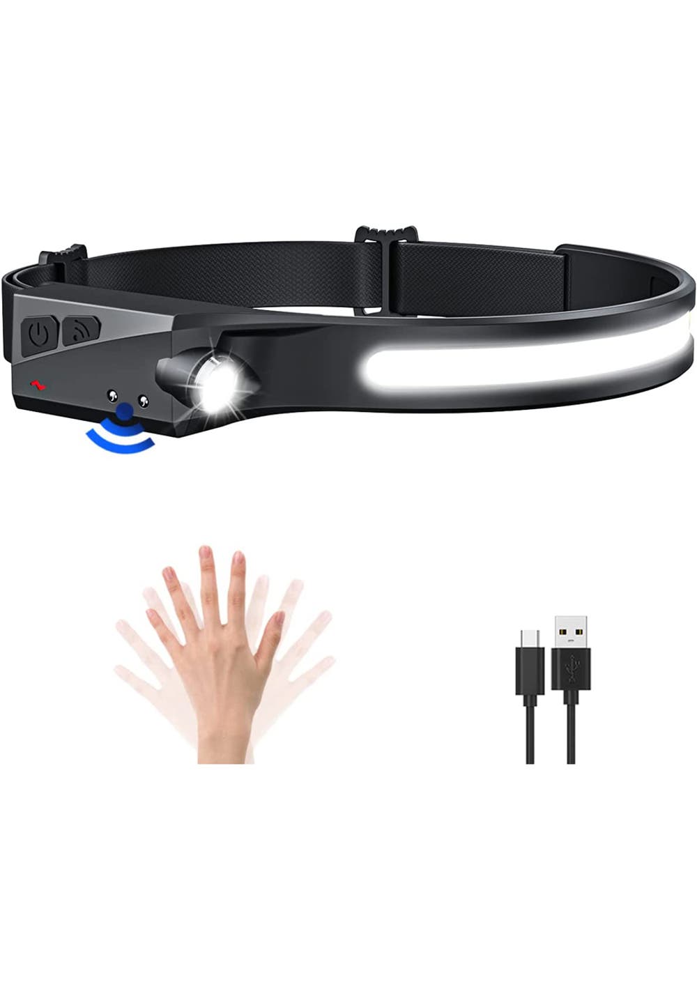 230°Wide Beam Headlight With Motion Sensor <br>Material: ABS XPE<br>Product dimensions (LWH): Φ31×3.2cm<br>Package dimensions (LWH): 10x6x3.7cm<br>Weight: 75g<br>About this item<br>• Super Bright and Wide Beam: Featuring a 12CM super-bright COB wide beam, this headlamp provides maximum 230° wide-angle illumination. With 350-lumens brightness and a 45M distance output, it's suitable for various indoor and outdoor activities including camping, hiking, jogging, cycling, walking, mountaineering, fishing, hunting, reading, car repairing, or emergency situations.<br>• Secure and Rechargeable: For your safety, our headlamp is powered by a built-in 1200mAh lithium polymer battery. It provides 2.5-8 hours of lighting time on SOS mode and can be quickly recharged using the included USB-C cable. No need to worry about battery replacement, saving you money and time.<br>• Dual Lamp Source and 5 Light Modes: The headlamp has two lamp sources: a front LED COB as a floodlight, and a right-side XPE as a spotlight. The headlamp features 5 cool white light modes: COB High Mode, COB Low Mode, XPE High Mode, XPE Low Mode, and SOS Strobe Mode. The SOS Strobe Mode can be activated by long-pressing the power button, causing both the COB and XPE to flash simultaneously.<br>• Hands-Free Motion Sensor Control: The headlamp is equipped with an advanced gesture motion sensor function. This allows you to turn on or off the headlight by simply waving your hand within a 5cm induction range. When the headlight is on, press the sensor button to enable sensor mode (the indicator light will change from red to yellow). Lighting modes can still be adjusted with the power switch while in sensor mode.<br>• Lightweight, Durable, and Water-Resistant: Made from skin-friendly silicone and featuring an adjustable elastic headband, this headlamp is comfortable to wear and fits most hardhats and helmets. It's lightweight at only75G and designed to be compact, collapsible, and easy to carry in your pocket. With an IPX4 water-resistant rating, it's suitable for outdoor activities in rain or snow.<br>Package Includes:<br>• 1 * Rechargeable Ultra-Bright Headlamp<br>• 1 * Type-C Charging Cable<br><br><br><br><br><br><br>