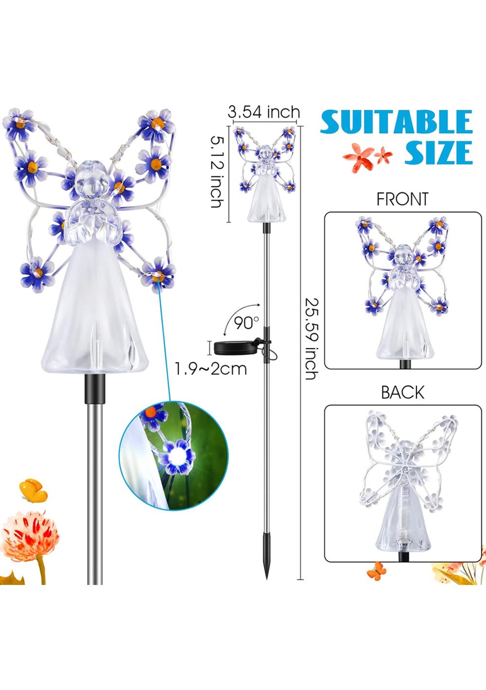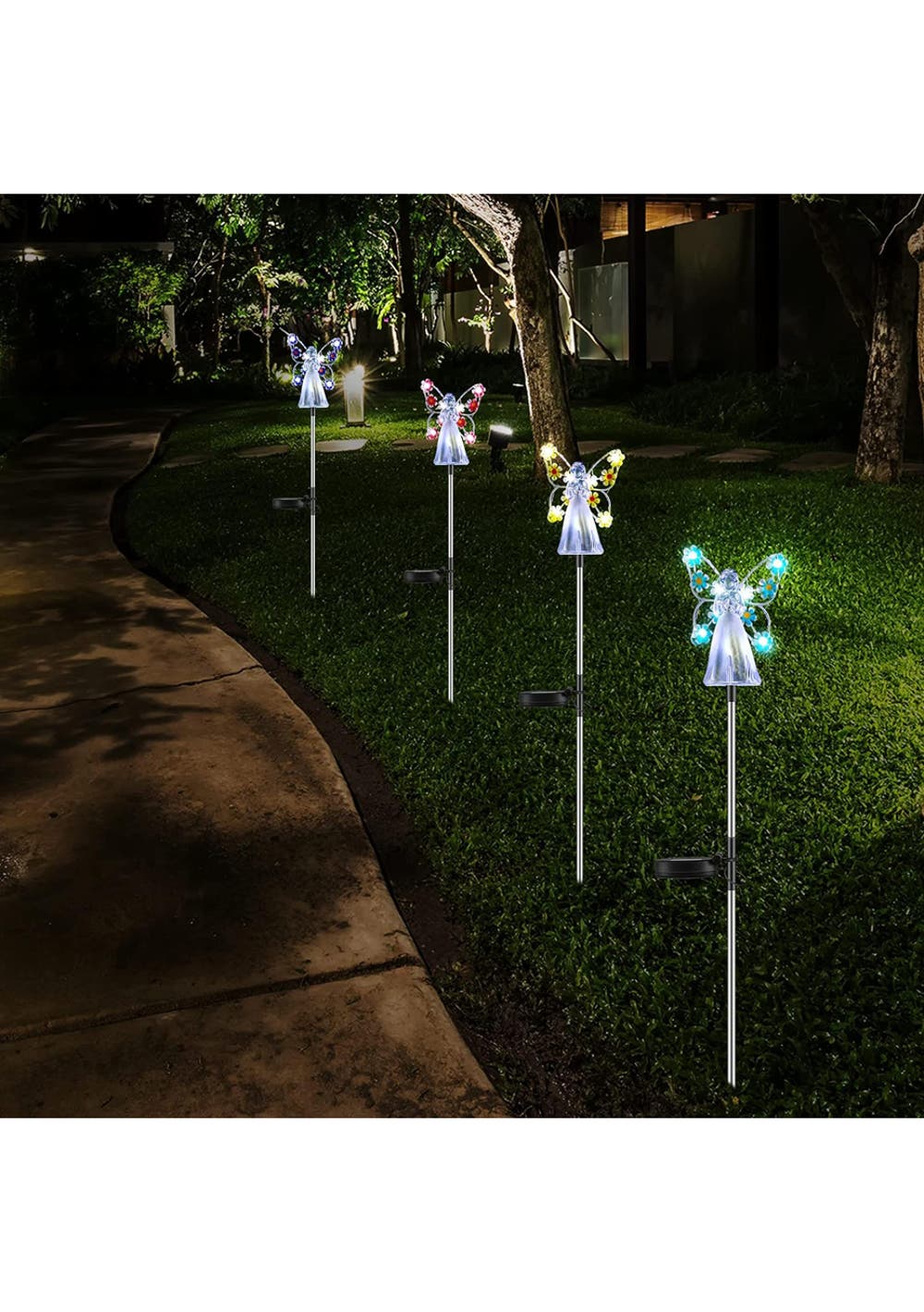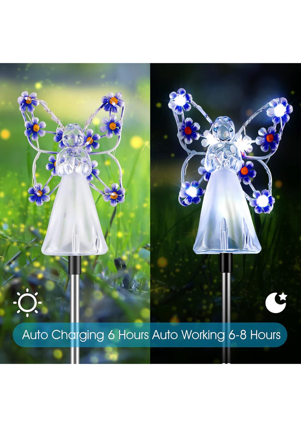 Solar Angel Garden Stake Lights Material: ABS+201 stainless steel Package dimensions (LWH):41X11X8CM Weight: 270G Enchanting Solar Lights: solar-powered, angelic lights offering an enchanting mix of purple, pink, blue, and yellow hues to illuminate and add a mystical touch to your garden after dusk. Memorable Gifting Choice: With an exquisite angelic design adorned with floral luminescence, these garden stakes symbolize love and hope, making them a heartwarming gift for loved ones or as a respectful tribute in cemeteries. Eco-friendly Design: Harnessing the power of the sun, these lights charge by day and cast a gentle glow by night, providing a sustainable and cost-effective lighting solution. Durable Craftsmanship: Constructed from robust acrylic and stainless steel, resistant to UV rays, weathering, and time, ensuring long-lasting radiance and charm. Versatile Decor: Perfect for a range of outdoor settings, these angelic lights beautifully accentuate gardens, terraces, pathways, and more, casting serene beauty wherever they stand. Package Contents: 1 x Solar Angel Garden Stake Lights