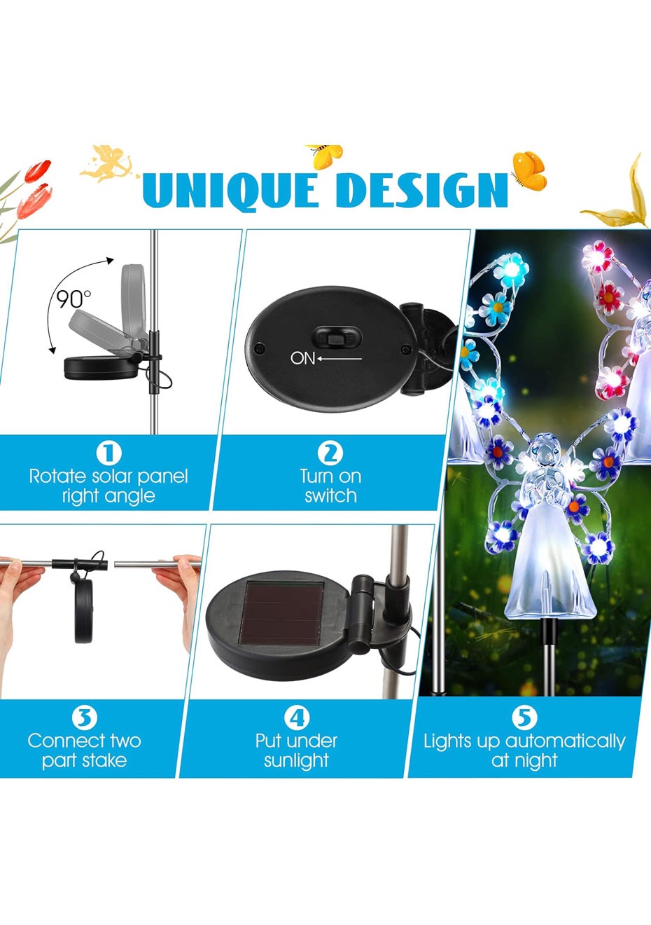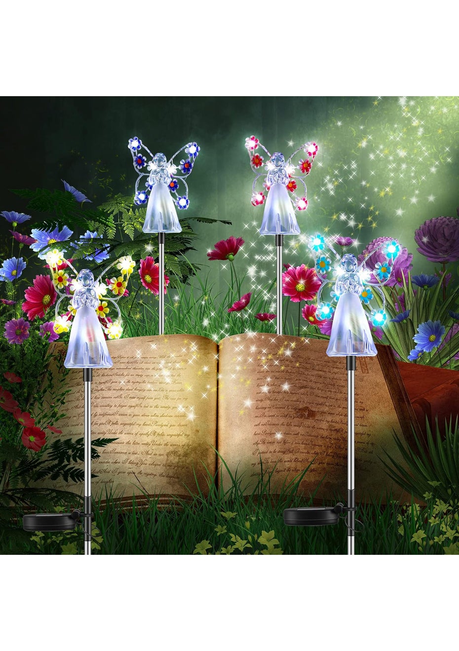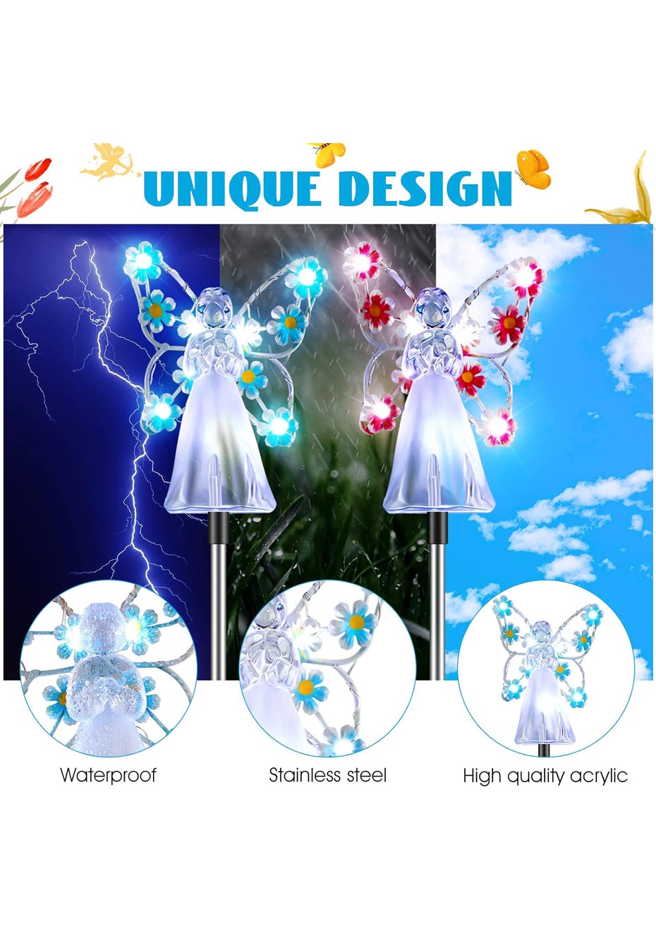 Solar Angel Garden Stake Lights Material: ABS+201 stainless steel Package dimensions (LWH):41X11X8CM Weight: 270G Enchanting Solar Lights: solar-powered, angelic lights offering an enchanting mix of purple, pink, blue, and yellow hues to illuminate and add a mystical touch to your garden after dusk. Memorable Gifting Choice: With an exquisite angelic design adorned with floral luminescence, these garden stakes symbolize love and hope, making them a heartwarming gift for loved ones or as a respectful tribute in cemeteries. Eco-friendly Design: Harnessing the power of the sun, these lights charge by day and cast a gentle glow by night, providing a sustainable and cost-effective lighting solution. Durable Craftsmanship: Constructed from robust acrylic and stainless steel, resistant to UV rays, weathering, and time, ensuring long-lasting radiance and charm. Versatile Decor: Perfect for a range of outdoor settings, these angelic lights beautifully accentuate gardens, terraces, pathways, and more, casting serene beauty wherever they stand. Package Contents: 1 x Solar Angel Garden Stake Lights