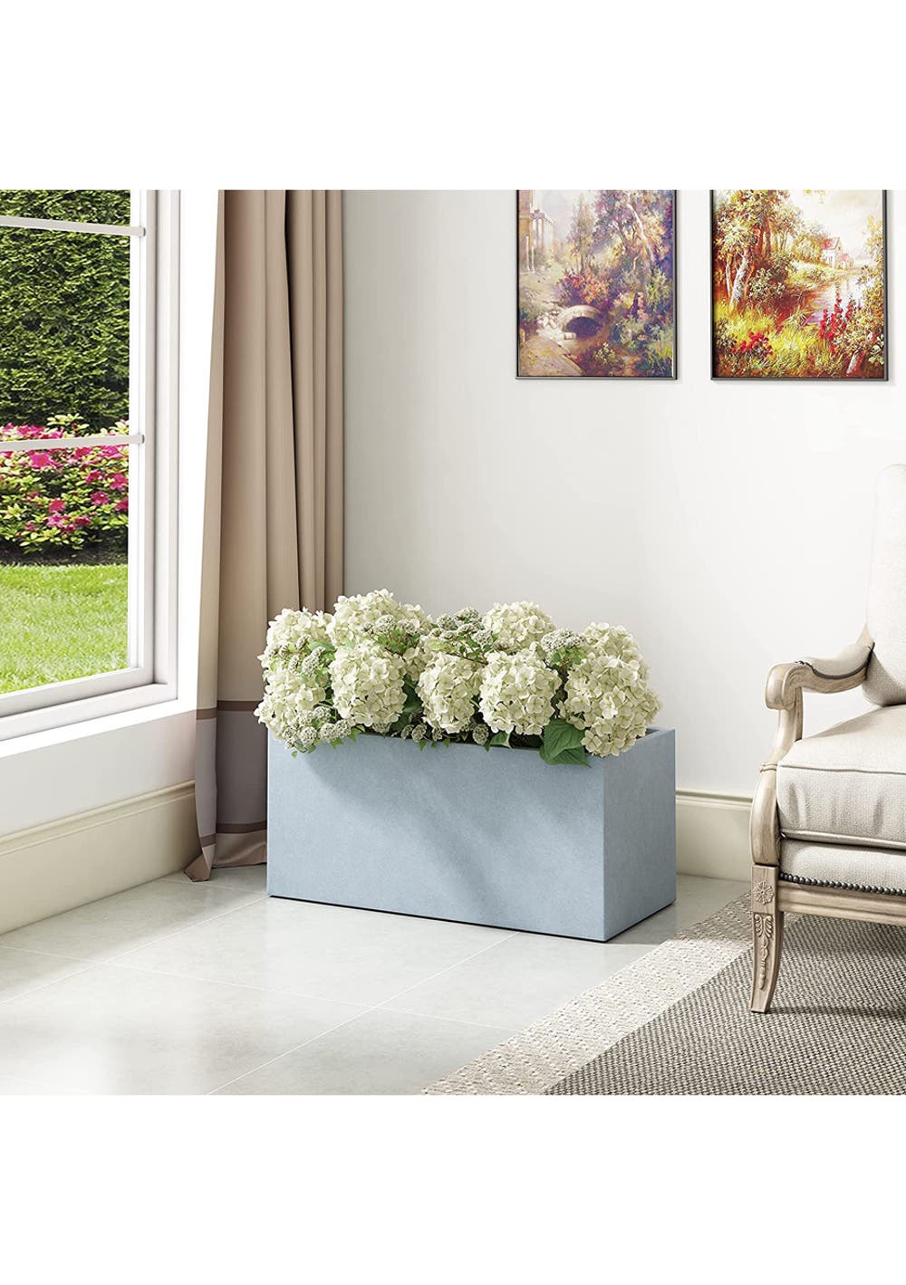 Create a modern space using these tall wide planters, where the straight lines and solid light gray finish are a hot trend in modern landscape designs