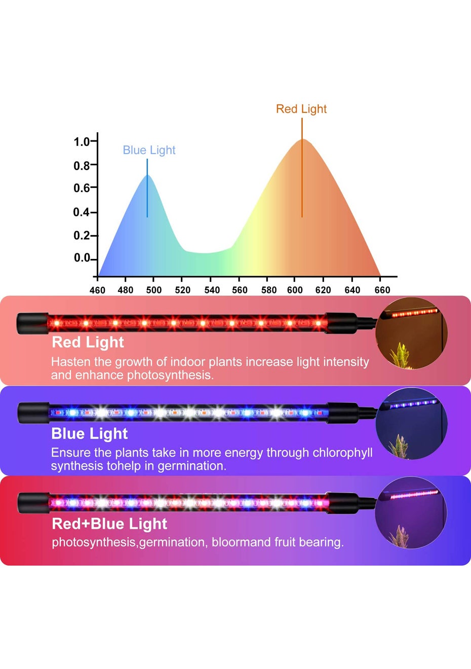 This grow lamp is made up of 80 efficient growing LED lamps (52 red and 28 blue), our led lamp provides 10 brightness settings ranging from 10% to 100%, and 3 color modes (Red Light, Blue Light & Mixed Light) to supplement the lack of natural sunlight and promoted the growth of plants at all stages