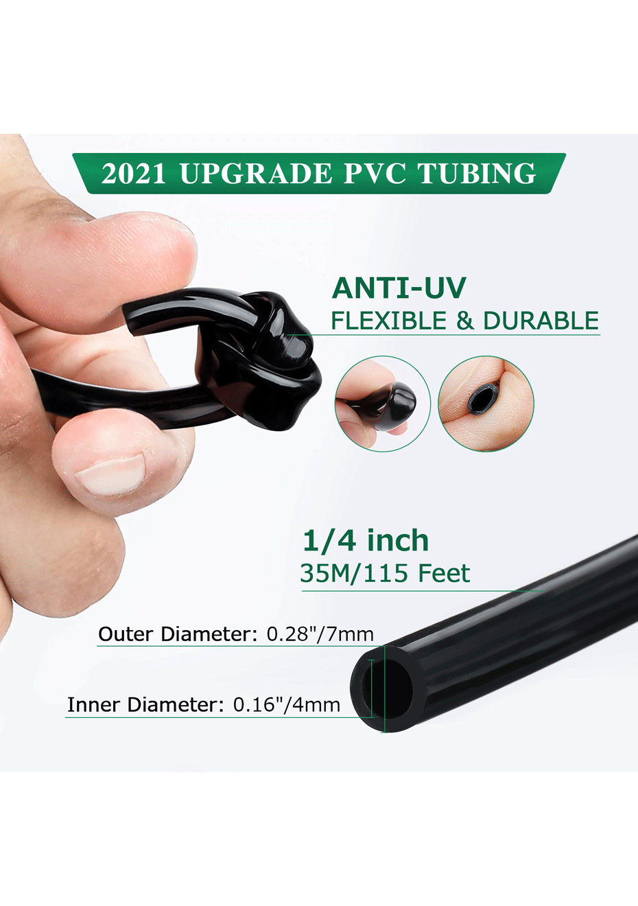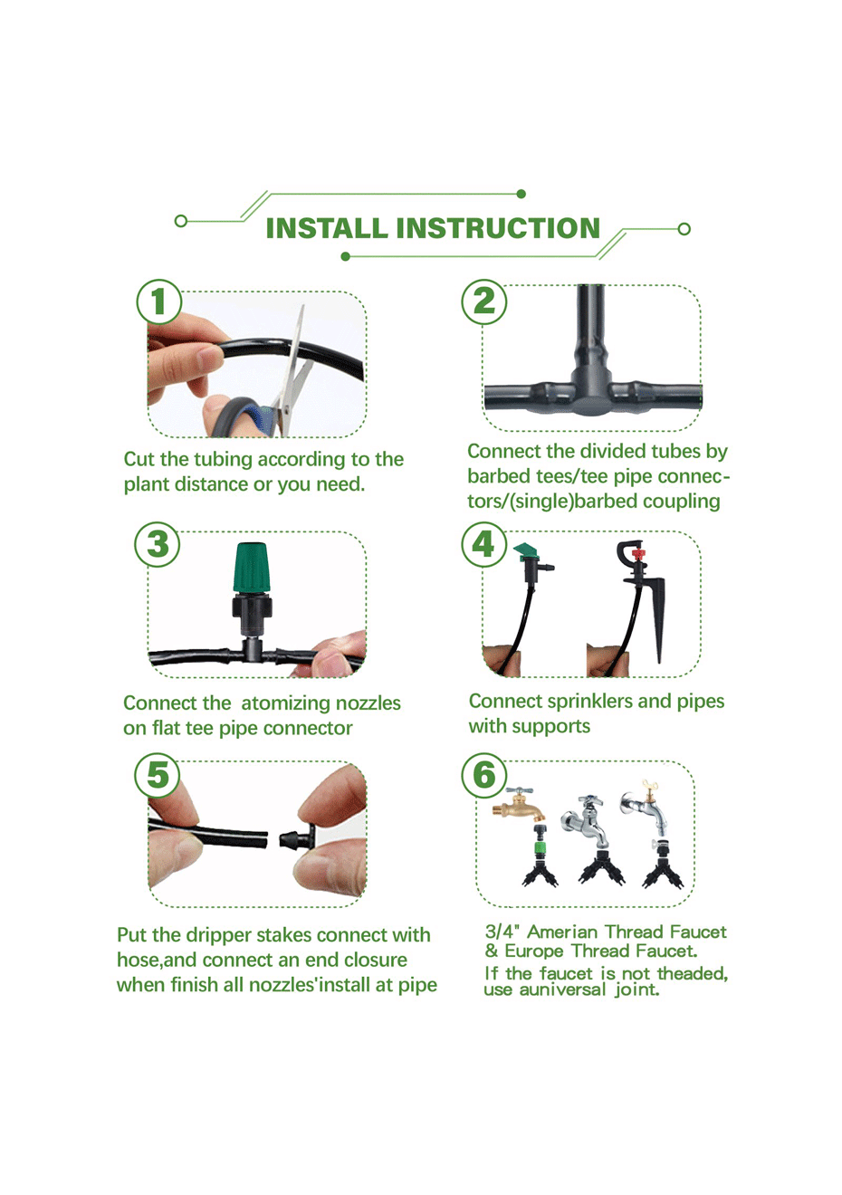 Notice - The amount of water from the dropper is affected by water pressure and other factors. When the water pressure is low, the water performance is poor at the end. It is recommended to use several pipes at the same time. Each pipe connects a certain number of drip heads according to the actual water pressure.