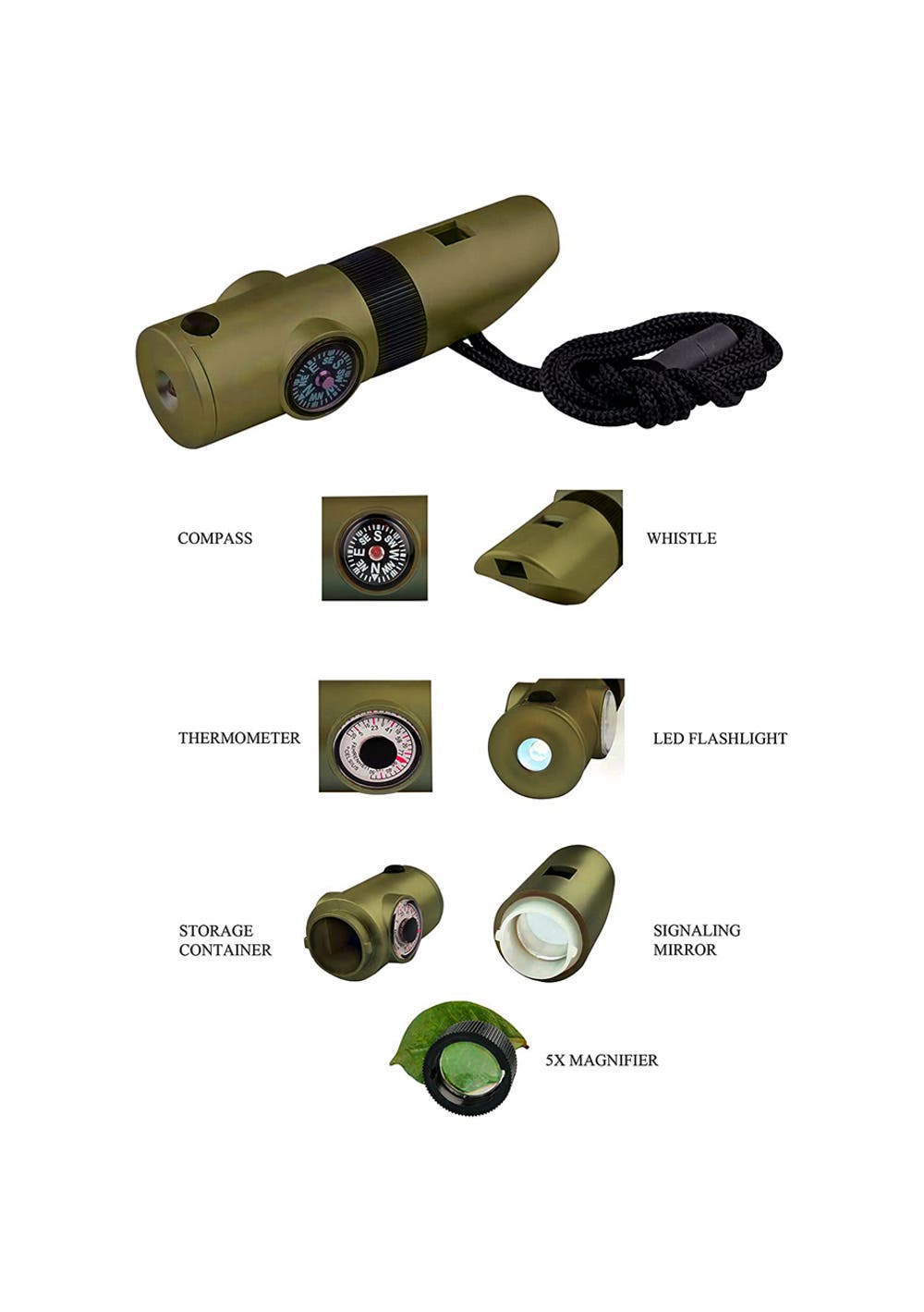 Includes: whistle, magnifier, flashlight, storage container, compass, thermometer & signaling mirror