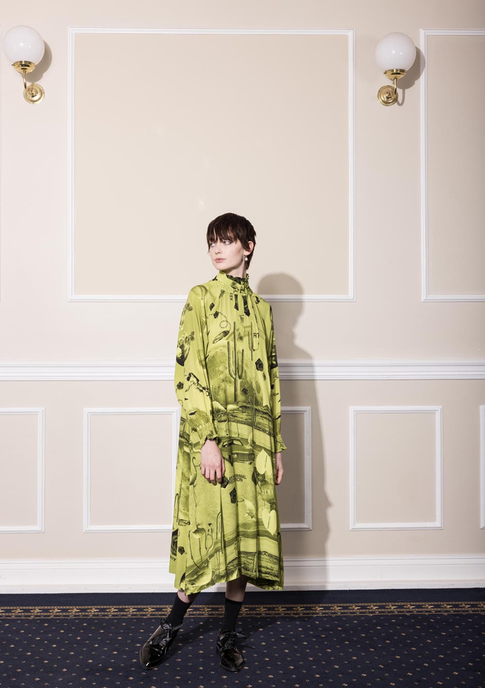 An alternate world, ‘NEON DESSERT’ professes a yearning for a futuristic affair. An obscure romance between 70’s retro glamour and sci-fi intrigue. At the heart, a bold, eccentric print in neon yellow, overlayed with duo tone surrealist photocopy. The Desert Leisure Dress has a high shirring mock neckline with billowy sleeves detailing and neck ties. Effortlessly classic dress that you can be dressed up or dressed down with your all time fave sneaks for a quick fix or over pants with some spike heels. A total must have on your wardrobe that will surely stand the test of time. Note: The garment's print is differently placed, each piece cut individually. the model is wearing an original print and not two are the same. Made in 100% Viscose and printed with non toxic water based inks.