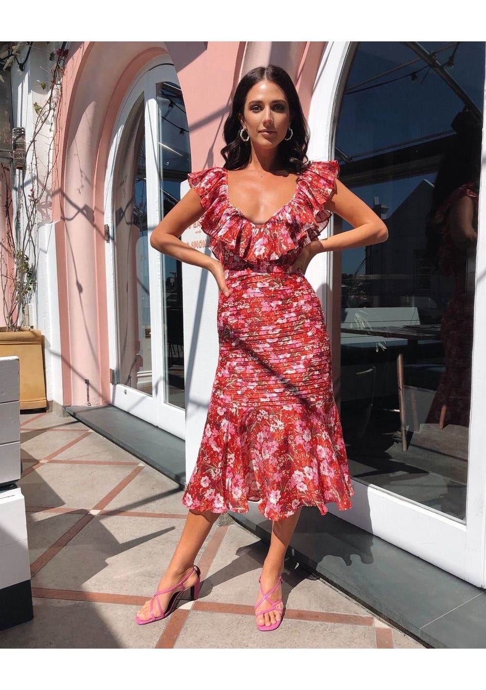 SIZE ADVICE: THIS STYLE RUNS SMALL- WE RECOMMENDED YOU SIZE UP IF YOU RUN IN BETWEEN SIZES. You will feel like you’re on cloud nine when you are wearing this beautiful midi dress. This V-neck dress is beautifully decked in frills and pin tucks, finished