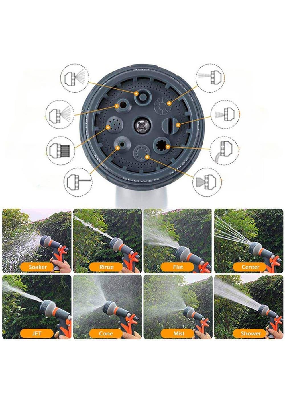 Product Description: Our garden hose nozzle has 8 different spray patterns, center, flat, cone, shower, mist, jet, soaker, rinse, eight modes can be switched at will, it is a multifunctional hose sprayer which can meet your various needs, perfect for watering your patio lawn, cleaning house, washing cars and showering dogs pets and so on.This hose nozzle heavy duty is made of durable material, Water hose nozzle use plastic high pressure multi-function water gun. Slide knob that allows you to adjust the water pressure to suit your needs, saving a lot of water.Multifunctional nozzle, non-slip handle, 8mm gold water outlet diameter, plastic buckle design for sustainable water spraying, newest thumb control design, just one finger to push open, the rear facing trigger model also feels much more natural in the hand and is easier to use.The ergonomic humane control designed; the soft rubber coating makes this sprayer very comfortable in your hand. When you have a beautiful garden, you will inevitably need our garden hose nozzles, which provides a portable tool for your garden.The size of the high-pressure hose nozzle is 135*190*50mm can be easily attached/detach from most of standard garden hoses, extended water hose.?Product Specification:Weight: 230gMaterial: ABS Size: 135 x 190 x 50 mmFunction: Water Spray Gun with 8 Adjustable Watering Patterns?Package Inclusion:1 x Water Spray Gun