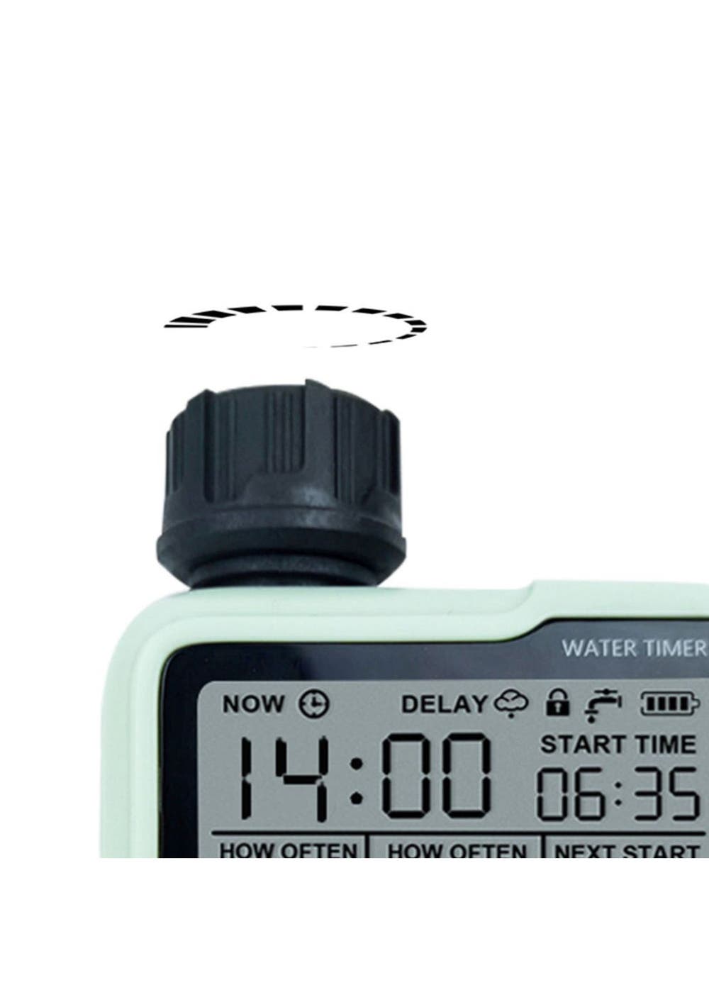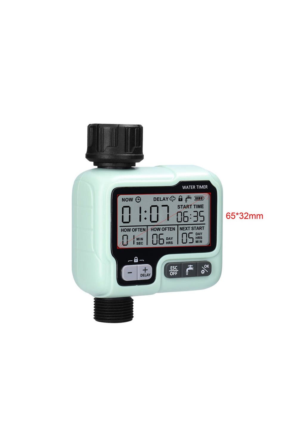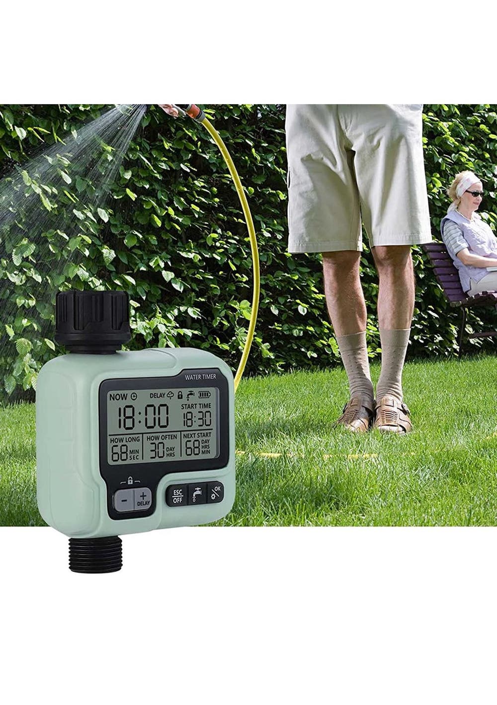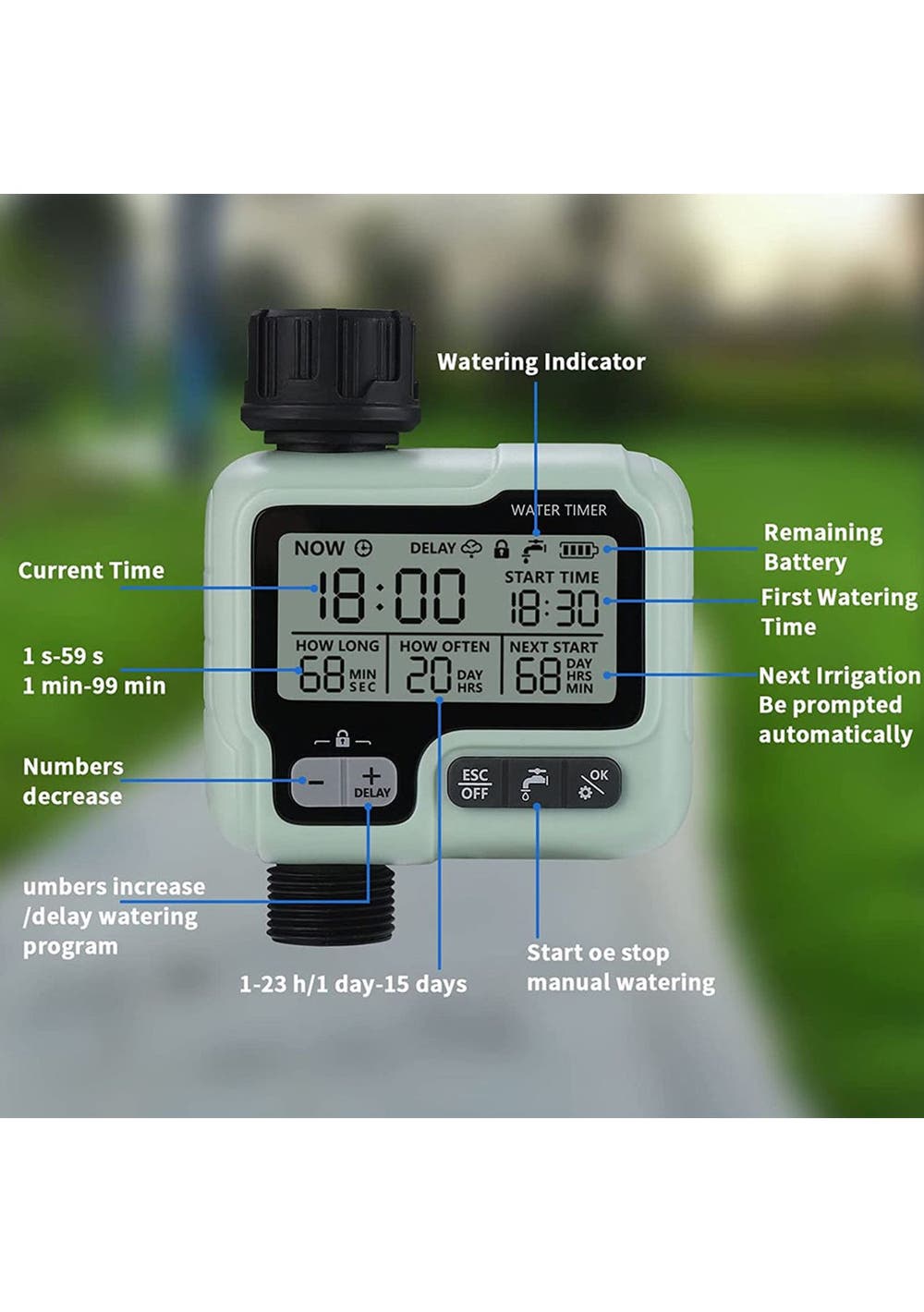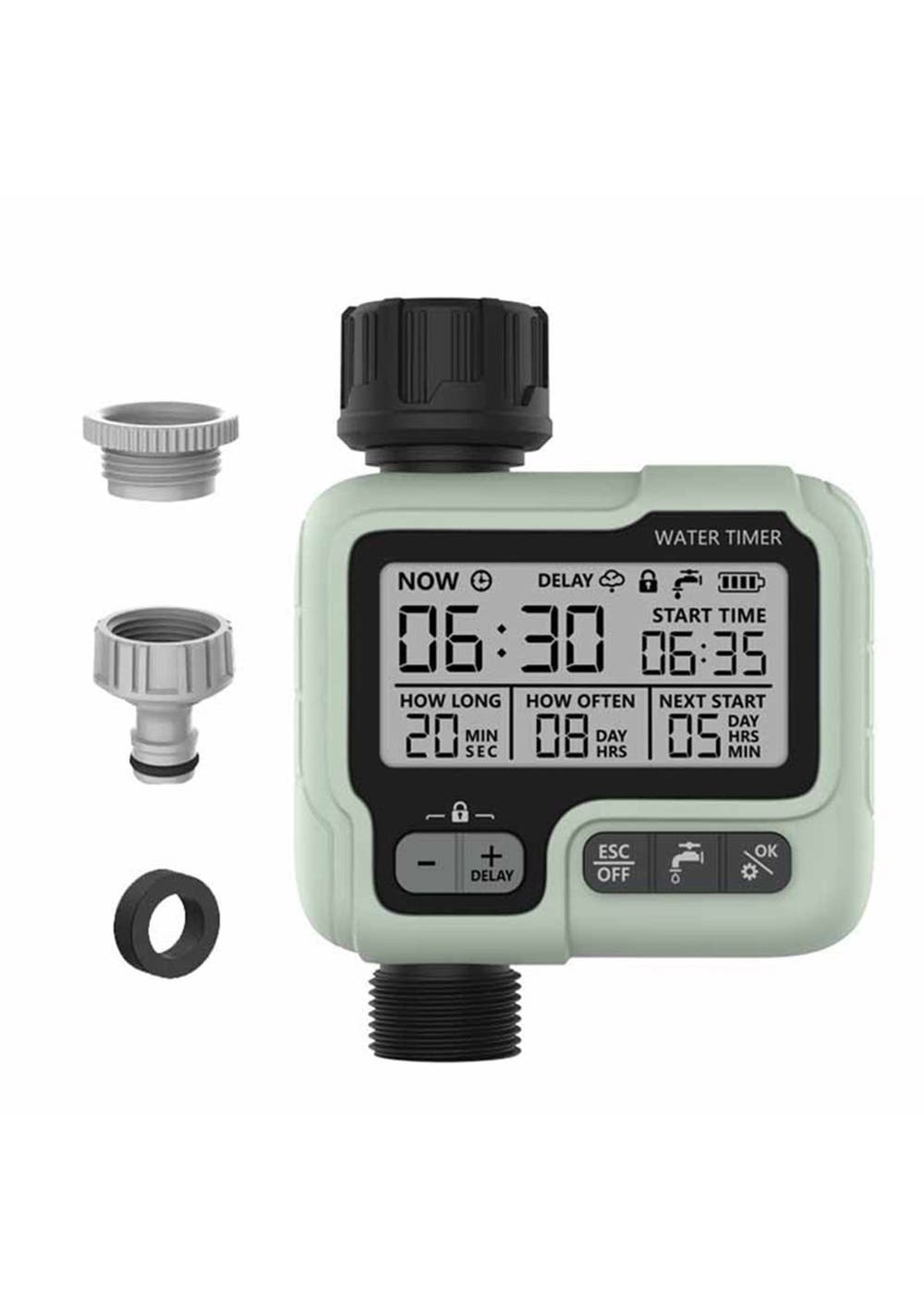 Product Description: This water timer has 3 modes, automatic/manual/rain delay. In automatic mode, the watering time can be from 1 minute to 3 hours and 59 minutes, and the watering frequency can be from 1 hour to 12 hours or from 1 day to 7 days. In manual mode, you can water flowers and plants from 1 minute to 3 hours 59 minutes. Rain delay mode, you can choose 12/24/48/72 hours, in line with your flexible watering schedule.It comes with a compact and elegant design, this hose timer has a low profile, is lightweight, and has easy portability, making it ideal for installation in tight spaces. The modern and sleek look won't interfere with the look and feel of your garden or greenhouse.To use, simply program the timer then your irrigation system will run automatically and follow the program. With the large, easy-to-read LCD screen and display, you can easily know your next watering, current time, and battery status. Long press the "OK" and "+" buttons to activate manual mode and rain delay mode.It comes in a single outlet with a solenoid valve, suitable for a 3/4 inch (about 1.9 cm) hose and faucet, 1-10 gallons/min flow rate, and can deal with water pressure of 8-120 PSI. It is powered by 2 AA1.5V batteries (not included) and can run for over 9 months.The hose timer has a water outlet and the water inlet can be matched with the faucet, hose, drip irrigation, and immersion hose. It is suitable for private garden owners, planters, gardeners, and breeders.?Product Specification:Color: GreenMaterial: ABS, PCSize: 17cm*12.5CM*5.5cmWeight: 380gFunction: Irrigation ControllerPower supply: 3V, 2 AA batteries (not included) Water pressure: 0 to 0.8 bar Can be connected to: 3/4'' (19mm) or 1/2'' (25mm).?Package Inclusion: 1 x Irrigation Timer