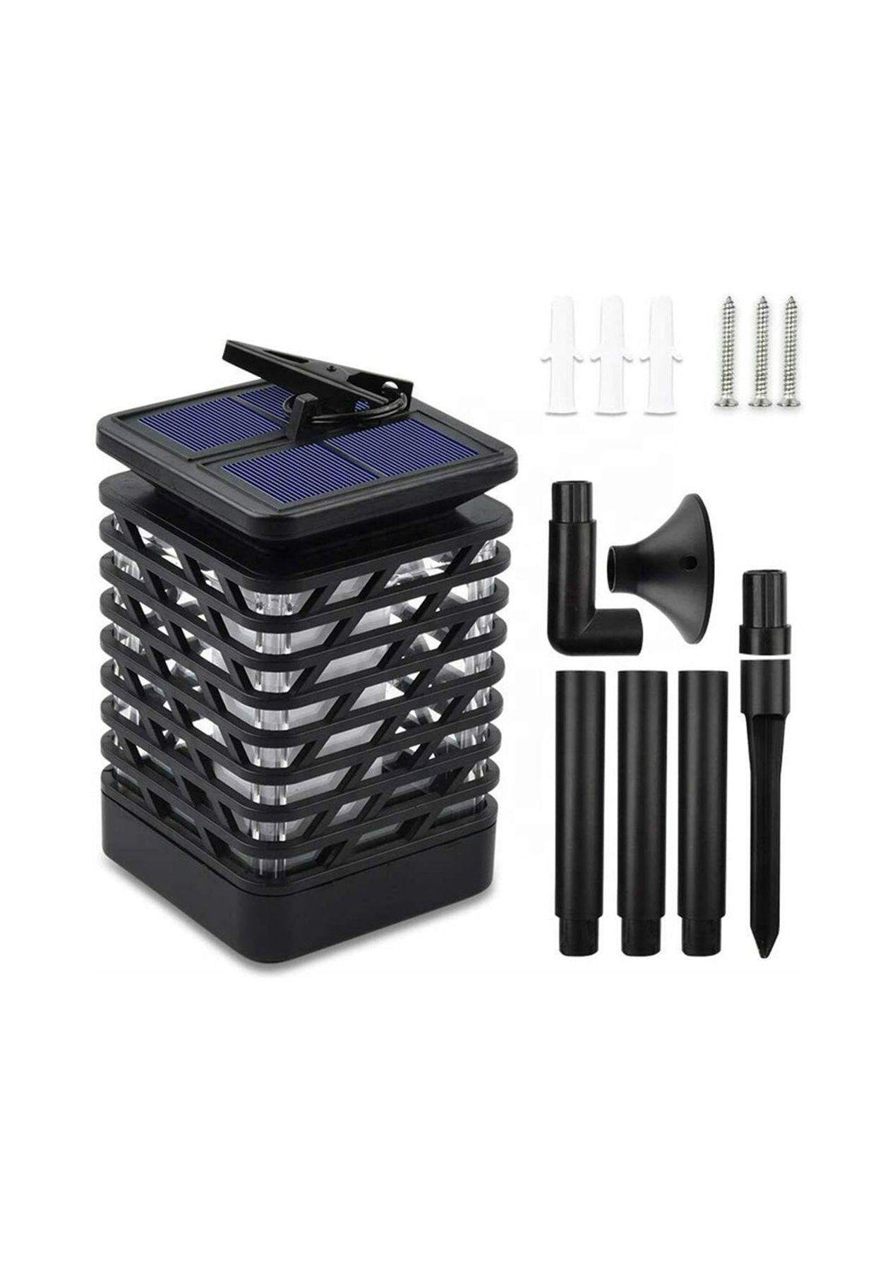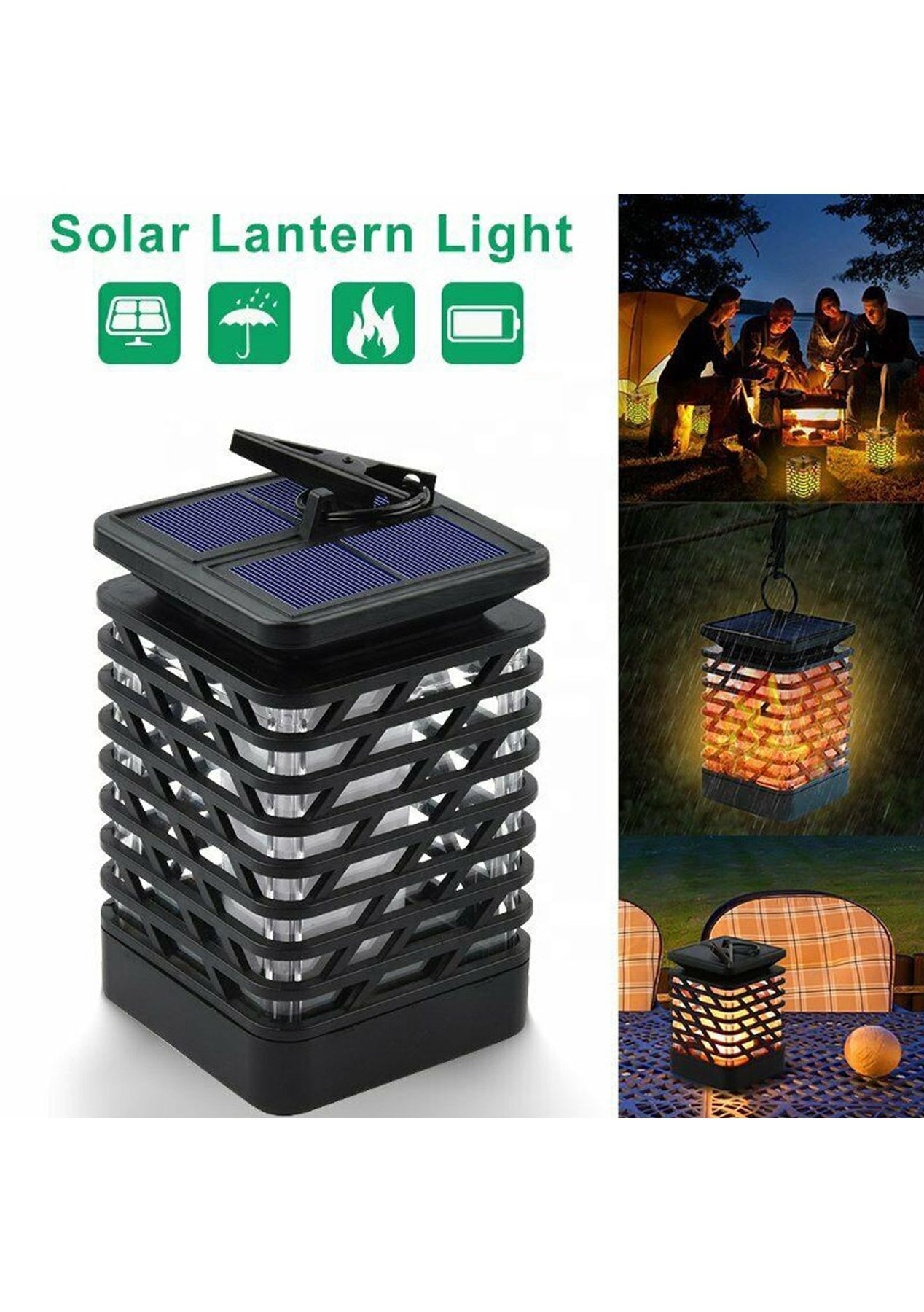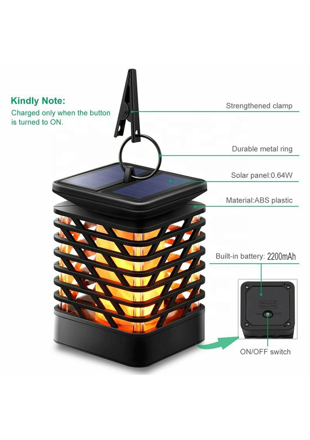 Product Description: This?solar lantern?is equipped with?upgraded?LED chips, 12 LEDs, It is like looking at a fire to watch the dancing flames, helps to create a fantastic and mesmerizing ambiance, Our solar hanging lantern lights are the best choice for?your garden, patio, yard, landscape, deck, umbrella, pathway, porch, lawn, tabletop, and more areas.It has an?IP65?waterproof and?durable design.?This solar lantern outdoor hanging is extremely durable and able to withstand all kinds of weather(rain, snow, fog ) all around the year.?An upgraded?ABS material is adopted to make the shell tougher and anti-aging.The outdoor solar lantern uses an?upgraded?solar?panel?with?18% efficiency. It has a 300mAh built-in battery. The solar flame?lights can light for more than?8-10 hours with only 8 hours of charging time.With 3 ways to install, you can hang, clamp or insert them into the ground. Every outdoor lantern light is coming with an extra stake, can insert into?your?outside patio, garden, yard, lawn. The metal clamp is powerful, decorative solar lanterns can be hung on umbrellas, tents, trees,?or decorate your events like any festival and outdoor party. It also has an?Auto Turn On/Off Function?which takes off from dust to dawn.?Note:1. When using this product for the first time, please charge it in the sun for several hours before using it.2.?When?the light flashes, it means that the power is very low. Please charge it immediately, otherwise, the product will stop working soon.3. The charging performance of solar panels depends on the light time and weather conditions. The stronger the sun and the longer the time, the shorter the time required for charging. On cloudy or rainy days, battery performance will decrease, which leads to shorter lighting times.4. Due to long-term outdoor use, solar panels will be covered by dust. In order to get better-charging performance, please clean up if necessary.?Product Specification:Color:?BlackMaterial:?ABSSize:?145*90*90mmTotal Length: 570mmWeight:?430gFunctions:?Solar Powered LampUsage Time:?8-10 hoursCharging Time:?8 hoursBattery Information:?3.7V 300mAProtection Level: IP65Working environment temperature: -5~60¬°√¶Installation: flat / ground plug / wall / hanging (including 5 sets of accessories)?Package Inclusion:1-pc Set1 * Lamp1 * Set Accessories1 * User Manual?2-pcs Set2 * Lamp2 * Set Accessories1 * User Manual