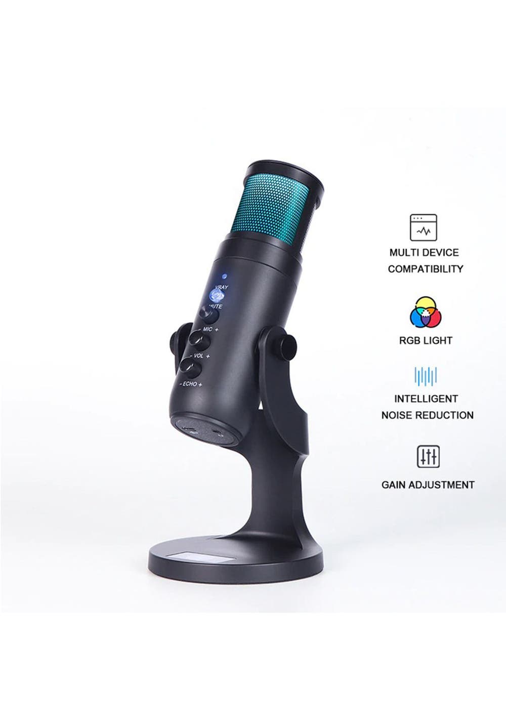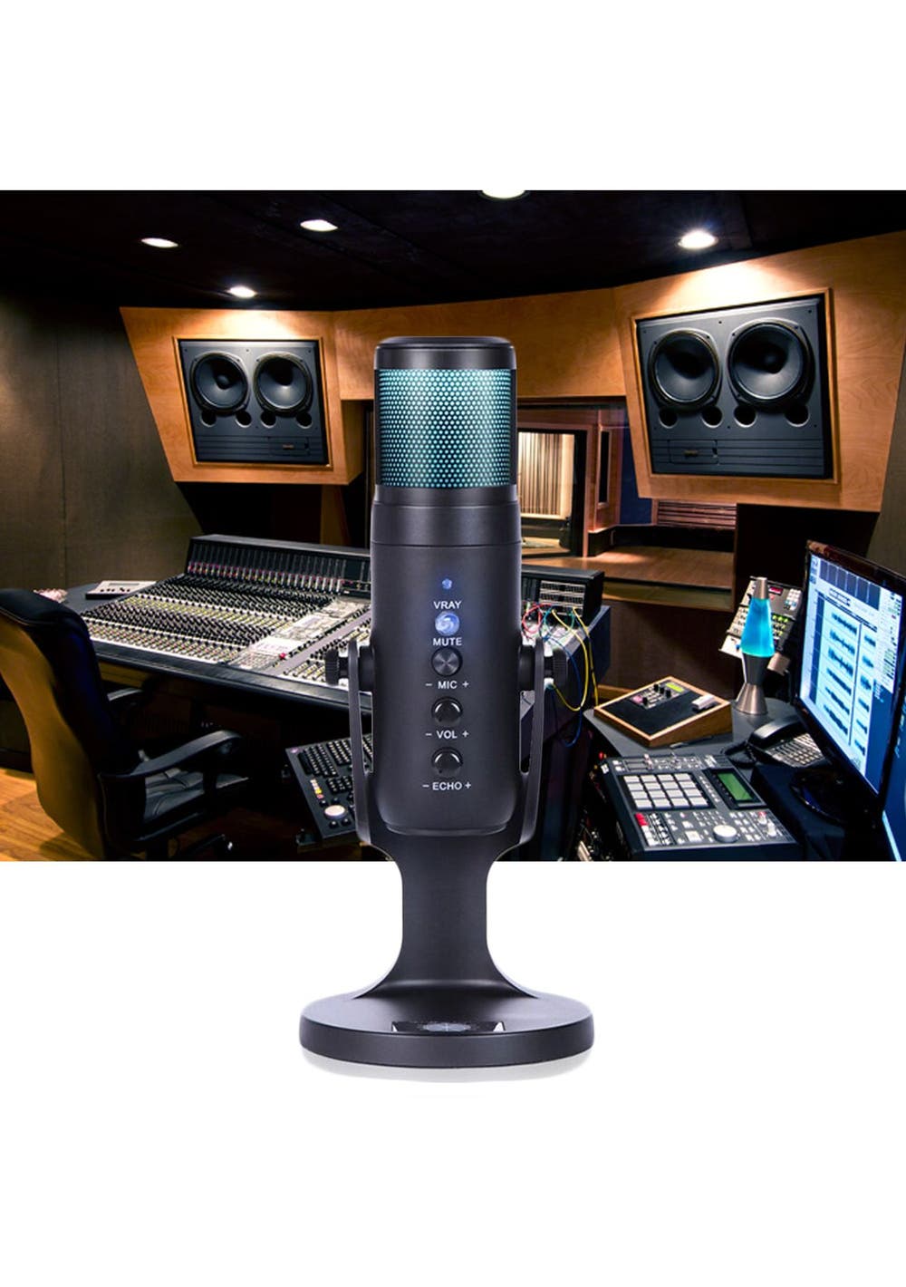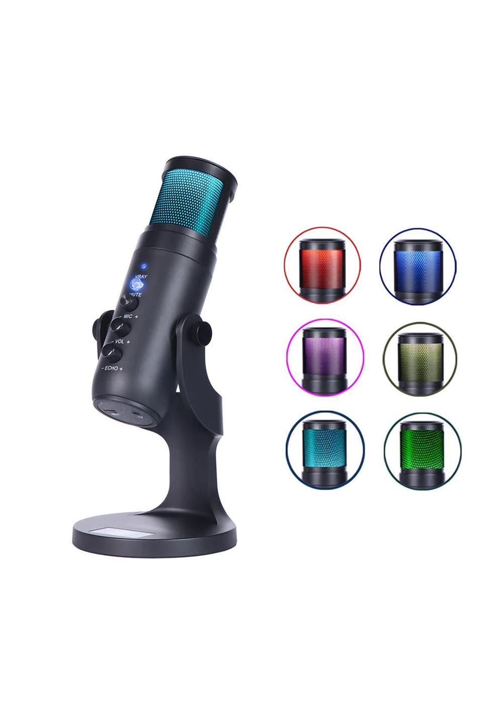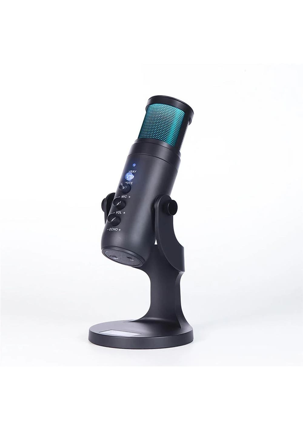 Product Description: Customize your?workstation?and bring it to life with?this Condenser Microphone s?colorful LED lighting effects.?It has a Cardioid Pickup Pattern and can be muted by toggling the handle, no need to turn off the power.Multi-device and compatibility: Condenser microphone can be used easily on PC, Android, or iPhone (requires plug conversion), laptop, PS4 and MAC, plug and play. Perfect for vocals, blogging, podcasting, gaming, interviews, field recordings, conference calls.Get Control Adjustments: Instant Mute and Microphone Gain are responsible for all levels of the recording and streaming process.Professional recording quality:?This microphone is equipped with an?upgraded version of the noise reduction chip that reduces the environmental sound during recording and makes your voice clearer.Universal shaft design: The microphone can be adjusted and rotated relative to the sound source to provide great flexibility and optimize sound quality.?Product Specification:Color:?BlackMaterial:?ABSLight Color: RGBSize:?24 * 4.8 cmWeight:?450gCord Length: 2mFunctions:?Condenser MicrophoneImpedance: 2.2k¦¸Operating temperature -10C to 45CMaximum sound pressure level: 125dB S.P.LVoltage characteristic: 3V-1.5V Sensitivity Variation less than 3dBS/N ratio: ¡Ü18DB A(IEC581-5£© More than 66dBRange : 1-10VFrequency response: 50-16000HZAllowable current: Max.0.5mASensitivity: 43¡À1dB?Package Inclusion:1 * Condenser Microphone1 * USB Power Plug1 * User Manual